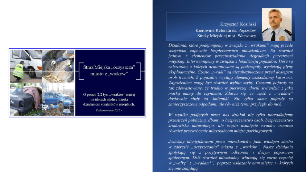 Krzysztof Kosiński Kierownik Referatu ds. Pojazdów Straży Miejskiej m.st. Warszawy Działania, które podejmujemy w związku z „wrakami” mają przede wszystkim zapewnić bezpieczeństwo mieszkańcom. Są również jednym z elementów przeciwdziałania degradacji przestrzeni miejskiej. Interweniujemy w związku z lokalizacją pojazdów, które są zniszczone, z których demontowane są podzespoły, wyciekają płyny eksploatacyjne. Często „wraki” są niezabezpieczone przed dostępem osób trzecich. Z pojazdów wystają elementy uszkodzonej karoserii. Zagrożeniem mogą być również wybite szyby. Czasami pojazdy są tak zdewastowane, że trudno w pierwszej chwili stwierdzić z jaką marką mamy do czynienia. Zdarza się, że część z „wraków” dosłownie służy za śmietniki. Nie tylko same pojazdy są zanieczyszczone odpadami, ale również teren przyległy do nich. W wyniku podjętych przez nas działań nie tylko porządkujemy przestrzeń publiczną, dbamy o bezpieczeństwo osób, bezpieczeństwo środowiska naturalnego, ale często usunięcie wraków oznacza również przywrócenie mieszkańcom miejsc parkingowych. Jesteśmy identyfikowani przez mieszkańców jako wiodąca służba w zakresie „oczyszczania" miasta z „wraków”. Nasze działania spotykają się z pozytywnym odbiorem i dużym poparciem społecznym. Dziś również mieszkańcy włączają się coraz częściej w „walkę” z „wrakami”, poprzez wskazanie nam miejsc, w których się one znajdują. WYBRANE INTERWENCJE Luksusowy wrak Kiedyś reprezentacyjny i ekskluzywny. W sierpniu, kiedy strażnicy prowadzili czynności, był zdewastowany, miał uszkodzone szyby, a na karoserii graffiti. Lincoln z ul. Płowieckiej trafił na parking strzeżony. Ostatnia trasa kampera Z Niemiec do Polski – to ostatnia daleka trasa kampera, który został zlokalizowany przy ul. Wąchockiej. Pojazd rok temu został sprowadzony do Polski bez opłat celnych. Kamper został usunięty na parking strzeżony. Spalony łup złodziei Odnaleziony przez strażników miejskich spalony wrak przy ul. Europejskiej okazał się kradzionym. Szukano go od września. Na miejsce zdarzenia strażnicy wezwali policję, która przejęła sprawę. Zdewastowana wołga Auto pozostawiono przy ul. Narbutta. Blokowało miejsce parkingowe innym pojazdom. Wołga była otwarta a wnętrze pojazdu zdewastowane. Samochód usunięto na parking strzeżony. Wrak jak kontener na śmieci Niezabezpieczonego i uszkodzonego fiata strażnicy miejscy zlokalizowali przy ul. Żwirki i Wigury. Wewnątrz i w pobliżu pojazdu znajdowały się odpady. Wrak został usunięty na parking strzeżony, a teren uporządkowany przez zarządcę. Zapomniany autobus Autobus porzucony na terenie Śródmieścia był nieużytkowany od co najmniej dwóch lat. Z rozmów z mieszkańcami wynikało, że w pojeździe czasami mieszkały osoby bezdomne. Pojazd usunięto na parking strzeżony. WYBRANE INTERWENCJE Lancia z odpadami Strażnicy miejscy zlokalizowali przy ul. Grójeckiej pojazd marki lancia, we wnętrzu którego znajdowały się śmieci. Z pojazdu zdemontowano podzespoły. Prawdopodobnie służył też osobom bezdomnym jako tymczasowe miejsce pobytu. Został usunięty na parking strzeżony. Holownik odjechał na holowniku Pojazd holowniczy, którego stan wskazywał, że jest nieużytkowany, został zlokalizowany na terenie Bielan. W trakcie prowadzonych czynności okazało się, że pojazd ostatnie badania techniczne miał wykonane trzy lata wcześniej. Holownik został usunięty na parking strzeżony przy użyciu ciężkiego pojazdu holowniczego. Porzucony ambulans Reklamowe wraki Kilkudziesięcioletni pojazd typu ambulans, prawdopodobnie sprowadzony z zagranicy, m.in. zajmował miejsca parkingowe i szpecił okolicę. Stan pojazdu wskazywał, że jest nieużywany. Samochód został usunięty na parking strzeżony. Mają zachęcić do sprzedaży auta, choć same straszą widokiem. Niesprawne technicznie, rdzewiejące, z namalowanymi na karoserii numerami telefonów – „wraki reklamowe” coraz częściej usuwano w ubiegłym roku w wyniku działań podjętych przez strażników miejskich. Nie tylko przyczepa kempingowa Na jednej z dróg na terenie Osiedla Stokłosy stwierdzono pozostawienie czterech wraków, w tym przyczepy kempingowej. Mieszkańcy zabiegali o ich usunięcie. W trakcie podjętych przez strażników czynności właściciele dwóch pojazdów usunęli auta na swój koszt, w dwóch kolejnych przypadkach strażnicy wydali dyspozycję usunięcia. Auta pokolizyjne Część wydawanych przez strażników miejskich dyspozycji usunięcia pojazdów dotyczyła aut pokolizyjnych pozostawionych na stołecznych drogach. Stan tych pojazdów mógł zagrażać bezpieczeństwu osób i środowisku naturalnemu.