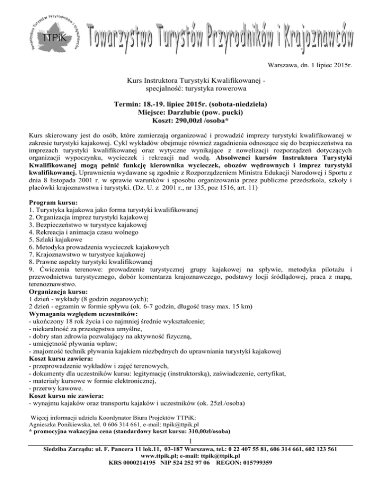 Warszawa, dn. 1 lipiec 2015r. Kurs Instruktora Turystyki Kwalifikowanej specjalność: turystyka rowerowa Termin: 18.-19. lipiec 2015r. (sobota-niedziela) Miejsce: Darzlubie (pow. pucki) Koszt: 290,00zł /osoba* Kurs skierowany jest do osób, które zamierzają organizować i prowadzić imprezy turystyki kwalifikowanej w zakresie turystyki kajakowej. Cykl wykładów obejmuje również zagadnienia odnoszące się do bezpieczeństwa na imprezach turystyki kwalifikowanej oraz wytyczne wynikające z nowelizacji rozporządzeń dotyczących organizacji wypoczynku, wycieczek i rekreacji nad wodą. Absolwenci kursów Instruktora Turystyki Kwalifikowanej mogą pełnić funkcję kierownika wycieczek, obozów wędrownych i imprez turystyki kwalifikowanej. Uprawnienia wydawane są zgodnie z Rozporządzeniem Ministra Edukacji Narodowej i Sportu z dnia 8 listopada 2001 r. w sprawie warunków i sposobu organizowania przez publiczne przedszkola, szkoły i placówki krajoznawstwa i turystyki. (Dz. U. z 2001 r., nr 135, poz 1516, art. 11) Program kursu: 1. Turystyka kajakowa jako forma turystyki kwalifikowanej 2. Organizacja imprez turystyki kajakowej 3. Bezpieczeństwo w turystyce kajakowej 4. Rekreacja i animacja czasu wolnego 5. Szlaki kajakowe 6. Metodyka prowadzenia wycieczek kajakowych 7. Krajoznawstwo w turystyce kajakowej 8. Prawne aspekty turystyki kwalifikowanej 9. Ćwiczenia terenowe: prowadzenie turystycznej grupy kajakowej na spływie, metodyka pilotażu i przewodnictwa turystycznego, dobór komentarza krajoznawczego, podstawy locji śródlądowej, praca z mapą, terenoznawstwo. Organizacja kursu: 1 dzień - wykłady (8 godzin zegarowych); 2 dzień - egzamin w formie spływu (ok. 6-7 godzin, długość trasy max. 15 km) Wymagania względem uczestników: - ukończony 18 rok życia i co najmniej średnie wykształcenie; - niekaralność za przestępstwa umyślne, - dobry stan zdrowia pozwalający na aktywność fizyczną, - umiejętność pływania wpław; - znajomość technik pływania kajakiem niezbędnych do uprawniania turystyki kajakowej Koszt kursu zawiera: - przeprowadzenie wykładów i zajęć terenowych, - dokumenty dla uczestników kursu: legitymację (instruktorską), zaświadczenie, certyfikat, - materiały kursowe w formie elektronicznej, - przerwy kawowe. Koszt kursu nie zawiera: - wynajmu kajaków oraz transportu kajaków i uczestników (ok. 25zł./osoba) Więcej informacji udziela Koordynator Biura Projektów TTPiK: Agnieszka Ponikiewska, tel. 0 606 314 661, e-mail: [email protected] * promocyjna wakacyjna cena (standardowy koszt kursu: 310,00zł/osoba) 1 Siedziba Zarządu: ul. F. Pancera 11 lok.11, 03-187 Warszawa, tel.: 0 22 407 55 81, 606 314 661, 602 123 561 www.ttpik.pl; e-mail: [email protected] KRS 0000214195 NIP 524 252 97 06 REGON: 015799359