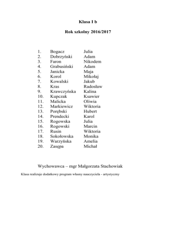 Klasa I b Rok szkolny 2016/2017 1. 2. 3. 4. 5. 6. 7. 8. 9. 10. 11. 12. 13. 14. 15. 16. 17. 18. 19. 20. Bogacz Dobrzyński Faron Grabusiński Janicka Korol Kowalski Kras Krawczyńska Kupczak Malicka Markiewicz Porębski Prendecki Rogowska Rogowski Rusin Sokołowska Warzyńska Zasępa Julia Adam Nikodem Adam Maja Mikołaj Jakub Radosław Kalina Ksawier Oliwia Wiktoria Hubert Karol Julia Marcin Wiktoria Monika Amelia Michał Wychowawca – mgr Małgorzata Stachowiak Klasa realizuje dodatkowy program własny nauczyciela - artystyczny
