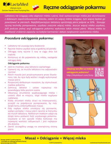 Ułatwia życie Zestaw Hands Free Pumping Bra Ręczne odciąganie pokarmu Laktatory nie ściągają całej objętości mleka z piersi. Ilość wytwarzanego mleka jest skorelowana z dobowym zapotrzebowaniem dziecka, zatem im więcej mleka ściągasz, tym więcej będzie go powstawać w piersiach. Najefektywniejsze laktatory opróżniają piersi jedynie w 50%. Stosując ręczną technikę pompowania, uzyskasz znacznie więcej mleka. Jeszcze więcej mleka uzyskasz, jeśli podczas jednej sesji odciągania pokarmu wykonasz także masaż piersi. Więcej mleka to możliwość zrobienia zapasów na kolejne karmienia i dalsze zwiększenie wydzielania mleka. Procedura odciągania pokarmu: Laktatory nie usuwają siary skutecznie Ręcznie można uzyskać siarę w godzinę od porodu Odciągaj siarę ręcznie 5 razy w ciągu dnia lub częściej Kontynuuj aż do pojawienia się mleka, następnie odciągaj dalej Odciąganie pokarmu Jeśli to możliwe, użyj laktatora szpitalnego Upewnij się, że muszla laktatora ma odpowiedni rozmiar Niech muszla jest przytrzymywana przez biustonosz, tak, by ręce były wolne i mogły wykonywać masaż piersi Rozpocznij delikatnym masażem, by stymulować napływ pokarmu Zamocuj laktator i ustaw najwyższy nie powodujący bólu poziom ssania Obserwuj strumienie wypływającego mleka i umieść dłoń w miejscu, skąd mleko wypływa najłatwiej Kiedy strumień mleka straci na intensywności, przejdź na pojedyncze pompowanie, by móc dzięki temu zintensyfikować masaż Gdy napływ mleka zmniejszy się ponownie, wyłącz pompkę i masuj pierś ręcznie w kierunku do muszli laktatora. Niektórym matkom udaje się dzięki temu podwoić ilość uzyskanego pokarmu. Uzyskane w ten sposób mleko końcowe ma najwięcej wartości odżywczych i jest najlepsze dla dziecka. Zwróć szczególną uwagę na zewnętrzną stronę piersi Obejrzyj ten film w trakcie odciągania pokarmu! Masaż + Odciąganie = Więcej mleka Pomaga spełnić 5 punkt programu ”10 Kroków do Udanego Karmienia Piersią”, opracowanego przez WHO. © 2014 Lactamed Inc. [email protected]