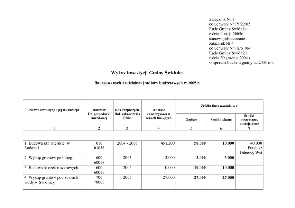 Załącznik Nr 1 do uchwały Nr IV/22/05 Rady Gminy Świdnica z dnia 4 maja 2005r. stanowi jednocześnie załącznik Nr 4 do uchwały Nr IX/61/04 Rady Gminy Świdnica z dnia 30 grudnia 2004 r. w sprawie budŜetu gminy na 2005 rok Wykaz inwestycji Gminy Świdnica finansowanych z udziałem środków budŜetowych w 2005 r. Źródła finansowania w zł Inwestor Dz. gospodarki narodowej Rok rozpoczęcia Rok zakończenia Efekt Wartość kosztorysowa w cenach bieŜących Ogółem Środki własne Środki otrzymane, dotacje, inne 2 3 4 5 6 7 1. Budowa sali wiejskiej w Radomii 010 01036 2004 - 2006 2. Wykup gruntów pod drogi 600 60016 600 60016 700 70005 Nazwa inwestycji i jej lokalizacja 1 3. Budowa ścieŜek rowerowych 4. Wykup gruntów pod zbiornik wody w Świdnicy 451.200 50.000 10.000 2005 3.000 3.000 3.000 2005 10.000 10.000 10.000 2005 27.000 27.000 27.000 40.000 Fundusz Odnowy Wsi 5. Wykonanie analizy finansowoekonomicznej projektu powiększenia zbiornika małej retencji 6. Zagospodarowanie terenu cmentarza w Świdnicy 700 70005 2005 3.000 3.000 3.000 710 71035 2005 20.000 20.000 20.000 7. Zakup agregatu chłodniczego 710 71035 750 75023 750 75023 754 75412 801 80101 801 80101 2005 19.000 19.000 19.000 2005 20.000 20.000 20.000 2005 68.500 68.500 68.500 2005 100.000 100.000 100.000 2005 8.500 8.500 8.500 2005 15.000 15.000 15.000 801 80110 2005 1.040.000 1.039.942 739.942 801 80114 852 85219 852 85219 900 90001 2005 4.500 4.500 4.500 2005 5.000 5.000 5.000 2005 12.200 12.200 12.200 4.698.600 2.509.800 627.450 8. Zakup komputerów i kserokopiarki 9. Adaptacja strychu UG na pomieszczenia biurowe 10. Dofinansowanie zakupu samochodu straŜackiego 11. Wykonanie przyłączy gazowych – obiekty oświatowe 12. Zakup sprzętu komputerowego współdziałającego – komputer przenośny, projektor, głośnik, ekran – Zespół Szkół w Świdnicy 13. Rozbudowa szkoły w Świdnicy pod potrzeby gimnazjum 14. Zakup komputera – ZEASz 15. Zakup kserokopiarki – GOPS 16. ZałoŜenie systemu alarmowego GOPS 17. Budowa oczyszczalni ścieków i kanalizacji sanitarnej dla m. Świdnica 2001 - 2006 - 300.000 Kontrakt Woj. MENiS 1.882.350 Fundusze Strukturalne 18. Uporządkowanie gospodarki wodno – ściekowej miasta Zielona Góra oraz gmin Zielona Góra i Świdnica ( Wilkanowo – sieć wodno –kanalizacyjna) 19. Modernizacja i rozbudowa oświetlenia ulicznego 20. Rozbudowa sali wiejskiej w Grabowcu 21. Plan zagospodarowania terenu pod budowę pola golfowego OGÓŁEM 900 90001 2005 - 2006 2.050.000 350.000 350.000 900 90015 921 92109 926 92601 2005 25.400 25.400 25.400 2005 30.000 30.000 30.000 2005 10.000 10.000 10.000 8.620.900 4.330.842 2.108.492 Fundusz Spójności Beneficjentem jest Miasto Zielona Góra 2.222.350