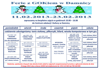 zapraszamy na bezpłatne zajęcia w godzinach 10.00 – 16.00 do Centrum edukacji i Kultury w Damnicy poniedziałek wtorek środa czwartek piątek sobota codziennie udostępniamy: tenis stołowy, piłkarzyki, bilard, wioska komputerowa w tym gry godz. 10.00 – 13.00 godz. 10.00 – 11.30 godz. 10.00 – 13.00 BAJKOWE PONIEDZIAŁKI kino dla najmłodszych TURNIEJ TENISA STOŁOWEGO ZAJĘCIA PLASTYCZNE godz. 13.00-13.30 dla osób uczestniczących w zajęciach zorganizowanych POCZĘSTUNEK godz. 11.30 – 13.00 godz. 13.00-13.30 dla osób uczestniczących w zajęciach zorganizowanych POCZĘSTUNEK godz. 13.00-13.30 dla osób uczestniczących w zajęciach zorganizowanych POCZĘSTUNEK WARSZTATY MUZYCZNE godz. 13.00 – 15.00 godz. 13.00 – 16.00 gry i zabawy ruchowe WYCIECZKA aquapark + bowling opłata 20zł/osoba godz. 12.00 – 13.00 WARSZTATY TEATRALNE godz. 15.00 – 16.00 ZAJĘCIA REKREACYJNE ZIMOWY RAJD PIESZY/ ew. KULIG śladami zwierząt godz. 10.00 – 13.00 ZAJĘCIA MUZYCZNE Konkurs Karaoke godz. 13.00-13.30 dla osób uczestniczących w zajęciach zorganizowanych POCZĘSTUNEK godz. 13.30 – 15.00 KINO Z HUMOREM godz. 13.30 – 16.00 zajęcia sportowe ROZGRYWKI BILARDOWE DWA TERMINY 14,21 luty 2013 znane i mniej znane komedie tenis stołowy, bilard wioska komputerowa piłkarzyki tenis stołowy, bilard wioska komputerowa piłkarzyki tenis stołowy, bilard wioska komputerowa piłkarzyki godz. 15.00 – 16.00 ZAJĘCIA TANECZNE turniej „step mania” tenis stołowy, bilard wioska komputerowa piłkarzyki Rodziców, opiekunów chcących aby dziecko brało udział w zajęciach zorganizowanych prosimy o zgłoszenie dziecka do dnia 8 lutego 2013 roku w biurze GOKiS lub telefonicznie tel. 59 8 113 922 lub 792 618 995
