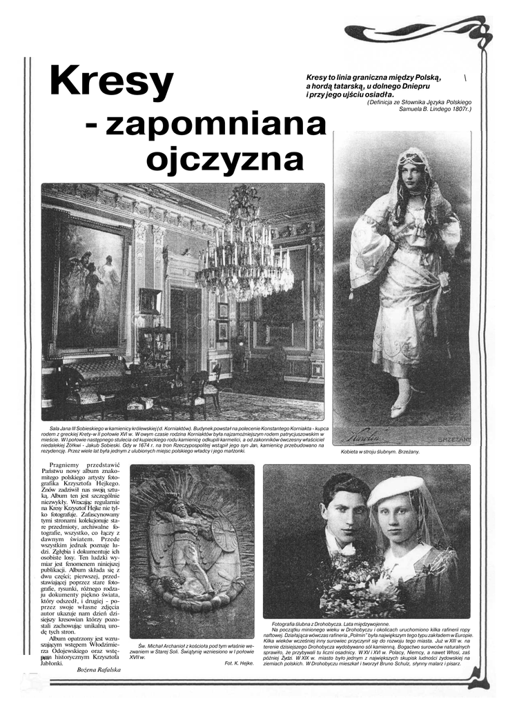 Kresy Kresy to linia graniczna między Polską, a hordą tatarską, u dolnego Dniepru i przy jego ujściu osiadła. - zapomniana ojczyzna Sala Jana III Sobieskiego w kamienicy królewskiej (d. Korniaktów). Budynek powstał na polecenie Konstantego Korniakta - kupca rodem z greckiej Krety-w II połowie XVI w. W owym czasie rodzina Korniaktów była najzamożniejszym rodem patrycjuszowskim w mieście. W I połowie następnego stulecia od kupieckiego rodu kamienicę odkupili karmelici, a od zakonników ówczesny właściciel niedalekiej Żółkwi - Jakub Sobieski. Gdy w 1674 r. na tron Rzeczypospolitej wstąpił jego syn Jan, kamienicę przebudowano na rezydencję. Przez wiele lat była jednym z ulubionych miejsc polskiego władcy i jego małżonki. Pragniemy przedstawić Państwu nowy album znakomitego polskiego artysty fotografika Krzysztofa Hejkego. Znów zadziwił nas swoją sztuką. Album ten jest szczególnie niezwykły. Wracając regularnie na Kresy Krzysztof Hejke nie tylko fotografuje. Zafascynowany tymi stronami kolekcjonuje stare przedmioty, archiwalne fotografie, wszystko, co łączy z dawnym światem. Przede wszystkim jednak poznaje ludzi. Zgłębia i dokumentuje ich osobiste losy. Ten ludzki wymiar jest fenomenem niniejszej publikacji. Album składa się z dwu części; pierwszej, przedstawiającej poprzez stare fotografie, rysunki, różnego rodzaju dokumenty piękno świata, który odszedł, i drugiej - poprzez swoje własne zdjęcia autor ukazuje nam dzień dzisiejszy kresowian którzy pozostali zachowując unikalną urodę tych stron. Album opatrzony jest wzruszającym wstępem Włodzimierza Odojewskiego oraz wstępem historycznym Krzysztofa peir Jabłonki. Bożena Rafalska Św. Michał Archanioł z kościoła pod tym właśnie wezwaniem w Starej Soli. Świątynię wzniesiono w I połowie XVII w. Fot. K. Hejke. \ (Definicja ze Słownika Języka Polskiego Samuela B. Lindego 1807r.) Kobieta w stroju ślubnym. Brzeżany. Fotografia ślubna z Drohobycza. Lata międzywojenne. Na początku minionego wieku w Drohobyczu i okolicach uruchomiono kilka rafinerii ropy naftowej. Działająca wówczas rafineria „Polmin" była największym tego typu zakładem w Europie. Kilka wieków wcześniej inny surowiec przyczynił się do rozwoju tego miasta. Już w XIII w. na terenie dzisiejszego Drohobycza wydobywano sól kamienną. Bogactwo surowców naturalnych sprawiło, że przybywali tu liczni osadnicy. W XV i XVI w. Polacy, Niemcy, a nawet Włosi, zaś później Żydzi. W XIX w. miasto było jednym z największych skupisk ludności żydowskiej na ziemiach polskich. W Drohobyczu mieszkał i tworzył Bruno Schulz, słynny malarz i pisarz.