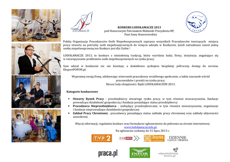 KONKURS LODOŁAMACZE 2013 pod Honorowym Patronatem Małżonki Prezydenta RP, Pani Anny Komorowskiej Polska Organizacja Pracodawców Osób Niepełnosprawnych zaprasza wszystkich Pracodawców tworzących miejsca pracy otwarte na potrzeby osób niepełnosprawnych do wzięcia udziału w Konkursie. Jeżeli zatrudniasz nawet jedną osobę niepełnosprawną ten Konkurs jest dla Ciebie ! LODOŁAMACZE 2013, to konkurs z ośmioletnią tradycją, który wyróżnia ludzi, firmy, instytucje, angażujące się w rozwiązywanie problemów osób niepełnosprawnych na rynku pracy. Sam udział w konkursie nic nie kosztuje, a dodatkowo zyskujesz bezpłatny półroczny dostęp do serwisu EkspertPOPON.pl. Wypromuj swoją firmę, zdobywając wizerunek pracodawcy wrażliwego społecznie, a także szacunek wśród pracowników i prestiż na rynku pracy. Skrusz lody obojętności. Bądź LODOŁAMACZEM 2013. Kategorie konkursowe • • • Otwarty Rynek Pracy - przedsiębiorcy otwartego rynku pracy, w tym również stowarzyszenia, fundacje prowadzące działalność gospodarczą i fundacje posiadające status przedsiębiorcy Pracodawca Nieprzedsiębiorca - niebędący przedsiębiorcami, w tym również stowarzyszenia, organizacje i fundacje nieprowadzące działalności gospodarczej Zakład Pracy Chronionej - pracodawcy posiadający status zakładu pracy chronionej oraz zakłady aktywności zawodowej Więcej informacji, regulamin konkurs oraz formularze zgłoszeniowe do pobrania na stronie internetowej www.lodolamacze.info.pl. Na zgłoszenia czekamy do 31 lipca 2013 r.