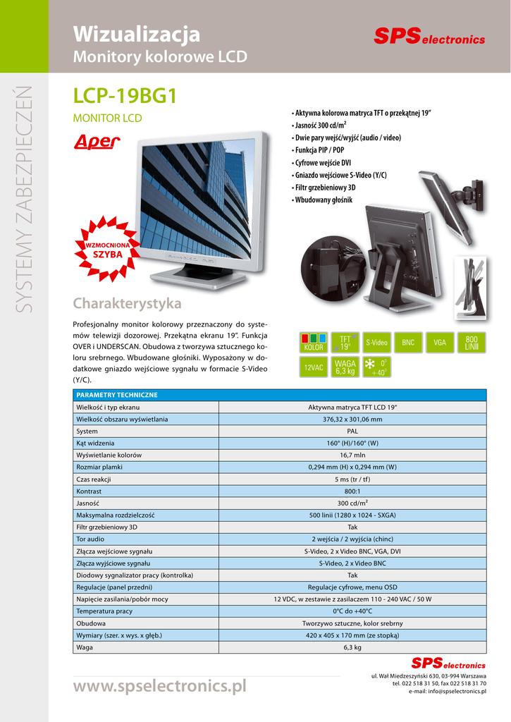 Wizualizacja SYSTEMY ZABEZPIECZEŃ Monitory kolorowe LCD LCP-19BG1 MONITOR LCD • Aktywna kolorowa matryca TFT o przekątnej 19” • Jasność 300 cd/m² • Dwie pary wejść/wyjść (audio / video) • Funkcja PIP / POP • Cyfrowe wejście DVI • Gniazdo wejściowe S-Video (Y/C) • Filtr grzebieniowy 3D • Wbudowany głośnik Charakterystyka Profesjonalny monitor kolorowy przeznaczony do systemów telewizji dozorowej. Przekątna ekranu 19”. Funkcja OVER i UNDERSCAN. Obudowa z tworzywa sztucznego koloru srebrnego. Wbudowane głośniki. Wyposażony w dodatkowe gniazdo wejściowe sygnału w formacie S-Video (Y/C). PARAMETRY TECHNICZNE Wielkość i typ ekranu Wielkość obszaru wyświetlania System Kąt widzenia Wyświetlanie kolorów Rozmiar plamki Czas reakcji Kontrast Jasność Maksymalna rozdzielczość Filtr grzebieniowy 3D Tor audio Aktywna matryca TFT LCD 19“ 376,32 x 301,06 mm PAL 160° (H)/160° (W) 16,7 mln 0,294 mm (H) x 0,294 mm (W) 5 ms (tr / tf ) 800:1 300 cd/m² 500 linii (1280 x 1024 - SXGA) Tak 2 wejścia / 2 wyjścia (chinc) Złącza wejściowe sygnału S-Video, 2 x Video BNC, VGA, DVI Złącza wyjściowe sygnału S-Video, 2 x Video BNC Diodowy sygnalizator pracy (kontrolka) Regulacje (panel przedni) Napięcie zasilania/pobór mocy Temperatura pracy Obudowa Wymiary (szer. x wys. x głęb.) Waga www.spselectronics.pl Tak Regulacje cyfrowe, menu OSD 12 VDC, w zestawie z zasilaczem 110 - 240 VAC / 50 W 0°C do +40°C Tworzywo sztuczne, kolor srebrny 420 x 405 x 170 mm (ze stopką) 6,3 kg ul. Wał Miedzeszyński 630, 03-994 Warszawa tel. 022 518 31 50, fax 022 518 31 70 e-mail: [email protected]