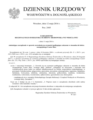 DZIENNIK URZĘDOWY WOJEWÓDZTWA DOLNOŚLĄSKIEGO Wrocław, dnia 12 maja 2016 r. Elektronicznie podpisany przez: Milena Pigdanowicz-Fidera; DUW we Wrocławiu Poz. 2445 Data: 2016-05-12 13:42:32 ZARZĄDZENIE REGIONALNEGO DYREKTORA OCHRONY ŚRODOWISKA WE WROCŁAWIU z dnia 11 maja 2016 r. zmieniające zarządzenie w sprawie zezwolenia na czynności podlegające zakazom w stosunku do bobra europejskiego Castor fiber Na podstawie art. 56 a ust. 1 ustawy z dnia 16 kwietnia 2004 r. o ochronie przyrody (Dz. U. z 2015 r. poz. 1651,1688 oraz z 2016 r. poz. 422) zarządza się, co następuje: § 1. W zarządzeniu Nr 23 Regionalnego Dyrektora Ochrony Środowiska we Wrocławiu z dnia 26 listopada 2013 r. w sprawie zezwolenia na czynności podlegające zakazom w stosunku do bobra europejskiego Castor fiber (Dz. Urz. Woj. Doln. z 2013 r. poz. 6099) wprowadza się następujące zmiany: 1) w § 1: a) ust. 1 otrzymuje brzmienie: „1. Zezwala się na czynności podlegające zakazom w stosunku do bobra europejskiego Castor fiber, zwanego dalej „bobrem”, polegające na niszczeniu i usuwaniu tam wybudowanych przez bobry na ciekach zlokalizowanych na terenie województwa dolnośląskiego, w powiatach: bolesławieckim, głogowskim, górowskim, jaworskim, jeleniogórskim, legnickim, lubańskim, lubińskim, lwóweckim, milickim, oleśnickim, oławskim, polkowickim, średzkim, świdnickim, trzebnickim, wołowskim, wrocławskim, ząbkowickim, zgorzeleckim oraz złotoryjskim - znajdujących się w zarządzie Dolnośląskiego Zarządu Melioracji i Urządzeń Wodnych we Wrocławiu, zwanego dalej „Zarządem”.”, b) po ust. 2 dodaje się ust. 3 w brzmieniu: „3. Poprzez użyte w zarządzeniu określenie cieki należy rozumieć: cieki naturalne i kanały.”, 2) załącznik Nr 1 do zarządzenia otrzymuje brzmienie określone w załączniku do niniejszego zarządzenia. § 2. Zarządzenie wchodzi w życie po upływie 14 dni od dnia ogłoszenia. Regionalny Dyrektor Ochrony Środowiska we Wrocławiu: M. Jęcz Dziennik Urzędowy Województwa Dolnośląskiego –2– Poz. 2445 Załącznik nr 1 do zarządzenia Regionalnego Dyrektora Ochrony Środowiska we Wrocławiu z dnia 11 maja 2016 r. Wykaz cieków, na których zezwala się na niszczenie tam. L.p. 1 2 3 4 5 6 7 8 9 10 11 12 13 14 15 16 17 18 19 20 21 22 23 24 25 26 27 28 29 30 31 32 33 34 35 36 37 38 Powiat bolesławiecki głogowski Nazwa cieku wodnego Bobrzyca Uwagi cały ciek Czarna Woda cały ciek Czerna Wielka cały ciek Czerwieniec cały ciek Dębia cały ciek Główna cały ciek Gościszowski Potok cały ciek Iwnica cały ciek Kanał Ciek "Y" cały ciek Kanał Krzywiec cały ciek Kanał Ulgi w Modle cały ciek Kanał Ulgi w Patoce cały ciek Kraszówka cały ciek Mierewiński Potok cały ciek Nidzica cały ciek Osika cały ciek Ośnica cały ciek Polanka cały ciek R-A cały ciek R-S cały ciek Siekierna cały ciek Śrem cały ciek Stróżka cały ciek Świnie Błoto cały ciek Wykrotnica cały ciek Złoty Potok cały ciek Żeliszowski Potok cały ciek Bielnik cały ciek Bogomicki cały ciek Borkowski cały ciek Borownica cały ciek Brusina cały ciek Dalkówka cały ciek Dobrzejówka cały ciek Grodzki cały ciek Kłębanówka cały ciek Moczar cały ciek Południowy cały ciek Dziennik Urzędowy Województwa Dolnośląskiego 39 40 41 42 43 44 45 46 47 48 49 50 51 52 53 54 55 56 57 58 59 60 61 62 63 64 65 66 67 68 69 70 71 72 73 74 75 76 77 78 79 80 81 82 83 84 85 górowski jaworski –3– Poz. 2445 Rów Krzycki cały ciek Rudna cały ciek Serbska Struga cały ciek Średni Potok cały ciek Starka cały ciek Środkowy cały ciek Wschodni cały ciek Barycz cały ciek Barycki Rów cały ciek Bełcz cały ciek Chlastówka cały ciek Ciek Uszczonowski cały ciek Cieszyn cały ciek Glinka cały ciek Głogowiec cały ciek Gola cały ciek Górowianka cały ciek Grobelka cały ciek Kalinówka cały ciek Ligota cały ciek Luboszyca cały ciek Łacha cały ciek Łęczyca cały ciek Mały cały ciek Młyniec cały ciek Oda cały ciek Ostrowita cały ciek Rów Śląski cały ciek Rzęśnik cały ciek Samica cały ciek Samiec cały ciek Sławęcice cały ciek Stara Wiewiernica cały ciek Strumienna cały ciek Sułowski Potok cały ciek Świernia cały ciek Świernia II cały ciek Tynica cały ciek Uliczna cały ciek Wąsowska Struga cały ciek Wiewiernica cały ciek Źródliska cały ciek Cicha Woda cały ciek Czerniec cały ciek Jania cały ciek Leniwy Potok cały ciek Modzel cały ciek Dziennik Urzędowy Województwa Dolnośląskiego 86 87 88 89 90 91 92 93 94 95 96 97 98 99 100 101 102 103 104 105 106 107 108 109 110 111 112 113 114 115 116 117 118 119 120 121 122 123 124 125 126 127 128 129 130 131 jeleniogórski legnicki lubański –4– Poz. 2445 Wierzbiak cały ciek Łupia cały ciek Szumiąca cały ciek Błotnia cały ciek Brenna cały ciek Brochotka cały ciek Brochotka II cały ciek Chłodnik cały ciek Cicha Woda cały ciek Ciekąca cały ciek Czarna Woda cały ciek Dłużeń cały ciek Grzymaliński cały ciek Irygacyjny cały ciek Jagodziniec cały ciek Kaczorek cały ciek Kanał D cały ciek Kanał E cały ciek Kanał F cały ciek Kanał Boberek cały ciek Karkoszka cały ciek Lubiatówka cały ciek Ławisko cały ciek Młokita cały ciek Nidzica cały ciek Niecka I cały ciek Niecka II cały ciek Osetnicki cały ciek Prochowicki cały ciek Rzeszotarski cały ciek Skora cały ciek Środka cały ciek Świnie Błoto cały ciek Zbójno cały ciek Bród cały ciek Czerwiec cały ciek Gozdnica cały ciek Lipniak cały ciek Luciąża cały ciek Łazek cały ciek Olszówka cały ciek R-H cały ciek R-H-4 cały ciek R-S cały ciek R-Y cały ciek Siekierna cały ciek Dziennik Urzędowy Województwa Dolnośląskiego 132 133 134 135 136 137 138 139 140 141 142 143 144 145 146 147 148 149 150 151 152 153 154 155 156 157 158 159 160 161 162 163 lubiński –5– Poz. 2445 Słotna cały ciek Stróżka cały ciek Wierzbowiec cały ciek Włosienica cały ciek Wilka cały