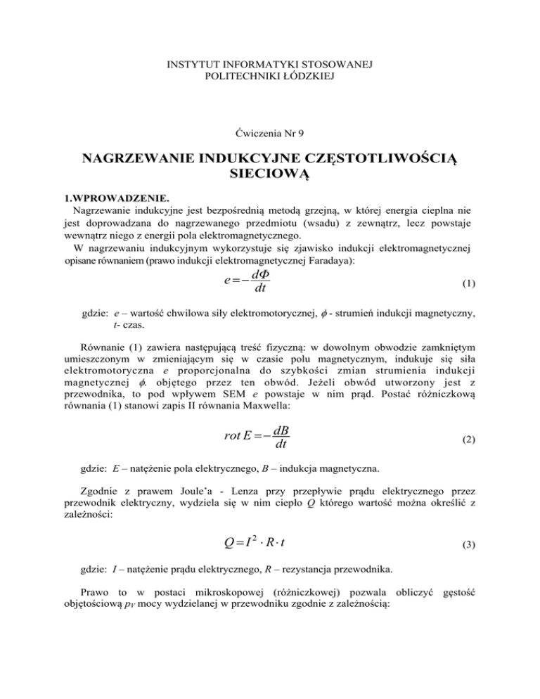 INSTYTUT INFORMATYKI STOSOWANEJ POLITECHNIKI ŁÓDZKIEJ Ćwiczenia Nr 9 NAGRZEWANIE INDUKCYJNE CZĘSTOTLIWOŚCIĄ SIECIOWĄ 1.WPROWADZENIE. Nagrzewanie indukcyjne jest bezpośrednią metodą grzejną, w której energia cieplna nie jest doprowadzana do nagrzewanego przedmiotu (wsadu) z zewnątrz, lecz powstaje wewnątrz niego z energii pola elektromagnetycznego. W nagrzewaniu indukcyjnym wykorzystuje się zjawisko indukcji elektromagnetycznej opisane równaniem (prawo indukcji elektromagnetycznej Faradaya): e dΦ dt (1) gdzie: e – wartość chwilowa siły elektromotorycznej, - strumień indukcji magnetyczny, t- czas. Równanie (1) zawiera następującą treść fizyczną: w dowolnym obwodzie zamkniętym umieszczonym w zmieniającym się w czasie polu magnetycznym, indukuje się siła elektromotoryczna e proporcjonalna do szybkości zmian strumienia indukcji magnetycznej . objętego przez ten obwód. Jeżeli obwód utworzony jest z przewodnika, to pod wpływem SEM e powstaje w nim prąd. Postać różniczkową równania (1) stanowi zapis II równania Maxwella: rot E dB dt (2) gdzie: E – natężenie pola elektrycznego, B – indukcja magnetyczna. Zgodnie z prawem Joule’a - Lenza przy przepływie prądu elektrycznego przez przewodnik elektryczny, wydziela się w nim ciepło Q którego wartość można określić z zależności: Q I 2 R t (3) gdzie: I – natężenie prądu elektrycznego, R – rezystancja przewodnika. Prawo to w postaci mikroskopowej (różniczkowej) pozwala obliczyć gęstość objętościową pV mocy wydzielanej w przewodniku zgodnie z zależnością: pV J 2 (4) gdzie: J – gęstość prądu w przewodniku, - rezystywność materiału przewodnika. Związek między gęstością prądu J indukowanego w przewodniku przenikanym zmiennym polem magnetycznym, a przestrzenną zmianą natężeniem H tego pola określony jest pierwszym równaniem Maxwell'a, które dla ośrodków dobrze przewodzących przybiera postać: rot H J (5) Równanie (5) jest różniczkowym zapisem prawa przepływu: H dl J dS (6) S gdzie: S – jest powierzchnią objęto zamkniętą drogą całkowania po dl. Równania (2), (4) i (5) opisują całokształt zjawisk elektromagnetycznych zachodzących przy nagrzewaniu indukcyjnym. Teoria nagrzewania indukcyjnego zajmuje się między innymi rozwiązywaniem tych równań, tzn. wyznaczaniem rozkładu gęstości prądu, natężenia pola magnetycznego i gęstości objętościowej pV wydzielanej mocy w różnych przypadkach konfiguracyjnych układów grzejnych spotykanych w praktyce. Źródłem zmiennego pola magnetycznego jest w praktyce zespół przewodów, zasilanych prądem przemiennym, najczęściej o przebiegu sinusoidalnym. Ten zespół przewodów nazywany wzbudnikiem jest niekiedy również zaopatrzony w boczniki magnetyczne skupiające pole magnetyczne w wybranej przestrzeni. Wzbudnik wraz z nagrzewanym metalem, który nosi nazwę wsadu, tworzy tzw. indukcyjny układ grzejny. Wzbudnik wykonywany jest wyłącznie z miedzi elektrolitycznej o rezystywności w temperaturze 20°C nie większej niż 1,7610-8 m. Ze względu na duże gęstości prądu wzbudnik w większości przypadków jest chłodzony wodą. Jak wynika ze wzoru (l) siła elektromotoryczna, a więc i gęstość prądu oraz moc indukowana we wsadzie rosną ze wzrostem częstotliwości pola magnetycznego, dlatego w grzejnictwie indukcyjnym mają zastosowanie prądy o częstotliwościach podwyższonych (do 10 kHz) i wielkich od 70 kHz do kilku MHz. Stosowanie takich częstotliwości wymaga użycia przetworników częstotliwości dużych mocy. Pociąga to za sobą wzrost kosztów inwestycyjnych oraz nieuniknione straty energii związane z przemianą częstotliwości. Z tego też względu w grzejnictwie indukcyjnym wykorzystuje się również częstotliwość 50 Hz, ale tylko do nagrzewania wsadów o stosunkowo dużych wymiarach. Jednym z podstawowych parametrów wsadu przy nagrzewaniu indukcyjnym jest tzw. głębokość wnikania . Od strony fizycznej głębokości wnikania oznacza drogę we wsadzie na jakiej (przy padaniu fali płaskiej na wsad w postaci półprzestrzeni) wartość natężenia pola magnetycznego padającej na wsad fali zmniejszy się e (podstawa logarytmu naturalnego) krotnie. Wartość głębokości wnikania zależy od własności wsadu oraz częstotliwości pola i jest określona zależnością: 2 (7) gdzie: - rezystywność wsadu, - przenikalność magnetyczna wsadu, - pulsacja pola. Głębokość wnikania jest miarą tłumienia fali elektromagnetycznej we wsadzie. Dla wsadu "grubego" (w porównaniu z głębokością wnikania ) fala we wsadzie praktycznie zanika na głębokości kilku . Na głębokości natężenie pola magnetycznego oraz gęstości prądu indukowanego maleje e-krotnie w stosunku do wartości na powierzchni wsadu. Gęstość objętościowa mocy pV maleje aż e2-krotnie, czyli zmniejsza się o ok. 86%. Zarówno rozkład pola magnetycznego i gęstości J indukowanego prądu, jak i gęstości objętościowej pV wydzielanej we wsadzie mocy jest silnie nierównomierny, przy czym maksymalne wartości wymienione wielkości przyjmują na powierzchni wsadu . W miarę posuwania się w głąb wsadu amplitudy tych wielkości maleją, a równomierne nagrzewanie skrośne można uzyskać dzięki dobrej przewodności cieplnej wsadu oraz przy właściwie dobranym czasie nagrzewania. Na rys. l przedstawiono rozkłady H, J i pV odniesione do wartości jakie przyjmują te wielkości na powierzchni wsadu. Przy średnicy wsadu d znacznie większej od głębokości wnikania prądy wirowe płyną tylko w cienkiej warstwie przypowierzchniowej i w tej warstwie wydziela się niemal cała moc grzejna. Jeżeli stosunek d/ jest mały (d/ < 5) rozkład pola magnetycznego staje się bardziej równomierny co, zgodnie z (5) prowadzi do zmniejszenia J, a więc w konsekwencji do zmniejszenia gęstości mocy pV i sprawności nagrzewania. Rys. l. Rozkład gęstości prądu (1), natężenia pola magne