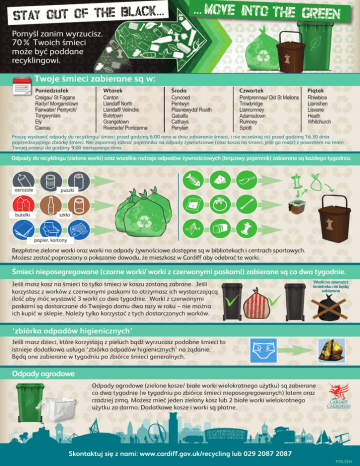 Pomyśl zanim wyrzucisz. 70% Twoich śmieci może być poddane recyklingowi. Twoje śmieci zabierane są w: Poniedziałek Creigau/ St Fagans Radyr/ Morganstown Fairwater/ Pentyrch/ Tongwynlais Ely Caerau Wtorek Canton Llandaff North Llandaff/ Velindre Butetown Grangetown Riverside/ Pontcanna Środa Cyncoed Pentwyn Plasnewydd/ Roath Gabalfa Cathays Penylan Czwartek Pontprennau/ Old St Mellons Trowbridge Llanrumney Adamsdown Rumney Splott Piątek Rhiwbina Llanishen Lisvane Heath Whitchurch Proszę wystawić odpady do recyklingu/ śmieci przed godziną 6:00 rano w dniu zabierania śmieci, i nie wcześniej niż przed godziną 16.30 dnia poprzedzającego zbiórkę śmieci. Nie zapomnij zabrać pojemnika na odpady żywnościowe (oraz kosza na śmieci, jeśli go masz) z powrotem na teren Twojej posesji do godziny 9:00 następnego dnia. Odpady do recyklingu (zielone worki) oraz wszelkie rodzaje odpadów żywnościowych (brązowy pojemnik) zabierane są każdego tygodnia. aerozole puszki butelki szkło papier, kartony Bezpłatne zielone worki oraz worki na odpady żywnościowe dostępne są w bibliotekach i centrach sportowych. Możesz zostać poproszony o pokazanie dowodu, że mieszkasz w Cardiff aby odebrać te worki. Śmieci nieposegregowane (czarne worki/ worki z czerwonymi paskami) zabierane są co dwa tygodnie. Jeśli masz kosz na śmieci to tylko śmieci w koszu zostaną zabrane. Jeśli korzystasz z worków z czerwonymi paskami to otrzymasz ich wystarczającą ilość aby móc wystawić 3 worki co dwa tygodnie. Worki z czerwonymi paskami są dostarczane do Twojego domu dwa razy w roku – nie można ich kupić w sklepie. Należy tylko korzystać z tych dostarczonych worków. Worki na zewnątrz śmietnika nie będą zabierane ‘zbiórka odpadów higienicznych’ Jeśli masz dzieci, które korzystają z pieluch bądź wyrzucasz podobne śmieci to istnieje dodatkowa usługa ‘zbiórka odpadów higienicznych’ na żądanie. Będą one zabierane w tygodniu po zbiórce śmieci generalnych. Odpady ogrodowe Odpady ogrodowe (zielone kosze/ białe worki wielokrotnego użytku) są zabierane co dwa tygodnie (w tygodniu po zbiórce śmieci nieposegregowanych) latem oraz rzadziej zimą. Możesz mieć jeden zielony kosz lub 2 białe worki wielokrotnego użytku za darmo. Dodatkowe kosze i worki są płatne. Skontaktuj się z nami: www.cardiff.gov.uk/recycling lub 029 2087 2087 POLISH Think before you throw. 70% of your waste can be recycled. Your collection day is: Monday Creigau/ St Fagans Radyr/ Morganstown Fairwater/ Pentyrch/ Tongwynlais Ely Caerau Tuesday Canton Llandaff North Llandaff/ Velindre Butetown Grangetown Riverside/ Pontcanna Wednesday Cyncoed Pentwyn Plasnewydd/ Roath Gabalfa Cathays Penylan Thursday Pontprennau/ Old St Mellons Trowbridge Llanrumney Adamsdown Rumney Splott Friday Rhiwbina Llanishen Lisvane Heath Whitchurch Please put your recycling/ waste out by 6am on collection day, but no earlier than 4.30pm the day before collection. Don’t forget to take your food caddy (and wheeled bin if you have one) back onto your property by 9am the following day. Recycling (Green Bags) and all types of food waste (brown caddy) are collected every week. AEROSOLS CANS BOTTLES GLASS PAPER & CARD Free green bags and caddy liners are available from council libraries and leisure centres. You may need to show proof of a Cardiff address to collect. General Waste (black bins/ red striped bags) are collected once a fortnight. If you have a bin, only waste inside your bin will be collected. If you have red striped bags, you will be given enough to put out 3 bags for each fortnightly collection. Red striped bags are delivered to your home twice a year - they cannot be bought in shops. You must only use these bags. Hygiene Service If you have children in nappies or produce similar incontinence waste, there is an additional “hygiene service” available on request. This will be collected on the opposite week to general waste. Garden Waste or Garden waste (green bins/re-useable white sacks) are collected fortnightly (opposite week to general waste) in the summer and less often in the winter. You can have one green bin or 2 re-useable white sacks for free. Additional bins and sacks are chargeable. Contact us: www.cardiff.gov.uk/recycling or C2C (029) 2087 2087 No bags outside of the bin will be collected