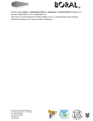 Zarówno płyty szklano – epoksydowe (TSE) jak i papierowo – fenolowe (PCF) dostępne są w formacie 1000x1000 mm oraz 1000x2000 mm. Informacji na temat dostępnych średnic wałków oraz rur, a także grubości płyt uzyskacie Paostwo kontaktując się z naszym działem handlowym. Boral P.P.H.U. Aleksander Borowicz ul. Sandomierska 11 61 – 351 Poznao Tel. +48 61 870 0457 Fax. +48 61 870 0461 [email protected] www.boral.pl
