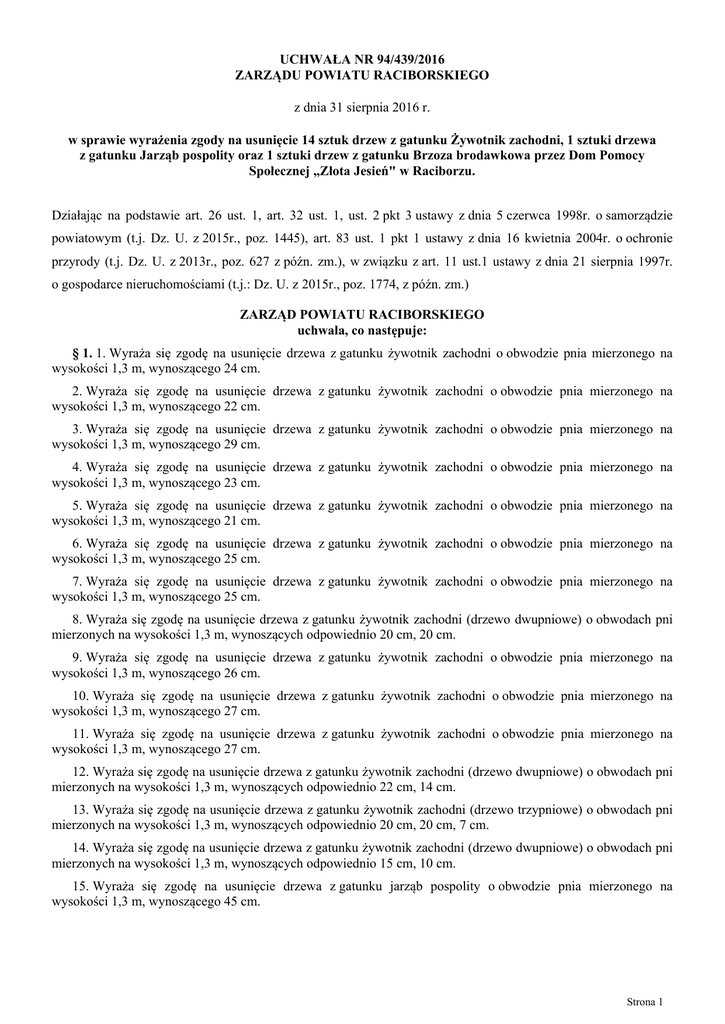 UCHWAŁA NR 94/439/2016 ZARZĄDU POWIATU RACIBORSKIEGO z dnia 31 sierpnia 2016 r. w sprawie wyrażenia zgody na usunięcie 14 sztuk drzew z gatunku Żywotnik zachodni, 1 sztuki drzewa z gatunku Jarząb pospolity oraz 1 sztuki drzew z gatunku Brzoza brodawkowa przez Dom Pomocy Społecznej „Złota Jesień" w Raciborzu. Działając na podstawie art. 26 ust. 1, art. 32 ust. 1, ust. 2 pkt 3 ustawy z dnia 5 czerwca 1998r. o samorządzie powiatowym (t.j. Dz. U. z 2015r., poz. 1445), art. 83 ust. 1 pkt 1 ustawy z dnia 16 kwietnia 2004r. o ochronie przyrody (t.j. Dz. U. z 2013r., poz. 627 z późn. zm.), w związku z art. 11 ust.1 ustawy z dnia 21 sierpnia 1997r. o gospodarce nieruchomościami (t.j.: Dz. U. z 2015r., poz. 1774, z późn. zm.) ZARZĄD POWIATU RACIBORSKIEGO uchwala, co następuje: § 1. 1. Wyraża się zgodę na usunięcie drzewa z gatunku żywotnik zachodni o obwodzie pnia mierzonego na wysokości 1,3 m, wynoszącego 24 cm. 2. Wyraża się zgodę na usunięcie drzewa z gatunku żywotnik zachodni o obwodzie pnia mierzonego na wysokości 1,3 m, wynoszącego 22 cm. 3. Wyraża się zgodę na usunięcie drzewa z gatunku żywotnik zachodni o obwodzie pnia mierzonego na wysokości 1,3 m, wynoszącego 29 cm. 4. Wyraża się zgodę na usunięcie drzewa z gatunku żywotnik zachodni o obwodzie pnia mierzonego na wysokości 1,3 m, wynoszącego 23 cm. 5. Wyraża się zgodę na usunięcie drzewa z gatunku żywotnik zachodni o obwodzie pnia mierzonego na wysokości 1,3 m, wynoszącego 21 cm. 6. Wyraża się zgodę na usunięcie drzewa z gatunku żywotnik zachodni o obwodzie pnia mierzonego na wysokości 1,3 m, wynoszącego 25 cm. 7. Wyraża się zgodę na usunięcie drzewa z gatunku żywotnik zachodni o obwodzie pnia mierzonego na wysokości 1,3 m, wynoszącego 25 cm. 8. Wyraża się zgodę na usunięcie drzewa z gatunku żywotnik zachodni (drzewo dwupniowe) o obwodach pni mierzonych na wysokości 1,3 m, wynoszących odpowiednio 20 cm, 20 cm. 9. Wyraża się zgodę na usunięcie drzewa z gatunku żywotnik zachodni o obwodzie pnia mierzonego na wysokości 1,3 m, wynoszącego 26 cm. 10. Wyraża się zgodę na usunięcie drzewa z gatunku żywotnik zachodni o obwodzie pnia mierzonego na wysokości 1,3 m, wynoszącego 27 cm. 11. Wyraża się zgodę na usunięcie drzewa z gatunku żywotnik zachodni o obwodzie pnia mierzonego na wysokości 1,3 m, wynoszącego 27 cm. 12. Wyraża się zgodę na usunięcie drzewa z gatunku żywotnik zachodni (drzewo dwupniowe) o obwodach pni mierzonych na wysokości 1,3 m, wynoszących odpowiednio 22 cm, 14 cm. 13. Wyraża się zgodę na usunięcie drzewa z gatunku żywotnik zachodni (drzewo trzypniowe) o obwodach pni mierzonych na wysokości 1,3 m, wynoszących odpowiednio 20 cm, 20 cm, 7 cm. 14. Wyraża się zgodę na usunięcie drzewa z gatunku żywotnik zachodni (drzewo dwupniowe) o obwodach pni mierzonych na wysokości 1,3 m, wynoszących odpowiednio 15 cm, 10 cm. 15. Wyraża się zgodę na usunięcie drzewa z gatunku jarząb pospolity o obwodzie pnia mierzonego na wysokości 1,3 m, wynoszącego 45 cm. Strona 1 16. Wyraża się zgodę na usunięcie drzewa z gatunku brzoza brodawkowa o obwodzie pnia mierzonego na wysokości 1,3 m, wynoszącego 65 cm. § 2. Drzewa zlokalizowane są na nieruchomości oznaczonej w ewidencji gruntów jako działka nr 685/170 k.m. 3, obręb Ostróg, o pow. 1.3816 ha, stanowiącej własność Powiatu Raciborskiego w trwałym zarządzie Domu Pomocy Społecznej „Złota Jesień” w Raciborzu. § 3. Wykonanie uchwały powierza się Członkowi Zarządu Andrzejowi Chroboczkowi. § 4. Uchwała wchodzi w życie z dniem podjęcia. Radca Prawny Starosta Michalina Staniszewska Ryszard Winiarski Strona 2 Uzasadnienie Nieruchomość położona w Raciborzu oznaczona jako działka nr 685/170 k.m. 3, obręb Ostróg, o pow. 1.3816 ha, stanowi własność Powiatu Raciborskiego. Przedmiotowa nieruchomość znajduje się w trwałym zarządzie Domu Pomocy Społecznej „Złota Jesień” w Raciborzu. Wnioskiem nr SA.0714.21.2016 z dnia 12 sierpnia 2016r., Dyrektor Domu Pomocy Społecznej „Złota Jesień” w Raciborzu, zwrócił się do Zarządu Powiatu Raciborskiego z prośbą o wyrażenie zgody na usunięcie 16 sztuk drzew, a to ze względu na ich zły stan zdrowotny i zagrożenie budynkowi. Kierownik Referatu Ochrony Środowiska, Gospodarki Wodnej i Rolnictwa tut. urzędu pismem nr SE.IV.613.105.2016 z dnia 24 sierpnia 2016r., pozytywnie zaopiniował usunięcie 14 sztuk drzew z gatunku żywotnik zachodni, 1 sztuki drzewa z gatunku jarząb pospolity oraz 1 sztuki drzewa z gatunku brzoza brodawkowa, ze względu na fakt, iż całkowicie utraciły żywotność lub są w fazie zamierania. Zgodnie z art. 83 ust. 1 pkt 1 ustawy z dnia 16 kwietnia 2004r. o ochronie przyrody usunięcie drzew lub krzewów z terenu nieruchomości może nastąpić, po uzyskaniu zezwolenia wydanego przez prezydenta miasta na wniosek posiadacza nieruchomości, za zgodą właściciela tej nieruchomości. Stosownie natomiast do art. 11 ust. 1 ustawy z dnia 21 sierpnia 1997r. o gospodarce nieruchomościami organem reprezentującym Powiat Raciborski w sprawie gospodarowania nieruchomościami jest Zarząd Powiatu Raciborskiego. Wobec powyższego w tym stanie prawnym i faktycznym podjęcie uchwały jest celowe i uzasadnione. Kierownik Referatu Gospodarki Nieruchomościami Członek Zarządu Zbigniew Rydzek Andrzej Chroboczek Strona 3