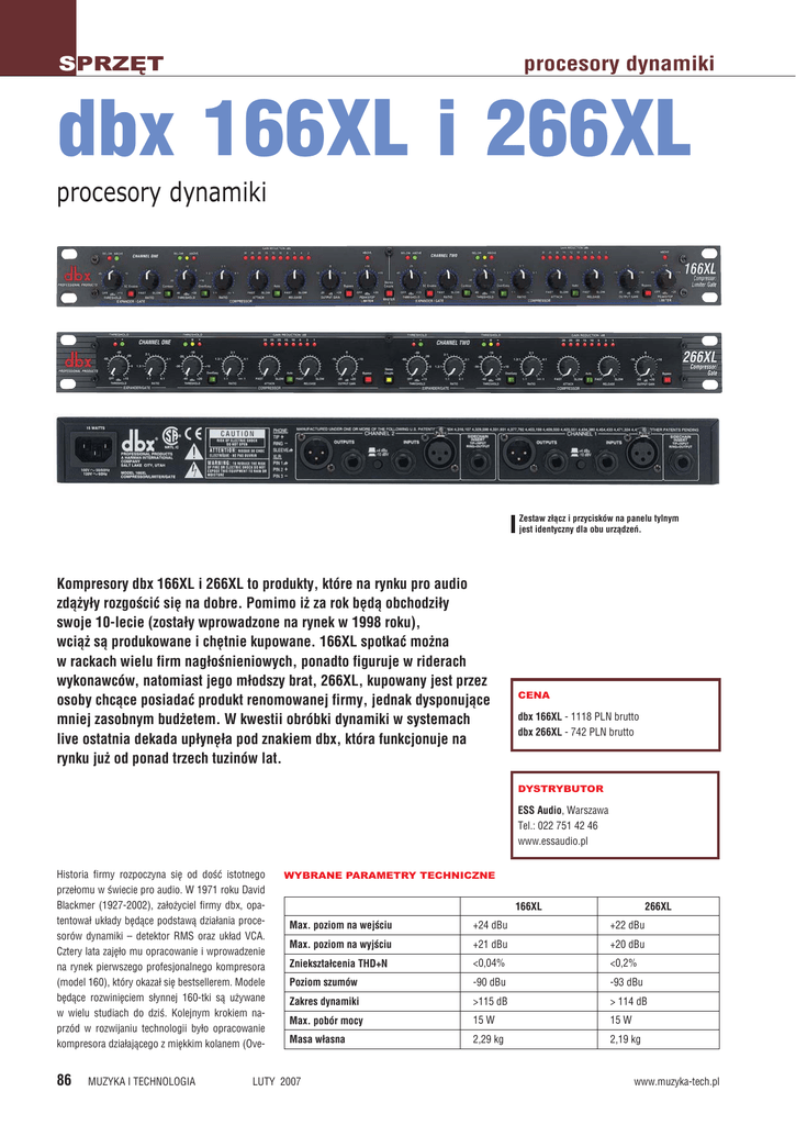 SPRZĘT procesory dynamiki dbx 166XL i 266XL procesory dynamiki Zestaw złącz i przycisków na panelu tylnym jest identyczny dla obu urządzeń. Kompresory dbx 166XL i 266XL to produkty, które na rynku pro audio zdążyły rozgościć się na dobre. Pomimo iż za rok będą obchodziły swoje 10-lecie (zostały wprowadzone na rynek w 1998 roku), wciąż są produkowane i chętnie kupowane. 166XL spotkać można w rackach wielu firm nagłośnieniowych, ponadto figuruje w riderach wykonawców, natomiast jego młodszy brat, 266XL, kupowany jest przez osoby chcące posiadać produkt renomowanej firmy, jednak dysponujące mniej zasobnym budżetem. W kwestii obróbki dynamiki w systemach live ostatnia dekada upłynęła pod znakiem dbx, która funkcjonuje na rynku już od ponad trzech tuzinów lat. CENA dbx 166XL - 1118 PLN brutto dbx 266XL - 742 PLN brutto DYSTRYBUTOR ESS Audio, Warszawa Tel.: 022 751 42 46 www.essaudio.pl Historia firmy rozpoczyna się od dość istotnego przełomu w świecie pro audio. W 1971 roku David Blackmer (1927-2002), założyciel firmy dbx, opatentował układy będące podstawą działania procesorów dynamiki – detektor RMS oraz układ VCA. Cztery lata zajęło mu opracowanie i wprowadzenie na rynek pierwszego profesjonalnego kompresora (model 160), który okazał się bestsellerem. Modele będące rozwinięciem słynnej 160-tki są używane w wielu studiach do dziś. Kolejnym krokiem naprzód w rozwijaniu technologii było opracowanie kompresora działającego z miękkim kolanem (Ove- 86 MUZYKA I TECHNOLOGIA WYBRANE PARAMETRY TECHNICZNE 166XL 266XL Max. poziom na wejściu +24 dBu +22 dBu Max. poziom na wyjściu +21 dBu +20 dBu Zniekształcenia THD+N <0,04% <0,2% Poziom szumów -90 dBu -93 dBu Zakres dynamiki >115 dB > 114 dB Max. pobór mocy 15 W 15 W Masa własna 2,29 kg 2,19 kg LUTY 2007 www.muzyka-tech.pl rEasy) – mowa tu o modelu 185 z 1977 roku. Rok 1985 upłynął pod znakiem kolejnego bestsellera – jest nim 2-kanałowy kompresor 166, z możliwością pracy stereofonicznej. W dalszej kolejności powstały wersje 166A oraz 266A. Model 266XL, będący przedmiotem niniejszego testu, zadebiutował na początku 1998 roku, oferując funkcję regulacji parametrów czasowych kompresji. Pod koniec roku swoją premierę miał bardziej rozbudowany 166XL. Budowa i wygląd zewnętrzny Oba kompresory umieszczono w metalowych obudowach rack 19’’ o wysokości 1 U. Producent przyjął ciemnoszarą kolorystykę urządzeń, przez co wyglądają w pełni profesjonalnie, aczkolwiek niepozornie. Panel tylny wygląda identycznie w obu przypadkach. Oprócz gniazda na kabel zasilający, znajdziemy tam wejścia i wyjścia wyprowadzone w postaci gniazd XLR (Neutrik) i TRS oraz gniazda SIDECHAIN INSERT, pozwalające przy pomocy wtyczki TRS przerwać obwód sterowania wzmocnieniem i wpiąć weń dodatkowe urządzenie. Sygnały możemy wprowadzić i wyprowadzić z kompresora przy pomocy kabli TRS bądź XLR. Gniazdo SIDECHAIN INSERT umożliwia wpięcie dodatkowego urządzenia w tor sterowania. Wykres obrazuje działanie funkcji Over Easy. Kolorami zaznaczone zostały obszary, którym odpowiada zaświecenie poszczególnych diod nad pokrętłem THRESHOLD. Poziom wyjściowy i wejściowy (-10 dBV lub +4 dBu) ustawia się dedykowanym przyciskiem, osobno dla każdego z kanałów. Różnice pomiędzy urządzeniami widoczne są na panelu przednim – 266XL posiada mniej gałek i przycisków. Gałki potencjometrów są odpowiednio duże, działają pewnie i precyzyjnie, nie wykazując tendencji do chwiania się. Co ciekawe, poszczególne partie produkcji mogą różnić się kształtem zastosowanych LED-ów w miernikach redukcji wzmocnienia – spotyka się zarówno okrągłe, jak i prostokątne. Rozmieszczenie poszczególnych elementów jest jednoznaczne i ergonomiczne, dodatkowo czytelność poprawiają podświetlane przyciski. Ekspander w 266XL Urządzenie posiada dwa identycznie wyposażone kanały, z możliwością pracy w trybie stereo. Pierwszym blokiem w torze sygnału jest ekspander, z możliwością regulacji progu zadziałania oraz nachylenia ekspansji (od 1:1 do 4:1). Działanie ekspandera sygnalizowane jest dwiema diodami ulokowanymi nad pokrętłem THRESHOLD, które pokazują, czy sygnał znajduje się poniżej, czy powyżej ustalo- Prekursorem testowanych kompresorów jest słynna 160-tka, której premiera miała miejsce w 1975 roku. nego progu. Stopień redukcji wzmocnienia pokazywany jest na mierniku wspólnym dla kompresora i ekspandera. Kompresor Kolejnym blokiem w torze sygnału jest kompresor, który może pracować w trybie Hard Knee bądź OverEasy (wyboru dokonujemy przyciskiem). Podobnie jak w przypadku ekspandera, nad pokrętłem THRESHOLD (próg kompresji) SPRZĘT procesory dynamiki ulokowano diody, tym razem trzy, sygnalizują- Ostatnim regulatorem jest potencjometr OUT- ce, czy aktualna wartość sygnału znajduje się PUT, pozwalający „odzyskać” głośność straconą pod czy nad ustalonym progiem kompresji. w wyniku kompresji (zakres: od -20 dB do +20 Trzecia dioda, ulokowana pomiędzy pozosta- dB). Obok niego znajduje się przycisk Bypass, łymi, działa tylko w trybie OverEasy, świecąc służący do ominięcia bloku dynamiki. Dzięki nie- wówczas, gdy wartość sygnału znajduje się mu możemy porównać sygnał skompresowany w strefie miękkiego kolana. z oryginalnym. Aktywność funkcji sygnalizowana jest podświetleniem przycisku na czerwono, Próg kompresji RATIO możemy regulować przed przystąpieniem do pracy warto zawsze w zakresie od 1:1 do ∞:1. Nowością w wersji XL, spojrzeć, czy przycisk nie jest wciśnięty. w porównaniu do poprzednich edycji, jest moż- Pomiędzy kanałami znajduje się przycisk Stereo Potencjometry oraz ich opisy są odpowiednio duże i czytelne. Przemyślane rozplanowanie manipulatorów na panelu przednim ułatwia odnalezienie najważniejszych funkcji nawet w ciemności. liwość regulacji parametrów cza