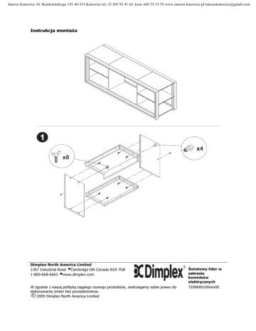 Interex Katowice Al. Roździeńskiego 191 40-315 Katowice tel. 32 203 92 41 tel. kom. 602 55 15 55 www.interex-katowice.pl [email protected] Instrukcja montażu Dimplex North America Limited 1367 Industrial Road Cambrdge ON Canada N1R 7G8 1-800-668-6663 www.dimplex.com W zgodzie z naszą polityką ciągłego rozwoju produktów, zastrzegamy sobie prawo do dokonywania zmian bez powiadomienia. 2009 Dimplex North America Limited Światowy lider w zakresie kominków elektrycznych 7209690100rev00 Interex Katowice Al. Roździeńskiego 191 40-315 Katowice tel. 32 203 92 41 tel. kom. 602 55 15 55 www.interex-katowice.pl [email protected] 2009 Dimplex North America Limited 7209690100rev00 Interex Katowice Al. Roździeńskiego 191 40-315 Katowice tel. 32 203 92 41 tel. kom. 602 55 15 55 www.interex-katowice.pl [email protected] 2009 Dimplex North America Limited 7209690100rev00 Interex Katowice Al. Roździeńskiego 191 40-315 Katowice tel. 32 203 92 41 tel. kom. 602 55 15 55 www.interex-katowice.pl [email protected] 2009 Dimplex North America Limited 7209690100rev00 Interex Katowice Al. Roździeńskiego 191 40-315 Katowice tel. 32 203 92 41 tel. kom. 602 55 15 55 www.interex-katowice.pl [email protected] NINIEJSZĄ INSTRUKCJĘ NALEŻY ZACHOWAĆ NA PRZYSZŁOŚĆ Szanowni Klienci Dziękujemy za wybranie jednej z oferowanych przez nas obudów kominkowych, stanowiących uzupełnienie dla Kominka Elektrycznego Dimplex. Jesteśmy pewni, że Państwa zakup doda uroku i zwiększy wygodę Państwa domu na wiele nadchodzących lat. UWAGA: Obudowa kominkowa została wykonana z materiałów najwyższej jakości o klasie cabinet grade (jakość szafki kuchennej). Jednakże ponieważ drewno jest materiałem naturalnym, można zauważyć różnice w zakresie spójności włókien. Jest to zjawisko normalne, które nada wyjątkowości Państwa obudowie kominkowej. Ostrzeżenie: Obudowy kominkowej nie należy używać do celów innych niż wkład kominka elektrycznego Dimplex. GWARANCJA Przed wysyłką obudowy kominkowe Dimplex są poddawane testom i kontrolom, a nabywcy każdego nowego produktu przysługuje gwarancja. Każda część, która okaże się wadliwa w ciągu dwóch lat ze względu na zastosowany materiał lub wykonanie, w przypadku normalnego użytkowania, zostanie bezpłatnie wymieniona. Firma nie ponosi odpowiedzialności za jakiekolwiek koszty poniesione w związku z montażem, wycofaniem z użycia lub transportem produktu. Wszelkie wady tego rodzaju należy zgłosić autoryzowanemu dilerowi w miejscu zakupu produktu, uprawnionemu do dokonania naprawy lub wymiany produktu zgodnie z warunkami niniejszej gwarancji. Zgodnie z niniejszą gwarancją, firma zobowiązuje się jedynie według własnego uznania do naprawy lub wymiany wszystkich części, które okażą się wadliwe lub zwrotu ceny zakupu takich części. Właściciel/użytkownik przyjmuje wszystkie inne ryzyka, jeżeli takie wystąpią, włącznie z ryzykiem bezpośredniej lub pośredniej straty lub szkody następczej powstałej w związku z korzystaniem lub nieumiejętnym korzystaniem z urządzenia. Gwarancja nie ma zastosowania, jeżeli według wyłącznej oceny Firmy, szkoda lub awaria były wynikiem wypadku, modyfikacji, niewłaściwego użycia, nadużycia, nieprawidłowego montażu lub użycia do celów innych niż te, do których przeznaczony jest kominek elektryczny Dimplex. Powyższa gwarancja zastępuje wszystkie inne gwarancje wyrażone, domniemane lub ustawowe, przy czym firma ani nie przyjmuje ani nie uprawnia żadnej osoby do przyjęcia na siebie jakiegokolwiek innego zobowiązania lub odpowiedzialności w związku ze sprzedanym produktem. Dimplex North America Limited 1367 Industrial Road Cambridge ON Canada N1R 7G8 1-800-668-6663 www.dimplex.com 2009 Dimplex North America Limited 7209690100rev00