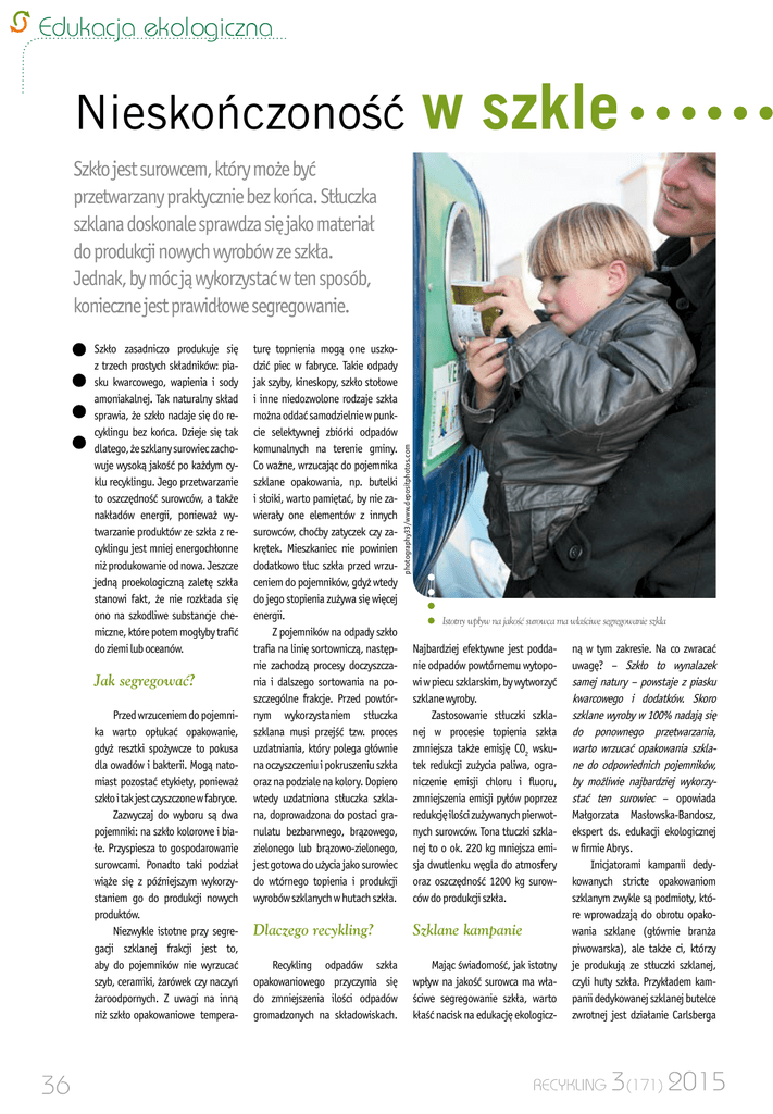 Edukacja ekologiczna Nieskończoność w szkle Szkło zasadniczo produkuje się z trzech prostych składników: piasku kwarcowego, wapienia i sody amoniakalnej. Tak naturalny skład sprawia, że szkło nadaje się do recyklingu bez końca. Dzieje się tak dlatego, że szklany surowiec zachowuje wysoką jakość po każdym cyklu recyklingu. Jego przetwarzanie to oszczędność surowców, a także nakładów energii, ponieważ wytwarzanie produktów ze szkła z recyklingu jest mniej energochłonne niż produkowanie od nowa. Jeszcze jedną proekologiczną zaletę szkła stanowi fakt, że nie rozkłada się ono na szkodliwe substancje chemiczne, które potem mogłyby trafić do ziemi lub oceanów. Jak segregować? Przed wrzuceniem do pojemnika warto opłukać opakowanie, gdyż resztki spożywcze to pokusa dla owadów i bakterii. Mogą natomiast pozostać etykiety, ponieważ szkło i tak jest czyszczone w fabryce. Zazwyczaj do wyboru są dwa pojemniki: na szkło kolorowe i białe. Przyspiesza to gospodarowanie surowcami. Ponadto taki podział wiąże się z późniejszym wykorzystaniem go do produkcji nowych produktów. Niezwykle istotne przy segregacji szklanej frakcji jest to, aby do pojemników nie wyrzucać szyb, ceramiki, żarówek czy naczyń żaroodpornych. Z uwagi na inną niż szkło opakowaniowe tempera- 36 turę topnienia mogą one uszkodzić piec w fabryce. Takie odpady jak szyby, kineskopy, szkło stołowe i inne niedozwolone rodzaje szkła można oddać samodzielnie w punkcie selektywnej zbiórki odpadów komunalnych na terenie gminy. Co ważne, wrzucając do pojemnika szklane opakowania, np. butelki i słoiki, warto pamiętać, by nie zawierały one elementów z innych surowców, choćby zatyczek czy zakrętek. Mieszkaniec nie powinien dodatkowo tłuc szkła przed wrzuceniem do pojemników, gdyż wtedy do jego stopienia zużywa się więcej energii. Z pojemników na odpady szkło trafia na linię sortowniczą, następnie zachodzą procesy doczyszczania i dalszego sortowania na poszczególne frakcje. Przed powtórnym wykorzystaniem stłuczka szklana musi przejść tzw. proces uzdatniania, który polega głównie na oczyszczeniu i pokruszeniu szkła oraz na podziale na kolory. Dopiero wtedy uzdatniona stłuczka szklana, doprowadzona do postaci granulatu bezbarwnego, brązowego, zielonego lub brązowo-zielonego, jest gotowa do użycia jako surowiec do wtórnego topienia i produkcji wyrobów szklanych w hutach szkła. photography33/www.depositphotos.com Szkło jest surowcem, który może być przetwarzany praktycznie bez końca. Stłuczka szklana doskonale sprawdza się jako materiał do produkcji nowych wyrobów ze szkła. Jednak, by móc ją wykorzystać w ten sposób, konieczne jest prawidłowe segregowanie. Istotny wpływ na jakość surowca ma właściwe segregowanie szkła Najbardziej efektywne jest poddanie odpadów powtórnemu wytopowi w piecu szklarskim, by wytworzyć szklane wyroby. Zastosowanie stłuczki szklanej w procesie topienia szkła zmniejsza także emisję CO2 wskutek redukcji zużycia paliwa, ograniczenie emisji chloru i fluoru, zmniejszenia emisji pyłów poprzez redukcję ilości zużywanych pierwotnych surowców. Tona tłuczki szklanej to o ok. 220 kg mniejsza emisja dwutlenku węgla do atmosfery oraz oszczędność 1200 kg surowców do produkcji szkła. Dlaczego recykling? Szklane kampanie Recykling odpadów szkła opakowaniowego przyczynia się do zmniejszenia ilości odpadów gromadzonych na składowiskach. Mając świadomość, jak istotny wpływ na jakość surowca ma właściwe segregowanie szkła, warto kłaść nacisk na edukację ekologicz- ną w tym zakresie. Na co zwracać uwagę? – Szkło to wynalazek samej natury – powstaje z piasku kwarcowego i dodatków. Skoro szklane wyroby w 100% nadają się do ponownego przetwarzania, warto wrzucać opakowania szklane do odpowiednich pojemników, by możliwie najbardziej wykorzystać ten surowiec – opowiada Małgorzata Masłowska-Bandosz, ekspert ds. edukacji ekologicznej w firmie Abrys. Inicjatorami kampanii dedykowanych stricte opakowaniom szklanym zwykle są podmioty, które wprowadzają do obrotu opakowania szklane (głównie branża piwowarska), ale także ci, którzy je produkują ze stłuczki szklanej, czyli huty szkła. Przykładem kampanii dedykowanej szklanej butelce zwrotnej jest działanie Carlsberga RECYKLING 3(171) 2015 Recykling szkła pania prezentuje główne korzyści płynące z ponownego wykorzystania szkła. Jest realizowana w czternastu wybranych krajach, w tym w Polsce. – Najważniejszy przekaz, jaki powinien płynąć z działań edukacyjnych dotyczy tego, że niepotrzebne opakowania szklane można w nieskończoność przetapiać na nowe bez straty ich jakości. Recykling opakowań szklanych jest procesem stosunkowo prostym – szczególnie w porównaniu do niektórych konkurencyjnych materiałów opakowaniowych – komentuje Tomasz Szymkowiak, dyrektor wydawnictw w firmie Abrys, wieloletni uczestnik komisji w kategorii „Szklana statuetka” w Konkursie o Puchar Recyklingu. Język korzyści Zbierając szkło, oszczędza się coraz trudniej dostępne surowce, takie jak: piasek szklarski, dolomit i wapień sody. Zmniejszone wydobycie tych surowców oznacza także wkład w ochronę krajobrazu. Przetwarzanie szkła to także ograniczenie składowania odpadów, gdyż na składowiska trafia o kilkaset tysięcy metrów sześciennych odpadów szklanych mniej. Ponadto istotne są też korzyści społeczne: oczyszczanie stłuczki, jej zbiórka i logistyka generują miejsca pracy. Przetwarzając szkło, czyli stosując stłuczkę szklaną jako surowiec (zamiast surowców pierwotnych), zmniejszamy energochłonność produkcji, a tym samym redukujemy emisję CO2 oraz innych zanieczyszczeń powietrza. Obecnie w Polsce rocznie recyklingowi poddaje się kilkaset tysięcy ton stłuczki szklanej – producenci szkła żywią nadzieję, że strumień przetopionej stłuczki w najbliższym czas