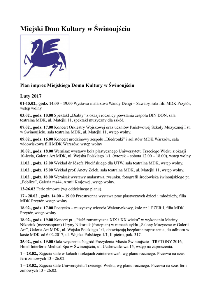 Miejski Dom Kultury w Świnoujściu Plan imprez Miejskiego Domu Kultury w Świnoujściu Luty 2017 01-15.02., godz. 14.00 – 19.00 Wystawa malarstwa Wandy Dengi – Szwaby, sala filii MDK Przytór, wstęp wolny. 03.02., godz. 10.00 Spektakl „Diabły” z okazji rocznicy powstania zespołu DIN DON, sala teatralna MDK, ul. Matejki 11, spektakl muzyczny dla szkół. 07.02., godz. 17.00 Koncert Orkiestry Wojskowej oraz uczniów Państwowej Szkoły Muzycznej I st. w Świnoujściu, sala teatralna MDK, ul. Matejki 11, wstęp wolny. 09.02., godz. 16.00 Koncert urodzinowy zespołu „Biedronki” i solistów MDK Warszów, sala widowiskowa filii MDK Warszów, wstęp wolny 10.02., godz. 18.00 Wernisaż wystawy koła plastycznego Uniwersytetu Trzeciego Wieku z okazji 10-lecia, Galeria Art MDK, ul. Wojska Polskiego 1/1, (wtorek – sobota 12.00 – 18.00), wstęp wolny 11.02., godz. 12.00 Wykład dr Józefa Plucińskiego dla UTW, sala teatralna MDK, wstęp wolny. 11.02., godz. 15.00 Wykład prof. Anety Zelek, sala teatralna MDK, ul. Matejki 11, wstęp wolny. 11.02., godz. 18.00 Wernisaż wystawy malarstwa, rysunku, fotografii środowiska świnoujskiego pt. „Pobliże”, Galeria ms44, Armii Krajowej, wstęp wolny. 13-26.02 Ferie zimowe (wg oddzielnego planu). 17 - 28.02., godz. 14.00 – 19.00 Przestrzenna wystawa prac plastycznych dzieci i młodzieży, filia MDK Przytór, wstęp wolny. 18.02., godz. 17.00 Poetycko – muzyczny wieczór Walentynkowy, koło nr 1 PZERiI, filia MDK Przytór, wstęp wolny. 18.02., godz. 19.00 Koncert pt. „Pieśń romantyczna XIX i XX wieku” w wykonaniu Mariny Nikoriuk (mezzosopran) i Iryny Nikoriuk (fortepian) w ramach cyklu „Salony Muzyczne w Galerii Art”, Galeria Art MDK, ul. Wojska Polskiego 1/1, obowiązują bezpłatne zaproszenia, do odbioru w kasie MDK od 6.02.2017, ul. Wojska Polskiego 1/1, II piętro, pok. 317. 25.02., godz. 19.00 Gala wręczenia Nagród Prezydenta Miasta Świnoujście - TRYTONY 2016, Hotel Interferie Medical Spa w Świnoujściu, ul. Uzdrowiskowa 15, wstęp na zaproszenia. 1 – 28.02., Zajęcia stałe w kołach i sekcjach zainteresowań, wg planu rocznego. Przerwa na czas ferii zimowych 13 - 26.02. 1 – 28.02., Zajęcia stałe Uniwersytetu Trzeciego Wieku, wg planu rocznego. Przerwa na czas ferii zimowych 13 - 26.02.
