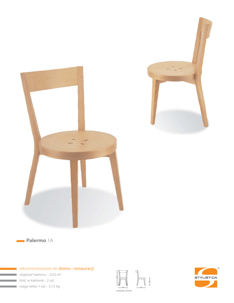 Palermo 1A rekomendowane do domu i restauracji objętość kartonu - 0,32 m3 TM waga netto 1 szt. - 5,15 kg ilość w kartonie - 2 szt. siedzisko: Ø 430