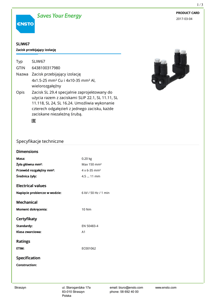 1/3 PRODUCT CARD 2017-03-04 SLIW67 Zacisk przebijający izolację Typ SLIW67 GTIN 6438100317980 Nazwa Zacisk przebijający izolację 4x1.5-25 mm² Cu i 4x10-35 mm² Al, wielorozgałęźny Opis Zacisk SL 29.4 specjalnie zaprojektowany do użycia razem z zaciskami SLIP 22.1, SL 11.11, SL 11.118, SL 24, SL 16.24. Umożliwia wykonanie czterech odgałęzień z jednego zacisku, każde zaciskane niezależną śrubą. < Specyfikacje techniczne Dimensions Masa: Żyła główna mm²: Przewód rozgałęźny mm²: Średnica żyły: 0.20 kg Max 150 mm² 4 x 6-35 mm² 4.5 … 11 mm Electrical values Napięcie probiercze w wodzie: 6 kV / 50 Hz / 1 min Mechanical Moment dokręcenia: 10 Nm Certyfikaty Standardy: Klasa zwarciowa: EN 50483-4 A1 Ratings ETIM: EC001062 Specification Construction: Straszyn ul. Starogardzka 17a 83-010 Straszyn Polska email: [email protected] phone: 58 692 40 00 www.ensto.com 2/3 Construction: Tools required: Markings: Component Material Body Tin plated corrosion resistant aluminium alloy Screw Weather and UV-radiation resistant plastic, aluminium alloy with shear-head Cover Weather and UV-radiation resistant plastic 13 mm hexagonal socket wrench SLIW67, 6-35mm², ENSTO ETIM ETIM Surface protection: Tinned Material main conductor: Aluminium/copper Material branch conductor: Aluminium/copper Clamping channel opening main conductor: Both sides open Clamping channel opening branch Both sides open conductor: Type of connection: Insulation piercing connector IPC Opakowanie Opakowanie Size: Length: Width: Height: Weight (net): Weight (brt): Volume: Straszyn 20 385 mm 260 mm 130 mm 7.1475 kg 7.3705 kg 13.013 ul. Starogardzka 17a 83-010 Straszyn Polska email: [email protected] phone: 58 692 40 00 www.ensto.com 3/3 Straszyn ul. Starogardzka 17a 83-010 Straszyn Polska email: [email protected] phone: 58 692 40 00 www.ensto.com
