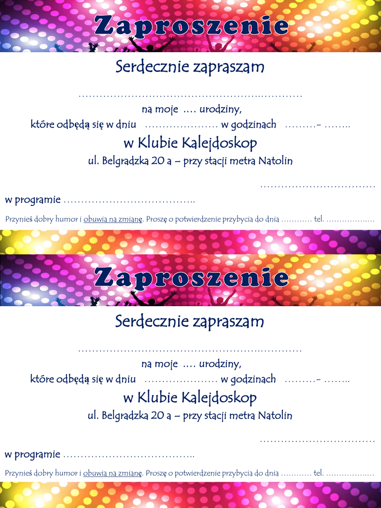 Serdecznie zapraszam …………………………………………….………… na moje .… urodziny, które odbędą się w dniu ………………… w godzinach ………- …….. w Klubie Kalejdoskop ul. Belgradzka 20 a – przy stacji metra Natolin …………………………… w programie ……………………………….. Przynieś dobry humor i obuwia na zmianę. Proszę o potwierdzenie przybycia do dnia ………… tel. …………….… Serdecznie zapraszam …………………………………………….………… na moje .… urodziny, które odbędą się w dniu ………………… w godzinach ………- …….. w Klubie Kalejdoskop ul. Belgradzka 20 a – przy stacji metra Natolin …………………………… w programie ……………………………….. Przynieś dobry humor i obuwia na zmianę. Proszę o potwierdzenie przybycia do dnia ………… tel. …………….…