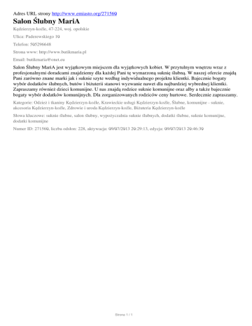 Adres URL strony http://www.emiasto.org/271560 Salon Ślubny MariA Kędzierzyn-koźle, 47-224, woj. opolskie Ulica: Paderewskiego 10 Telefon: 505296648 Strona www: http://www.butikmaria.pl Email: [email protected] Salon Ślubny MariA jest wyjątkowym miejscem dla wyjątkowych kobiet. W przytulnym wnętrzu wraz z profesjonalnymi doradcami znajdziemy dla każdej Pani tę wymarzoną suknię ślubną. W naszej ofercie znajdą Pani zarówno znane marki jak i suknie szyte według indywidualnego projektu klientki. Bajecznie bogaty wybór dodatków ślubnych, butów i biżuterii stanowi wyzwanie nawet dla najbardziej wybrednej klientki. Zapraszamy również dzieci komunijne. U nas znajdą rodzice suknie komunijne oraz alby a także bajecznie bogaty wybór dodatków komunijnych. Dla zorganizowanych rodziców ceny hurtowe. Serdecznie zapraszamy. Kategorie: Odzież i tkaniny Kędzierzyn-koźle, Krawieckie usługi Kędzierzyn-koźle, Ślubne, komunijne - suknie, akcesoria Kędzierzyn-koźle, Zdrowie i uroda Kędzierzyn-koźle, Biżuteria Kędzierzyn-koźle Słowa kluczowe: suknie ślubne, salon ślubny, wypożyczalnia suknie ślubnych, dodatki ślubne, suknie komunijne, dodatki komunijne Numer ID: 271560, liczba odsłon: 228, aktywacja: 09/07/2013 20:29:13, edycja: 09/07/2013 20:46:30 Strona 1 / 1