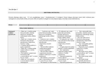 1 New Hot Spot 1 KRYTERIA OCENIANIA Kryteria obejmują zakres ocen 2-5, nie uwzględniając oceny 1 (niedostateczna) i 6 (celująca). Ocenę celującą otrzymuje uczeń, który wykracza poza wymagania na ocenę bardzo dobrą, zaś uczeń, który nie spełnia wymagań na ocenę dopuszczającą, otrzymuje ocenę niedostateczną. Ocena 2 3 4 5 W większości zna i umie podać dane personalne, artykuły spożywcze, przedmioty codziennego użytku, alfabet, kolory. W większości zna i umie użyć słownictwa dotyczącego sprzedawania i kupowania, towarów i usług. Z reguły poprawnie podaje godziny w języku angielskim . Zna i najczęściej poprawnie podaje zaimki osobowe w liczbie pojedynczej. Najczęściej poprawnie tworzy zdania z czasownikiem „być” w czasie Present simple. Najczęściej poprawnie Zna i umie podać dane personalne, artykuły spożywcze, przedmioty codziennego użytku, alfabet, kolory. Zna i bez trudu używa słownictwa dotyczącego sprzedawania i kupowania, towarów i usług. Zna i umie podać godziny w języku angielskim. Poprawnie używa zaimków osobowych w liczbie pojedynczej. Bez trudu tworzy zdania z czasownikiem „być” w czasie Present simple. Bez trudu stosuje zaimki wskazujące. Bez trudu stosuje przymiotniki dzierżawcze. Bez problemu używa WELCOME MODULE Znajomość środków językowych Słabo zna i z trudem podaje dane personalne, artykuły spożywcze, przedmioty codziennego użytku, alfabet, kolory. Słabo zna i z trudem używa słownictwa dotyczącego sprzedawania i kupowania, towarów i usług. Z trudem określa godziny w języku angielskim. Słabo zna i z trudem podaje zaimki osobowe w liczbie pojedynczej. Ma trudności z poprawnym tworzeniem zdań z czasownikiem „być” w czasie Present simple. Słabo zna i ma trudności ze stosowaniem zaimków wskazujących. Częściowo zna i umie podać dane personalne, artykuły spożywcze, przedmioty codziennego użytku, alfabet, kolory. Częściowo zna i z trudem używa słownictwa dotyczącego sprzedawania i kupowania, towarów i usług. Ma niewielkie trudności z podawaniem godzin w języku angielskim. Ma niewielkie trudności z poprawnym użyciem zaimków osobowych w liczbie pojedynczej. Ma trudności z tworzeniem zdań z czasownikiem „być” w czasie Present simple. Ma trudności ze stosowaniem 2 Słabo zna i ma trudności ze stosowaniem przymiotników dzierżawczych. Słabo zna i ma duże trudności w stosowaniu zaimków pytających. Słabo zna i ma duże problemy z właściwym tworzeniem liczby mnogiej rzeczowników. Słabo zna i ma duże problemy z właściwym stosowaniem przedimka nieokreślonego. Słuchanie Czytanie Ma trudności z rozumieniem zwrotów dnia codziennego adresowanych do ucznia. Ma trudności z rozumieniem ogólnego sensu tekstu oraz intencji rozmówców, pomimo pomocy nauczyciela. Ma trudności z rozumieniem tekstu słuchanego, z trudem odnajduje potrzebne informacje, pomimo pomocy nauczyciela. Ma trudności z poprawnym rozpoznawaniem rodzajów sytuacji komunikacyjnych. Ma trudności z rozumieniem tekstu czytanego, z trudem określa sens, pomimo pomocy nauczyciela. zaimków wskazujących. Ma trudności ze stosowaniem przymiotników dzierżawczych. Potrafi wymienić zaimki pytające, ale ma duże problemy z ich właściwym zastosowaniem. Ma trudności z tworzeniem liczby mnogiej rzeczowników. Ma trudności ze stosowaniem przedimka nieokreślonego. stosuje zaimki wskazujące. Najczęściej poprawnie stosuje przymiotniki dzierżawcze. Najczęściej poprawnie stosuje zaimki pytające. Najczęściej poprawnie tworzy liczbę mnogą rzeczowników. Najczęściej poprawnie stosuje przedimek nieokreślony. Częściowo rozumie zwroty dnia codziennego adresowane do ucznia. Częściowo rozumie ogólny sens tekstu i intencje rozmówców. Częściowo rozumie tekst słuchany i z pomocą nauczyciela odnajduje w nim potrzebne informacje. Częściowo poprawnie rozpoznaje rodzaje sytuacji komunikacyjnych. Częściowo rozumie ogólny sens tekstu czytanego. zaimków pytających. Bezbłędnie tworzy liczbę mnogą rzeczowników, potrafi samodzielnie wyjaśnić zasady tworzenia liczby mnogiej, podajać własne przykłady. Bezbłędnie stosuje przedimek nieokreślony. Rozumie większość zwrotów dnia codziennego adresowanych do ucznia. Zazwyczaj rozumie ogólny sens tekstu i intencje rozmówców. Rozumie większość tekstu słuchanego i przeważnie samodzielnie odnajduje w nim potrzebne informacje. Poprawnie rozpoznaje rodzaje sytuacji komunikacyjnych. Rozumie większość tekstu czytanego. Bez trudu rozumie zwroty dnia codziennego adresowane do ucznia. Zawsze rozumie ogólny sens tekstu i intencje rozmówców. Rozumie tekst słuchany i samodzielnie odnajduje w nim potrzebne informacje. Bez trudu rozpoznaje rodzaje sytuacji komunikacyjnych. Rozumie sens tekstu czytanego. 3 Mówienie Pisanie Reagowanie Przetwarzanie tekstu Popełniając liczne błędy, opisuje siebie. Popełniając liczne błędy, opisuje siebie. Popełniając liczne błędy przedstawia siebie, prosi o informacje, podaje swój wiek, podaje godziny, wyraża podziękowania i prośby. W niewielkim stopniu przekazuje informacje uzyskane z tekstu słuchanego i czytanego. Popełniając błędy opisuje siebie. Popełniając błędy, opisuje siebie. Popełniając błędy przedstawia siebie, prosi o informacje, podaje swój wiek, podaje godziny, wyraża podziękowania i prośby. Częściowo przekazuje informacje uzyskane z tekstu słuchanego i czytanego. Częściowo zna i umie podać dane personalne, zainteresowania, słownictwo opisujące samopoczucie, popularne dyscypliny, przedmioty nauczania, nazwy miesięcy i państw. Częściowo zna i z trudem podaje zaimki osobowe. Ma niewielkie trudności z poprawnym użyciem form twierdzących, pełnych i skróconych czasownika „być” w liczbie pojedynczej. Ma trudności z podaniem i zastosowaniem przymiotników Popełniając nieliczne błędy, opisuje siebie. Popełniając nieliczne błędy, o