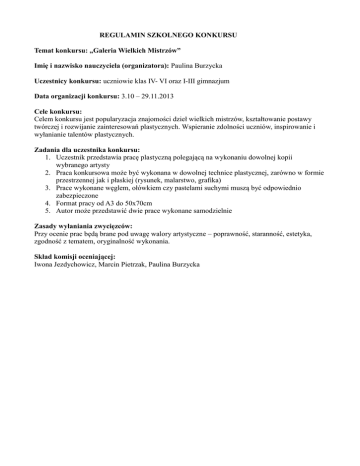 REGULAMIN SZKOLNEGO KONKURSU Temat konkursu: „Galeria Wielkich Mistrzów” Imię i nazwisko nauczyciela (organizatora): Paulina Burzycka Uczestnicy konkursu: uczniowie klas IV- VI oraz I-III gimnazjum Data organizacji konkursu: 3.10 – 29.11.2013 Cele konkursu: Celem konkursu jest popularyzacja znajomości dzieł wielkich mistrzów, kształtowanie postawy twórczej i rozwijanie zainteresowań plastycznych. Wspieranie zdolności uczniów, inspirowanie i wyłanianie talentów plastycznych. Zadania dla uczestnika konkursu: 1. Uczestnik przedstawia pracę plastyczną polegającą na wykonaniu dowolnej kopii wybranego artysty 2. Praca konkursowa może być wykonana w dowolnej technice plastycznej, zarówno w formie przestrzennej jak i płaskiej (rysunek, malarstwo, grafika) 3. Prace wykonane węglem, ołówkiem czy pastelami suchymi muszą być odpowiednio zabezpieczone 4. Format pracy od A3 do 50x70cm 5. Autor może przedstawić dwie prace wykonane samodzielnie Zasady wyłaniania zwycięzców: Przy ocenie prac będą brane pod uwagę walory artystyczne – poprawność, staranność, estetyka, zgodność z tematem, oryginalność wykonania. Skład komisji oceniającej: Iwona Jezdychowicz, Marcin Pietrzak, Paulina Burzycka