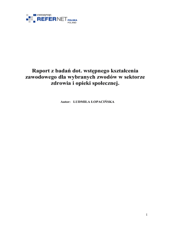 Raport z badań dot. wstępnego kształcenia zawodowego dla wybranych zwodów w sektorze zdrowia i opieki społecznej. Autor: LUDMIŁA ŁOPACIŃSKA 1 1. Kontekst dla wprowadzenia kompetencji kluczowych i umiejętności ogólnych do wstępnego kształcenia zawodowego. W Polsce kompetencje kluczowe i umiejętności ogólne stanowią element wstępnego kształcenia i szkolenia zawodowego; na przykład są zawarte w modułowych programach kształcenia zawodowego, chociaż bez wyodrębnienia ich od innych umiejętności zawodowych. Ponadto umiejętności ogólne (określane mianem „umiejętności ponadzawodowych”) są zdefiniowane w krajowych standardach umiejętności zawodowych. Planowane jest także wprowadzenie kompetencji kluczowych do nowej podstawy programowej, która określa wspólne efekty kształcenia dla wszystkich zawodów pod względem: zasad bezpieczeństwa i higieny pracy, działalności gospodarczej, znajomości języka obcego zawodowego oraz kompetencji personalnych i społecznych. Kompetencje personalne i społeczne obejmują m.in.: kreatywność i konsekwencję w realizowaniu podjętych działań, umiejętność współpracy w zespole, przestrzeganie zasad etyki i kultury pracy, bieżące uzupełnianie wiedzy i doskonalenie umiejętności zawodowych, otwartość na zmiany, radzenie sobie ze stresem i zachowanie tajemnicy zawodowej [1]. 2. Charakterystyka społeczno-ekonomiczna sektora zdrowia i opieki społecznej. W 2010 r. w sektorze zdrowia i opieki społecznej zatrudnionych było 726 400 osób: 580 400 w sektorze publicznym oraz 146 000 w sektorze prywatnym; z tego 526 100 w jednostkach dużych, 133 700 w średnich oraz 66 600 w małych [2]. Sektor ten jest silnie sfeminizowany: zatrudnia 595 600 kobiet (473 600 w sektorze publicznym i 122 000 w sektorze prywatnym; 425 600 w jednostkach dużych, 115 000 w średnich i 55 000 w małych). W pierwszej połowie 2010 r., pomimo 29 217 nowych ofert zatrudnienia, liczba zarejestrowanych bezrobotnych wynosiła 22 316 osób. Aby przedstawić sytuację bardziej szczegółowo, dla poszczególnych zawodów dokonano porównania z latami 2009 i 20081 [3, 4, 5]. I tak: asystenci i technicy dentystyczni (asystentka stomatologiczna (238/183/179 bezrobotnych i 253/220/466 nowych miejsc pracy), higienistka stomatologiczna (244/242/218 bezrobotnych i 43/28/108 nowych miejsc pracy), pomoc dentystyczna (400/389/396 bezrobotnych i 90/122/232 nowych miejsc pracy), technik dentystyczny (718/653/581 bezrobotnych i 234/249/448 nowych miejsc pracy), pracownicy pomocy społecznej i pracy socjalnej (pracownik socjalny (2094/1949/1905 bezrobotnych i 804/790/1613 nowych miejsc pracy), opiekunka 1 Do porównania tendencji dotyczących zatrudnienia w ostatnich 3 latach zastosowano następującą zasadę: liczba pierwsza (238) odnosi się do roku 2010, druga (183) – do 2009, zaś trzecia (179) – do 2008. 2 środowiskowa (655/532/483 bezrobotnych i 1142/1203/1874 nowych miejsc pracy), asystent osoby niepełnosprawnej (218/226/186 bezrobotnych i 505/696/599 nowych miejsc pracy), opiekun w domu pomocy społecznej (1179/1126/1002 bezrobotnych i 1669/2862/3443 nowych miejsc pracy). Udział sektora w PKB wyniósł: 6,2% w 2006 r., 6,4% w 2007 r., 7,0% w 2008 r. i 7,1% w 2009 r. [6]. W 2008 roku wartość dodana brutto wyniosła 5,9%, wobec 5,2% w 2000 roku. 3. Ścieżki kształcenia zawodowego przygotowujące specjalistów do pracy w sektorze zdrowia i opieki społecznej. Kształcenie w tym sektorze przede wszystkim odbywa się w szkole (nauczanie w trybie dziennym lub weekendowym), a w niektórych przypadkach jest połączone z okresami szkolenia w placówce edukacyjnej i miejscu pracy. Kształcenie w takich zawodach jak pomoc dentystyczna odbywa się w miejscu pracy. Kształcenie odbywa się przede wszystkim w placówkach ustawicznego kształcenia zawodowego oraz liceach profilowanych (wstępne kształcenie zawodowe). Kształcenie w tym sektorze wybierają przede wszystkim kobiety (w wieku 19-20 lat). Uczniowie i absolwenci szkół pomaturalnych w sektorze zdrowia i opieki społecznej w roku szkolnym 2009-2010: 36 597 uczniów i 26 337 absolwentów w obszarze zdrowia; 6 036 uczniów i 5428 absolwentów w obszarze usług społecznych [7]. 4. Główne trendy, inicjatywy i reformy dotyczące wstępnego kształcenia zawodowego w sektorze zdrowia i opieki społecznej. Najważniejsze inicjatywy i reformy w zakresie polityki działania mające na celu propagowanie wprowadzenia kompetencji kluczowych i umiejętności ogólnych do programów nauczania szkolnictwa zawodowego i oceniania uczniów obejmują między innymi: wprowadzenie umiejętności ogólnych do krajowych standardów kwalifikacji zawodowych, opracowanych w latach 2004-2008 w ramach projektu Sektorowego Program Operacyjny – Rozwój Zasobów Ludzkich „Opracowanie i upowszechnienie krajowych standardów kwalifikacji zawodowych” [8]; wprowadzenie kompetencji kluczowych i umiejętności ogólnych do modułowych programów kształcenia i szkolenia zawodowego [9]; uwzględnienie kompetencji kluczowych w opracowaniu deskryptorów do Krajowych Ram Kwalifikacji (jednakże bez wyodrębnienia ich od innych rodzajów kompetencji) [10]; zorganizowanie konferencji, np. konferencja „Nowe klucze do kompetencji kluczowych”, której celem było upowszechnienie rezultatów badań nad innowacyjnymi metodami kształcenia kompetencji kluczowych (grudzień 2010 r., zorganizowana przez Ministerstwo Edukacji Narodowej) [11] czy konferencja „Kompetencje kluczowe – teoria i praktyka w kontekście rozwoju uzdolnień dzieci i młodzieży”, promująca koncepcję kompetencji kluczowych w edukacji dla 3 zrównoważonego rozwoju (czerwiec 2011 r., zorganizowana pod patronatem Ministerstwa Edukacji Narodowej) [12]. 5. Przesłanki wprowadzanych zmian. a. Zmiany w środowisku pracy spowodowane przez globalizację gospodarki, problemy związane z ochroną środowiska, rozwój technologii informacyjnej, rozwój wielok