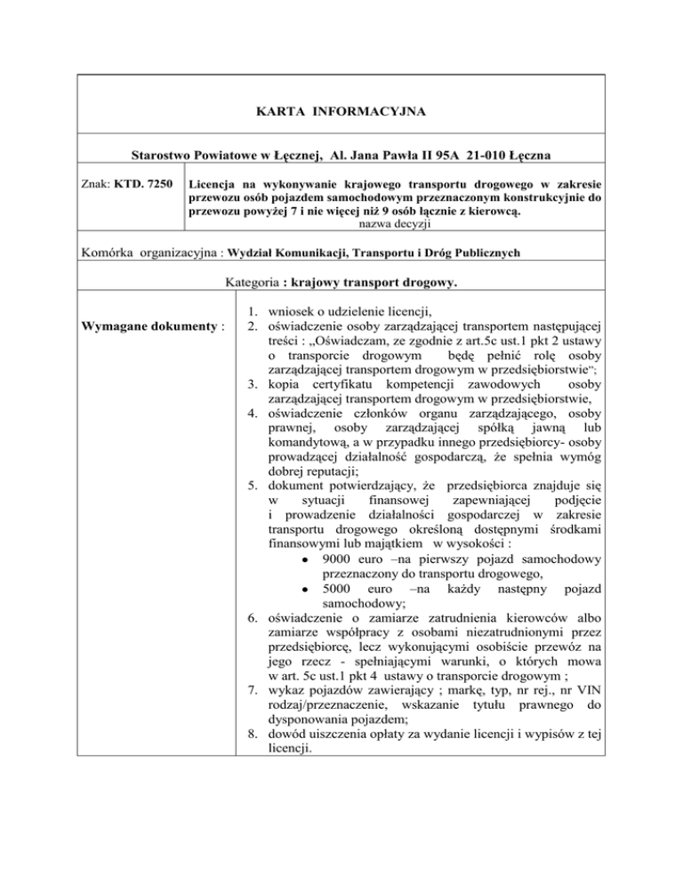 KARTA INFORMACYJNA Starostwo Powiatowe w Łęcznej, Al. Jana Pawła II 95A 21-010 Łęczna Znak: KTD. 7250 Licencja na wykonywanie krajowego transportu drogowego w zakresie przewozu osób pojazdem samochodowym przeznaczonym konstrukcyjnie do przewozu powyżej 7 i nie więcej niż 9 osób łącznie z kierowcą. nazwa decyzji Komórka organizacyjna : Wydział Komunikacji, Transportu i Dróg Publicznych Kategoria : krajowy transport drogowy. Wymagane dokumenty : 1. wniosek o udzielenie licencji, 2. oświadczenie osoby zarządzającej transportem następującej treści : „Oświadczam, ze zgodnie z art.5c ust.1 pkt 2 ustawy o transporcie drogowym będę pełnić rolę osoby zarządzającej transportem drogowym w przedsiębiorstwie”; 3. kopia certyfikatu kompetencji zawodowych osoby zarządzającej transportem drogowym w przedsiębiorstwie, 4. oświadczenie członków organu zarządzającego, osoby prawnej, osoby zarządzającej spółką jawną lub komandytową, a w przypadku innego przedsiębiorcy- osoby prowadzącej działalność gospodarczą, że spełnia wymóg dobrej reputacji; 5. dokument potwierdzający, że przedsiębiorca znajduje się w sytuacji finansowej zapewniającej podjęcie i prowadzenie działalności gospodarczej w zakresie transportu drogowego określoną dostępnymi środkami finansowymi lub majątkiem w wysokości : 9000 euro –na pierwszy pojazd samochodowy przeznaczony do transportu drogowego, 5000 euro –na każdy następny pojazd samochodowy; 6. oświadczenie o zamiarze zatrudnienia kierowców albo zamiarze współpracy z osobami niezatrudnionymi przez przedsiębiorcę, lecz wykonującymi osobiście przewóz na jego rzecz - spełniającymi warunki, o których mowa w art. 5c ust.1 pkt 4 ustawy o transporcie drogowym ; 7. wykaz pojazdów zawierający ; markę, typ, nr rej., nr VIN rodzaj/przeznaczenie, wskazanie tytułu prawnego do dysponowania pojazdem; 8. dowód uiszczenia opłaty za wydanie licencji i wypisów z tej licencji. 1. Opłata : za czynności administracyjne ( udzielenie licencji i wypisu z licencji) opłata wynikająca z rozporządzenia Ministra Transportu, Budownictwa i Gospodarki Morskiej z dnia 12 sierpnia 2013 r. w sprawie wysokości opłat za czynności administracyjne związane z wykonywaniem przewozu drogowego oraz za egzaminowanie i wydanie certyfikatu kompetencji zawodowych (Dz. U. , poz. 916). Opłatę należy wpłacić na konto: Starostwo Powiatowe w Łęcznej PKO BP S.A. O/ Łęczna Nr 86 1020 3206 0000 8102 0006 4444 Miejsce złożenia dokumentów : pokój nr 116, Termin załatwienia sprawy : nr tel. 81) 752 64 63 7 dni. Osoba odpowiedzialna za załatwienie sprawy : Sabina Mokijewska. Tryb odwoławczy : od decyzji przysługuje odwołanie do Samorządowego Kolegium Odwoławczego w Lublinie za pośrednictwem Starosty Łęczyńskiego w terminie 14 dni od dnia doręczenia decyzji. Podstawa prawna : 1. 2. 3. Ustawa z dnia 6 września 2001 r. – o transporcie drogowym (Dz. U. z 2013 r., poz. 1414). Ustawa z dnia 14 czerwca 1960 r.-Kodeks postępowania administracyjnego(Dz. U. z 2013 r., poz. 267). Rozporządzenie Ministra Transportu, Budownictwa i Gospodarki Morskiej z dnia 12 sierpnia 2013r. w sprawie wysokości opłat za czynności administracyjne związane z wykonywaniem przewozu drogowego oraz za egzaminowanie i wydanie certyfikatu kompetencji zawodowych (Dz. U. poz. 916).