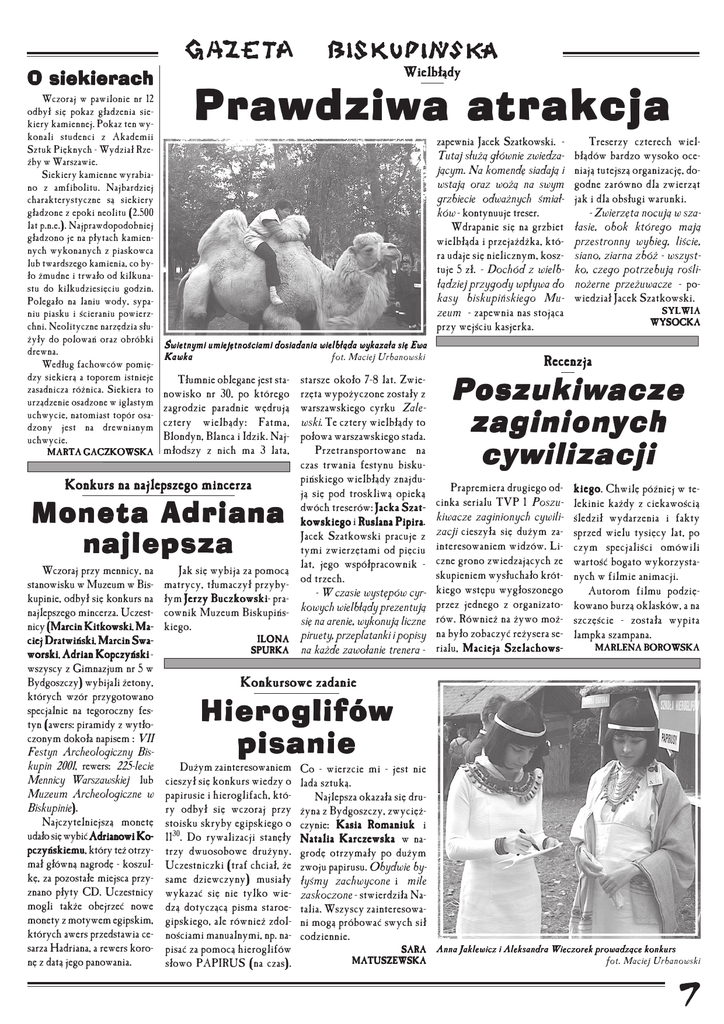 O siekierach Wczoraj w pawilonie nr 12 odbył się pokaz gładzenia sie− kiery kamiennej. Pokaz ten wy− konali studenci z Akademii Sztuk Pięknych − Wydział Rze− źby w Warszawie. Siekiery kamienne wyrabia− no z amfibolitu. Najbardziej charakterystyczne są siekiery gładzone z epoki neolitu (2.500 lat p.n.e.). Najprawdopodobniej gładzono je na płytach kamien− nych wykonanych z piaskowca lub twardszego kamienia, co by− ło żmudne i trwało od kilkuna− stu do kilkudziesięciu godzin. Polegało na laniu wody, sypa− niu piasku i ścieraniu powierz− chni. Neolityczne narzędzia słu− żyły do polowań oraz obróbki drewna. Według fachowców pomię− dzy siekierą a toporem istnieje zasadnicza różnica. Siekiera to urządzenie osadzone w iglastym uchwycie, natomiast topór osa− dzony jest na drewnianym uchwycie. MARTA GACZKOWSKA Wielbłądy Prawdziwa atrakcja zapewnia Jacek Szatkowski. − Tutaj służą głównie zwiedza− jącym. Na komendę siadają i wstają oraz wożą na swym grzbiecie odważnych śmiał− ków − kontynuuje treser. Wdrapanie się na grzbiet wielbłąda i przejażdżka, któ− ra udaje się nielicznym, kosz− tuje 5 zł. − Dochód z wielb− łądziej przygody wpływa do kasy biskupińskiego Mu− zeum − zapewnia nas stojąca przy wejściu kasjerka. Świetnymi umiejętnościami dosiadania wielbłąda wykazała się Ewa Kawka fot. Maciej Urbanowski Tłumnie oblegane jest sta− nowisko nr 30, po którego zagrodzie paradnie wędrują cztery wielbądy: Fatma, Blondyn, Blanca i Idzik. Naj− młodszy z nich ma 3 lata, Konkurs na najlepszego mincerza Moneta Adriana najlepsza Wczoraj przy mennicy, na stanowisku w Muzeum w Bis− kupinie, odbył się konkurs na najlepszego mincerza. Uczest− Marcin Kitkowski nicy (Marcin Kitkowski, Ma− ciej Dratwiński Dratwiński, Marcin Swa− worski worski, Adrian Kopczyński − wszyscy z Gimnazjum nr 5 w Bydgoszczy) wybijali żetony, których wzór przygotowano specjalnie na tegoroczny fes− tyn (awers: piramidy z wytło− czonym dokoła napisem : VII Festyn Archeologiczny Bis− kupin 2001, rewers: 225−lecie Mennicy Warszawskiej lub Muzeum Archeologiczne w Biskupinie). Najczytelniejszą monetę udało się wybić Adrianowi Ko− pczyńskiemu pczyńskiemu, który też otrzy− mał główną nagrodę − koszul− kę, za pozostałe miejsca przy− znano płyty CD. Uczestnicy mogli także obejrzeć nowe monety z motywem egipskim, których awers przedstawia ce− sarza Hadriana, a rewers koro− nę z datą jego panowania. Jak się wybija za pomocą matrycy, tłumaczył przyby− łym Jerzy Buczkowski Buczkowski− pra− cownik Muzeum Biskupińs− kiego. ILONA SPURKA starsze około 7−8 lat. Zwie− rzęta wypożyczone zostały z warszawskiego cyrku Zale− wski. Te cztery wielbłądy to połowa warszawskiego stada. Przetransportowane na czas trwania festynu bisku− pińskiego wielbłądy znajdu− ją się pod troskliwą opieką dwóch treserów: Jacka Szat− kowskiego i Ruslana Pipira Pipira. Jacek Szatkowski pracuje z tymi zwierzętami od pięciu lat, jego współpracownik − od trzech. − W czasie występów cyr− kowych wielbłądy prezentują się na arenie, wykonują liczne piruety, przeplatanki i popisy na każde zawołanie trenera − Treserzy czterech wiel− błądów bardzo wysoko oce− niają tutejszą organizację, do− godne zarówno dla zwierząt jak i dla obsługi warunki. − Zwierzęta nocują w sza− łasie, obok którego mają przestronny wybieg, liście, siano, ziarna zbóż − wszyst− ko, czego potrzebują rośli− nożerne przeżuwacze − po− wiedział Jacek Szatkowski. SYLWIA WYSOCKA Recenzja Poszukiwacze zaginionych cywilizacji Prapremiera drugiego od− cinka serialu TVP 1 Poszu− kiwacze zaginionych cywili− zacji cieszyła się dużym za− interesowaniem widzów. Li− czne grono zwiedzających ze skupieniem wysłuchało krót− kiego wstępu wygłoszonego przez jednego z organizato− rów. Również na żywo moż− na było zobaczyć reżysera se− rialu, Macieja Szelachows− kiego kiego. Chwilę później w te− lekinie każdy z ciekawością śledził wydarzenia i fakty sprzed wielu tysięcy lat, po czym specjaliści omówili wartość bogato wykorzysta− nych w filmie animacji. Autorom filmu podzię− kowano burzą oklasków, a na szczęście − została wypita lampka szampana. MARLENA BOROWSKA Konkursowe zadanie Hieroglifów pisanie Dużym zainteresowaniem cieszył się konkurs wiedzy o papirusie i hieroglifach, któ− ry odbył się wczoraj przy stoisku skryby egipskiego o 1130. Do rywalizacji stanęły trzy dwuosobowe drużyny. Uczestniczki (traf chciał, że same dziewczyny) musiały wykazać się nie tylko wie− dzą dotyczącą pisma staroe− gipskiego, ale również zdol− nościami manualnymi, np. na− pisać za pomocą hieroglifów słowo PAPIRUS (na czas). Co − wierzcie mi − jest nie lada sztuką. Najlepsza okazała się dru− żyna z Bydgoszczy, zwycięż− czynie: Kasia Romaniuk i Natalia Karczewska w na− grodę otrzymały po dużym zwoju papirusu. Obydwie by− łyśmy zachwycone i mile zaskoczone − stwierdziła Na− talia. Wszyscy zainteresowa− ni mogą próbować swych sił codziennie. SARA Anna Jaklewicz i Aleksandra Wieczorek prowadzące konkurs MATUSZEWSKA fot. Maciej Urbanowski