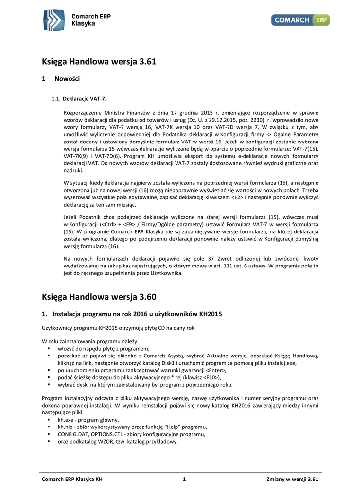 Księga Handlowa wersja 3.61 1 Nowości 1.1. Deklaracje VAT-7. Rozporządzenie Ministra Finansów z dnia 17 grudnia 2015 r. zmieniające rozporządzenie w sprawie wzorów deklaracji dla podatku od towarów i usług (Dz. U. z 29.12.2015, poz. 2230) r. wprowadziło nowe wzory formularzy VAT-7 wersja 16, VAT-7K wersja 10 oraz VAT-7D wersja 7. W związku z tym, aby umożliwić wyliczenie odpowiedniej dla Podatnika deklaracji w Konfiguracji firmy -> Ogólne Parametry został dodany i ustawiony domyślnie formularz VAT w wersji 16. Jeżeli w konfiguracji zostanie wybrana wersja formularza 15 wówczas deklaracje wyliczane będą w oparciu o poprzednie formularze: VAT-7(15), VAT-7K(9) i VAT-7D(6). Program KH umożliwia eksport do systemu e-deklaracje nowych formularzy deklaracji VAT. Do nowych wzorów deklaracji VAT-7 zostały dostosowane również wydruki graficzne oraz nadruki. W sytuacji kiedy deklaracja najpierw została wyliczona na poprzedniej wersji formularza (15), a następnie otworzona już na nowej wersji (16) mogą niepoprawnie wyświetlać się wartości w nowych polach. Trzeba wyzerować wszystkie pola edytowalne, zapisać deklarację klawiszem <F2> i następnie ponownie wyliczyć deklarację za ten sam miesiąc. Jeżeli Podatnik chce podejrzeć deklaracje wyliczone na starej wersji formularza (15), wówczas musi w Konfiguracji (<Ctrl> + <F9> / Firmy/Ogólne parametry) ustawić Formularz VAT-7 w wersji formularza (15). W programie Comarch ERP Klasyka nie są zapamiętywane wersje formularza, na której deklaracja została wyliczona, dlatego po podejrzeniu deklaracji ponownie należy ustawić w Konfiguracji domyślną wersję formularza (16). Na nowych formularzach deklaracji pojawiło się pole 37 Zwrot odliczonej lub zwróconej kwoty wydatkowanej na zakup kas rejestrujących, o którym mowa w art. 111 ust. 6 ustawy. W programie pole to jest do ręcznego uzupełnienia przez Użytkownika. Księga Handlowa wersja 3.60 1. Instalacja programu na rok 2016 u użytkowników KH2015 Użytkownicy programu KH2015 otrzymują płytę CD na dany rok. W celu zainstalowania programu należy: włożyć do napędu płytę z programem, poczekać aż pojawi się okienko z Comarch Asystą, wybrać Aktualne wersje, odszukać Księgę Handlową, kliknąć na link, następnie otworzyć katalog Disk1 i uruchomić program za pomocą pliku instaluj.exe, po uruchomieniu programu zaakceptować warunki gwarancji <Enter>, podać ścieżkę dostępu do pliku aktywacyjnego *.rej (klawisz <F10>), wybrać dysk, na którym zainstalowany był program z poprzedniego roku. Program instalacyjny odczyta z pliku aktywacyjnego wersję, nazwę użytkownika i numer seryjny programu oraz dokona poprawnej instalacji. W wyniku reinstalacji pojawi się nowy katalog KH2016 zawierający miedzy innymi następujące pliki: kh.exe - program główny, kh.hlp - zbiór wykorzystywany przez funkcję “Help” programu, CONFIG.DAT, OPTIONS.CTL - zbiory konfiguracyjne programu, oraz podkatalog WZOR, tzw. katalog przykładowy. Comarch ERP Klasyka KH 1 Zmiany w wersji 3.61 Uwaga: Po zainstalowaniu programu KH2016, oprócz nowego katalogu KH2016 na dysku zostaną katalogi z lat poprzednich KH2015 itp., z których to katalogów należy uruchamiać odpowiednio program Księga Handlowa, aby mieć dostęp do danych z lat poprzednich. 2. Import z programu KH2015 Użytkownicy programu KH2016 mają możliwość dokonać importu danych z konfiguracji programu oraz „stałych” danych o firmie, takich jak plan kont, pieczątka firmy, wzorce księgowań, ewidencja środków trwałych, salda kont itp. Import możliwy jest z: KHStd 2015 do KHStd 2016 KHStd 2015 do KHC/S 2016 KHC/S 2015 do KHC/S 2016 KHStd 2016 do KHStd 2016 KHC/S 2016 do KHC/S 2016 Nie ma możliwości importu danych z: KHC/S 2015 do KHStd 2016 KHC/S 2016 do KHStd 2016 KHStd 2016 do KHC/S 2016 W celu dokonania importu danych z KH2015 należy uruchomić w KH2016 Funkcje specjalne, a następnie wybrać Import. W ramach importu można dokonać: 2.1. Import konfiguracji Funkcja ta z bazy danych roku 2015 przenosi nazwy katalogów oraz kody i nazwy operatorów. Po uruchomieniu funkcji import konfiguracji należy podać oznaczenie dysku, na którym znajduje się katalog KH z danymi roku 2015. Parametr “Kopiować listę katalogów” uaktywnia się klawiszem <TAB>, odpowiada za przepisanie nazw katalogów, które istniały w bazie danych roku 2015. Ponadto w opcji tej przenoszona jest konfiguracja stanowiska, która się uaktualnia w przypadku wersji C/S po ponownym wejściu do programu. 2.2. Import danych Po uruchomieniu funkcji import danych pojawia się okno, w którym należy wybrać opcję KH2015 (znaczy to, że import dotyczy danych z 2015r.), następnie podać nazwę firmy, z której zostaną zaimportowane dane (klawiszem <TAB> można wyświetlić listę dostępnych firm). Po wybraniu nazwy firmy zostanie automatycznie wypełnione pole Katalog. Następnie, należy zaznaczyć, które dane mają zostać przeniesione. Zaznaczenia dokonujemy za pomocą klawisza <TAB>. Możliwe do zaznaczenia są następujące opcje: 2.2.1 Słowniki W ramach słowników można zaimportować: konta syntetyczne - wszystkie konta syntetyczne, konta analityczne - wszystkie konta analityczne, Jeżeli chcemy dokonać zmiany numeru konta podczas importu planu kont należy w pierwszej kolejności nacisnąć klawisz <F3> i zmienić numer konta. Dzięki tej opcji użytkownik ma możliwość przeniesienia BO z jednego konta na inne. kontrahentów - import listy kontrahentów oraz grup kontrahentów, księgę inwentarzową - import listy środków trwałych i ewidencji wartości niematerialnych i prawnych. Comarch ERP Klasyka KH 2 Zmiany w wersji 3.61 W trakcie importu karty środka trwałego uaktualniane są takie informacje jak: wartość na początek okresu - jako wartość na początek okresu w 2015r. zwiększona o zapisy w historii środka trwałego umorzenia za okres ubiegły - wyliczone jako umorzenia za okres 