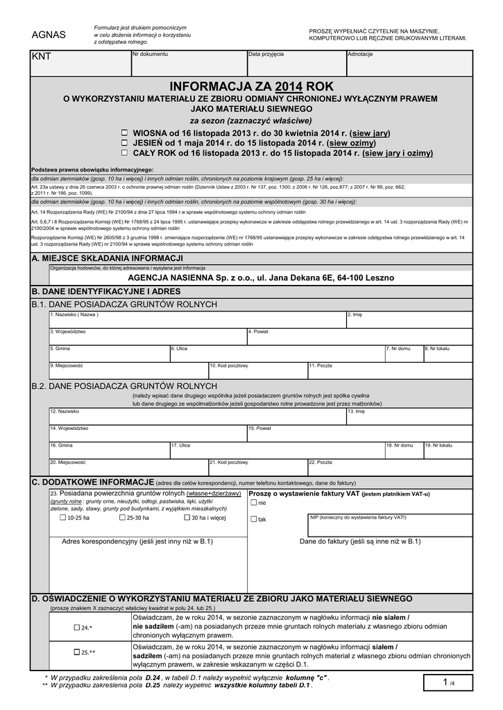 Formularz jest drukiem pomocniczym w celu złożenia informacji o korzystaniu z odstępstwa rolnego. AGNAS PROSZĘ WYPEŁNIAĆ CZYTELNIE NA MASZYNIE, KOMPUTEROWO LUB RĘCZNIE DRUKOWANYMI LITERAMI. Data przyjęcia Nr dokumentu KNT Adnotacje INFORMACJA ZA 2014 ROK O WYKORZYSTANIU MATERIAŁU ZE ZBIORU ODMIANY CHRONIONEJ WYŁĄCZNYM PRAWEM JAKO MATERIAŁU SIEWNEGO za sezon (zaznaczyć właściwe) WIOSNA od 16 listopada 2013 r. do 30 kwietnia 2014 r. (siew jary) JESIEŃ od 1 maja 2014 r. do 15 listopada 2014 r. (siew ozimy) CAŁY ROK od 16 listopada 2013 r. do 15 listopada 2014 r. (siew jary i ozimy) Podstawa prawna obowiązku informacyjnego: dla odmian ziemniaków (gosp. 10 ha i więcej) i innych odmian roślin, chronionych na poziomie krajowym (gosp. 25 ha i więcej): Art. 23a ustawy z dnia 26 czerwca 2003 r. o ochronie prawnej odmian roślin (Dziennik Ustaw z 2003 r. Nr 137, poz. 1300; z 2006 r. Nr 126, poz.877; z 2007 r. Nr 99, poz. 662; z 2011 r. Nr 186, poz. 1099). dla odmian ziemniaków (gosp. 10 ha i więcej) i innych odmian roślin, chronionych na poziomie wspólnotowym (gosp. 30 ha i więcej): Art. 14 Rozporządzenia Rady (WE) Nr 2100/94 z dnia 27 lipca 1994 r.w sprawie wspólnotowego systemu ochrony odmian roślin Art. 5,6,7 i 8 Rozporządzenia Komisji (WE) Nr 1768/95 z 24 lipca 1995 r. ustanawiające przepisy wykonawcze w zakresie odstępstwa rolnego przewidzianego w art. 14 ust. 3 rozporządzenia Rady (WE) nr 2100/2004 w sprawie wspólnotowego systemu ochrony odmian roślin Rozporządzenie Komisji (WE) Nr 2605/98 z 3 grudnia 1998 r. zmieniające rozporządzenie (WE) nr 1768/95 ustanawiające przepisy wykonawcze w zakresie odstępstwa rolnego przewidzianego w art. 14 ust. 3 rozporządzenia Rady (WE) nr 2100/94 w sprawie wspólnotowego systemu ochrony odmian roślin A. MIEJSCE SKŁADANIA INFORMACJI Organizacja hodowców, do której adresowana i wysyłana jest informacja AGENCJA NASIENNA Sp. z o.o., ul. Jana Dekana 6E, 64-100 Leszno B. DANE IDENTYFIKACYJNE I ADRES B.1. DANE POSIADACZA GRUNTÓW ROLNYCH 2. Imię 1. Nazwisko ( Nazwa ) 3. Województwo 4. Powiat 5. Gmina 6. Ulica 9. Miejscowość 10. Kod pocztowy 7. Nr domu 8. Nr lokalu 18. Nr domu 19. Nr lokalu 11. Poczta B.2. DANE POSIADACZA GRUNTÓW ROLNYCH (należy wpisać dane drugiego wspólnika jeżeli posiadaczem gruntów rolnych jest spółka cywilna lub dane drugiego ze współmałżonków jeżeli gospodarstwo rolne prowadzone jest przez małżonków) 13. Imię 12. Nazwisko 14. Województwo 15. Powiat 16. Gmina 17. Ulica 20. Miejscowość 21. Kod pocztowy 22. Poczta C. DODATKOWE INFORMACJE (adres dla celów korespondencji, numer telefonu kontaktowego, dane do faktury) 23. Posiadana powierzchnia gruntów rolnych (własne+dzierżawy) (grunty rolne : grunty orne, nieużytki, odłogi, pastwiska, łąki, użytki zielone, sady, stawy, grunty pod budynkami, z wyjątkiem mieszkalnych) 10-25 ha 25-30 ha 30 ha i więcej Adres korespondencyjny (jeśli jest inny niż w B.1) Proszę o wystawienie faktury VAT (jestem płatnikiem VAT-u) nie tak NIP (konieczny do wystawienia faktury VAT!) Dane do faktury (jeśli są inne niż w B.1) D. OŚWIADCZENIE O WYKORZYSTANIU MATERIAŁU ZE ZBIORU JAKO MATERIAŁU SIEWNEGO (proszę znakiem X zaznaczyć właściwy kwadrat w polu 24. lub 25.) 24.* 25.** Oświadczam, że w roku 2014, w sezonie zaznaczonym w nagłówku informacji nie siałem / nie sadziłem (-am) na posiadanych przeze mnie gruntach rolnych materiału z własnego zbioru odmian chronionych wyłącznym prawem. Oświadczam, że w roku 2014, w sezonie zaznaczonym w nagłówku informacji siałem / sadziłem (-am) na posiadanych przeze mnie gruntach rolnych materiał z własnego zbioru odmian chronionych wyłącznym prawem, w zakresie wskazanym w części D.1. * W przypadku zakreślenia pola D.24 , w tabeli D.1 należy wypełnić wyłącznie kolumnę "c" . ** W przypadku zakreślenia pola D.25 należy wypełnić wszystkie kolumny tabeli D.1 . 1 /4 MATERIAŁ Z WŁASNEGO ZBIORU AGNAS D.1. ZAKRES WYKORZYSTANIA DO SIEWU MATERIAŁU Z WŁASNEGO ZBIORU ODMIAN CHRONIONYCH WYŁĄCZNYM PRAWEM w zaznaczonym sezonie 2014 r. (odmiany z Zał. nr 1 i/lub 2) Miesiąc i rok siewu lub sadzenia a Nazwa odmiany (spośród wymienionych w Załącznikach nr 1, 2 i 3) gdy powierzchnia gruntów rolnych wynosi: 10-25 ha: tylko Zał. nr 3 25-30 ha: Zał. nr 1 i 3 30 ha i więcej: Zał. 1, 2 i 3 b Numer działki rolnej i jej położenie c Ilość materiału ze zbioru wykorzystana do siewu Powierzchnia gruntów obsianych materiałem ze zbioru kg ha d e Stawka opłaty za 1 kg materiału użytego do siewu zł. gr. f Wartość netto należnej opłaty =kolumna d * f zł. Dane przetwórcy - innej osoby lub firmy, która wyczyściła, przesortowała lub zaprawiła materiał ze zbioru. Jeśli materiał został przygotowany do siewu samodzielnie - proszę wpisać "we własnym zakresie" Nazwisko i imię lub nazwa przetwórcy Adres zamieszkania lub siedziby przetwórcy gr. g h i D.1a. ZAKRES WYKORZYSTANIA SADZENIAKÓW Z WŁASNEGO ZBIORU ODMIAN ZIEMNIAKA, CHRONIONYCH WYŁĄCZNYM PRAWEM (odmiany z Zał. nr 3) D.2. ŁĄCZNA KWOTA OPŁAT ZA WYKORZYSTANIE DO SIEWU MATERIAŁU ZE ZBIORU ODMIAN CHRONIONYCH WYŁĄCZNYM PRAWEM Łączna kwota opłat netto (suma kwot z kolumny g.) 2-3 /4 Łączna kwota opłat brutto (powiększona o 23%VAT) Jeżeli odliczasz podatek VAT, pamiętaj o wpisaniu nr NIP w części C na 1 str. formularza AGNAS! AGNAS MATERIAŁ KWALIFIKOWANY LUB LICENCJONOWANY D.3. DANE ZBYWCY KWALIFIKOWANEGO MATERIAŁU SIEWNEGO / SADZENIAKÓW wykorzystanego w zaznaczonym sezonie 2014 roku Miesiąc i rok siewu lub sadzenia Nazwa odmiany a b Ilość kupionego materiału kwalifikowanego Nazwisko i imię lub nazwa sprzedawcy Adres zamieszkania lub siedziby sprzedawcy d e kg c E. DATA I PODPIS POSIADACZA (POSIADACZY) GRUNTÓW ROLNYCH LUB OSOBY UPOWAŻNIONEJ DO REPREZENTOWANIA POSIADACZA GRUNTÓW ROLNYCH Oświadczam, że jestem świadomy odpowiedzialności karnej za udzielenie przeze mnie informa