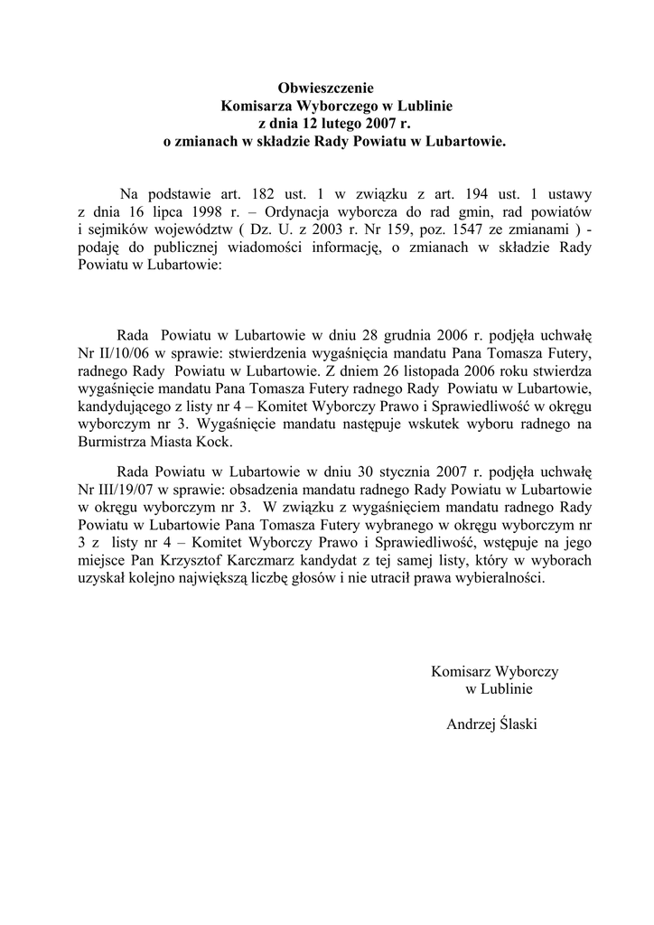 Obwieszczenie Komisarza Wyborczego w Lublinie z dnia 12 lutego 2007 r. o zmianach w składzie Rady Powiatu w Lubartowie. Na podstawie art. 182 ust. 1 w związku z art. 194 ust. 1 ustawy z dnia 16 lipca 1998 r. – Ordynacja wyborcza do rad gmin, rad powiatów i sejmików województw ( Dz. U. z 2003 r. Nr 159, poz. 1547 ze zmianami ) podaję do publicznej wiadomości informację, o zmianach w składzie Rady Powiatu w Lubartowie: Rada Powiatu w Lubartowie w dniu 28 grudnia 2006 r. podjęła uchwałę Nr II/10/06 w sprawie: stwierdzenia wygaśnięcia mandatu Pana Tomasza Futery, radnego Rady Powiatu w Lubartowie. Z dniem 26 listopada 2006 roku stwierdza wygaśnięcie mandatu Pana Tomasza Futery radnego Rady Powiatu w Lubartowie, kandydującego z listy nr 4 – Komitet Wyborczy Prawo i Sprawiedliwość w okręgu wyborczym nr 3. Wygaśnięcie mandatu następuje wskutek wyboru radnego na Burmistrza Miasta Kock. Rada Powiatu w Lubartowie w dniu 30 stycznia 2007 r. podjęła uchwałę Nr III/19/07 w sprawie: obsadzenia mandatu radnego Rady Powiatu w Lubartowie w okręgu wyborczym nr 3. W związku z wygaśnięciem mandatu radnego Rady Powiatu w Lubartowie Pana Tomasza Futery wybranego w okręgu wyborczym nr 3 z listy nr 4 – Komitet Wyborczy Prawo i Sprawiedliwość, wstępuje na jego miejsce Pan Krzysztof Karczmarz kandydat z tej samej listy, który w wyborach uzyskał kolejno największą liczbę głosów i nie utracił prawa wybieralności. Komisarz Wyborczy w Lublinie Andrzej Ślaski