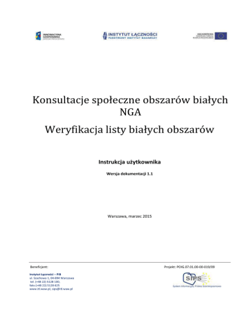 Konsultacje społeczne obszarów białych NGA Weryfikacja listy białych obszarów Instrukcja użytkownika Wersja dokumentacji 1.1 Warszawa, marzec 2015 Beneficjent: Instytut Łączności – PIB ul. Szachowa 1, 04-894 Warszawa tel. (+48 22) 5128 100, faks (+48 22) 5128 625 www.itl.waw.pl, [email protected] Projekt: POIG.07.01.00-00-019/09 Spis treści 1 Podstawowe informacje .......................................................................................................................3 2 Podstawa prawna i definicje .................................................................................................................4 3 System konsultacji społecznych punktów adresowych ...........................................................................6 3.1 Rejestracja i logowanie ............................................................................................................................. 6 3.2 Konsultacje punktów adresowych ............................................................................................................ 9 3.3 Mapa punktów adresowych.................................................................................................................... 12 Instrukcja użytkownika 2 / 12 1 PODSTAWOWE INFORMACJE Celem konsultacji jest określenie listy białych obszarów NGA, które będą stanowiły potencjalny obszar do interwencji w ramach Programu Operacyjnego Polska Cyfrowa (PO PC). Obszary interwencji zostaną wyznaczone do 31 sierpnia 2015 r. Konsultacje społeczne odbywać się będą poprzez: · · weryfikację „białych obszarów NGA” do poziomu adresów budynków, zebranie trzyletnich planów inwestycyjnych w zakresie infrastruktury szerokopasmowej NGA przy użyciu Systemu Informacyjnego o Infrastrukturze Szerokopasmowej (SIIS) Weryfikacja „białych obszarów NGA” do poziomu adresów budynków odbywa się na stronie systemu konsultacji społecznych: https://konsultacje.itl.waw.pl. Zbieranie planów inwestycyjnych na 3 lata przy użyciu systemu SIIS odbywa się na stronie: https://form.teleinfrastruktura.gov.pl/. Konsultacje trwają od 16 marca 2015 roku do 15 maja 2015 roku. W otwartych konsultacjach społecznych „białych obszarów NGA” do poziomu poszczególnych adresów budynków mogą wziąć udział osoby fizyczne (obywatele) i osoby prawne (np. przedsiębiorstwa). Konsultacje społeczne „białych obszarów NGA” prowadzone są przez Ministerstwo Administracji i Cyfryzacji. W drodze konsultacji weryfikowana jest klasyfikacja adresów „białych obszarów NGA”. Baza adresów „białych obszarów NGA” została opracowana na podstawie danych pozyskanych w ramach inwentaryzacji infrastruktury telekomunikacyjnej Prezesa Urzędu Komunikacji Elektronicznej przeprowadzonej w 2014 r. Współrzędne geograficzne do zlokalizowania adresów zostały pobrane z Państwowego Rejestru Granic prowadzonego przez Głównego Geodetę Kraju. Uwzględnione zostały również dane w zakresie obszarów, w których realizowane są inwestycje w sieci dostępowe NGA, o przepływności co najmniej 30 Mb/s, w ramach programów operacyjnych współfinansowanych ze środków unijnych perspektywy finansowej 2007-2013. Zgłoszone plany inwestycyjne będą podlegać analizie w terminie do końca czerwca 2015 r. Analizę przeprowadzi zespół międzyinstytucjonalny, w którego skład wejdą przedstawiciele MAiC, UKE, WWPE i IŁ. Plany inwestycyjne będą oceniane w oparciu o przekazane dane i dokumenty. Zespół oceniający plany inwestycyjne będzie mógł zwrócić się do podmiotu zgłaszającego plany o dodatkowe wyjaśnienia i dokumenty dotyczące planowanej inwestycji. Konsultacje obejmują inwestycje planowane na lata 20152018. Instrukcja użytkownika 3 / 12 Wiarygodne plany inwestycyjne powodują wykluczenie obszaru z możliwości otrzymania dofinansowania w ramach PO PC. 2 PODSTAWA PRAWNA I DEFINICJE Podstawą prawną konsultacji jest art. 52 ust. 3 Rozporządzenia Komisji (UE) NR 651/2014 z dnia 17 czerwca 2014 r. uznającego niektóre rodzaje pomocy za zgodne z rynkiem wewnętrznym w zastosowaniu art. 107 i 108 Traktatu, zgodnie z którym: Inwestycje współfinansowane ze środków publicznych mogą być zlokalizowane tylko w obszarach, gdzie infrastruktura danego rodzaju (podstawowe sieci szerokopasmowe lub sieci NGA) nie istnieje i nie są planowane komercyjne inwestycje w tym zakresie w ciągu trzech lat od daty opublikowania planowanego środka pomocy. Białe obszary NGA - punkty adresowe, w których na podstawie najbardziej aktualnych dostępnych danych nie występują sieci NGA umożliwiające świadczenie usługi dostępu do Internetu o przepustowości co najmniej 30 Mbit/s. Sieci NGA - zaawansowane sieci, które posiadają co najmniej następujące cechy: a) dostarczają w sposób niezawodny usługi o bardzo dużej szybkości przypadającej na abonenta, za pomocą światłowodowego łącza dosyłowego (lub z wykorzystaniem równoważnej technologii), które znajduje się na tyle blisko lokalu użytkownika, aby gwarantować rzeczywistą bardzo wysoką szybkość transmisji, b) umożliwiają świadczenie szeregu zaawansowanych usług cyfrowych, w tym usług konwergentnych opartych wyłącznie na protokole IP, c) zapewniają znacznie wyższe szybkości wysyłania w porównaniu z podstawowymi sieciami szerokopasmowymi. Na obecnym etapie rozwoju sieci telekomunikacyjnych są to: 1. światłowodowe sieci dostępowe (FTTx), 2. zaawansowane - unowocześnione sieci kablowe, 3. niektóre zaawansowane bezprzewodowe sieci dostępowe, przy zachowaniu odpowiedniego stopnia zagęszczenia i/lub z zaawansowanymi konfiguracjami (takimi jak dedykowane anteny lub systemy wieloantenowe). W zaawansowanej sieci bezprzewodowej dostęp następnej generacji oparty na dostosowanej do warunków mobilnej technologii szerokopasmowej musi także zapewniać wymaganą jakość usług dla użytkowników w określonej lokalizacji jednocześnie obsługu