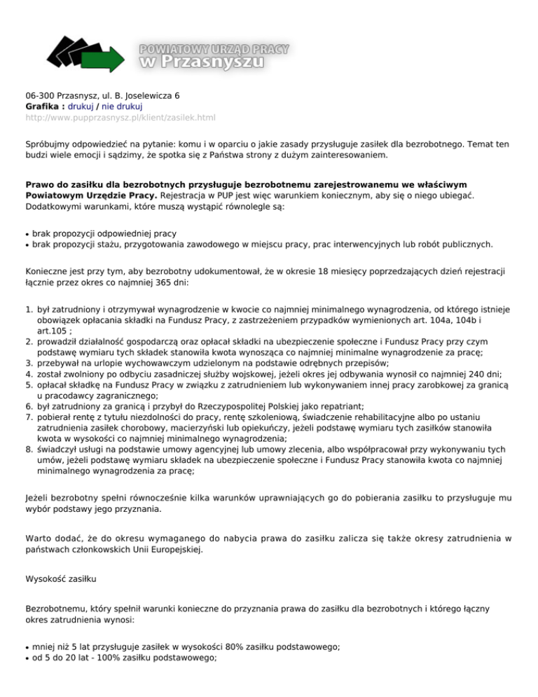 06-300 Przasnysz, ul. B. Joselewicza 6 Grafika : drukuj / nie drukuj http://www.pupprzasnysz.pl/klient/zasilek.html Spróbujmy odpowiedzieć na pytanie: komu i w oparciu o jakie zasady przysługuje zasiłek dla bezrobotnego. Temat ten budzi wiele emocji i sądzimy, że spotka się z Państwa strony z dużym zainteresowaniem. Prawo do zasiłku dla bezrobotnych przysługuje bezrobotnemu zarejestrowanemu we właściwym Powiatowym Urzędzie Pracy. Rejestracja w PUP jest więc warunkiem koniecznym, aby się o niego ubiegać. Dodatkowymi warunkami, które muszą wystąpić równolegle są: ● ● brak propozycji odpowiedniej pracy brak propozycji stażu, przygotowania zawodowego w miejscu pracy, prac interwencyjnych lub robót publicznych. Konieczne jest przy tym, aby bezrobotny udokumentował, że w okresie 18 miesięcy poprzedzających dzień rejestracji łącznie przez okres co najmniej 365 dni: 1. był zatrudniony i otrzymywał wynagrodzenie w kwocie co najmniej minimalnego wynagrodzenia, od którego istnieje obowiązek opłacania składki na Fundusz Pracy, z zastrzeżeniem przypadków wymienionych art. 104a, 104b i art.105 ; 2. prowadził działalność gospodarczą oraz opłacał składki na ubezpieczenie społeczne i Fundusz Pracy przy czym podstawę wymiaru tych składek stanowiła kwota wynosząca co najmniej minimalne wynagrodzenie za pracę; 3. przebywał na urlopie wychowawczym udzielonym na podstawie odrębnych przepisów; 4. został zwolniony po odbyciu zasadniczej służby wojskowej, jeżeli okres jej odbywania wynosił co najmniej 240 dni; 5. opłacał składkę na Fundusz Pracy w związku z zatrudnieniem lub wykonywaniem innej pracy zarobkowej za granicą u pracodawcy zagranicznego; 6. był zatrudniony za granicą i przybył do Rzeczypospolitej Polskiej jako repatriant; 7. pobierał rentę z tytułu niezdolności do pracy, rentę szkoleniową, świadczenie rehabilitacyjne albo po ustaniu zatrudnienia zasiłek chorobowy, macierzyński lub opiekuńczy, jeżeli podstawę wymiaru tych zasiłków stanowiła kwota w wysokości co najmniej minimalnego wynagrodzenia; 8. świadczył usługi na podstawie umowy agencyjnej lub umowy zlecenia, albo współpracował przy wykonywaniu tych umów, jeżeli podstawę wymiaru składek na ubezpieczenie społeczne i Fundusz Pracy stanowiła kwota co najmniej minimalnego wynagrodzenia za pracę; Jeżeli bezrobotny spełni równocześnie kilka warunków uprawniających go do pobierania zasiłku to przysługuje mu wybór podstawy jego przyznania. Warto dodać, że do okresu wymaganego do nabycia prawa do zasiłku zalicza się także okresy zatrudnienia w państwach członkowskich Unii Europejskiej. Wysokość zasiłku Bezrobotnemu, który spełnił warunki konieczne do przyznania prawa do zasiłku dla bezrobotnych i którego łączny okres zatrudnienia wynosi: ● ● mniej niż 5 lat przysługuje zasiłek w wysokości 80% zasiłku podstawowego; od 5 do 20 lat - 100% zasiłku podstawowego; ● co najmniej 20 lat - 120% zasiłku podstawowego.
