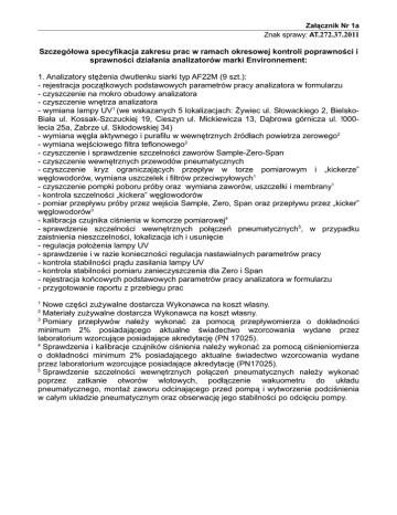 Załącznik Nr 1a Znak sprawy: AT.272.37.2011 Szczegółowa specyfikacja zakresu prac w ramach okresowej kontroli poprawności i sprawności działania analizatorów marki Environnement: 1. Analizatory stężenia dwutlenku siarki typ AF22M (9 szt.): - rejestracja początkowych podstawowych parametrów pracy analizatora w formularzu - czyszczenie na mokro obudowy analizatora - czyszczenie wnętrza analizatora - wymiana lampy UV1 (we wskazanych 5 lokalizacjach: Żywiec ul. Słowackiego 2, BielskoBiała ul. Kossak-Szczuckiej 19, Cieszyn ul. Mickiewicza 13, Dąbrowa górnicza ul. !000lecia 25a, Zabrze ul. Skłodowskiej 34) - wymiana węgla aktywnego i purafilu w wewnętrznych źródłach powietrza zerowego2 - wymiana wejściowego filtra teflonowego2 - czyszczenie i sprawdzenie szczelności zaworów Sample-Zero-Span - czyszczenie wewnętrznych przewodów pneumatycznych - czyszczenie kryz ograniczających przepływ w torze pomiarowym i „kickerze” węglowodorów, wymiana uszczelek i filtrów przeciwpyłowych1 - czyszczenie pompki poboru próby oraz wymiana zaworów, uszczelki i membrany1 - kontrola szczelności „kickera” węglowodorów - pomiar przepływu próby przez wejścia Sample, Zero, Span oraz przepływu przez „kicker” węglowodorów3 - kalibracja czujnika ciśnienia w komorze pomiarowej4 - sprawdzenie szczelności wewnętrznych połączeń pneumatycznych5, w przypadku zaistnienia nieszczelności, lokalizacja ich i usunięcie - regulacja położenia lampy UV - sprawdzenie i w razie konieczności regulacja nastawialnych parametrów pracy - kontrola stabilności prądu zasilania lampy UV - kontrola stabilności pomiaru zanieczyszczenia dla Zero i Span - rejestracja końcowych podstawowych parametrów pracy analizatora w formularzu - przygotowanie raportu z przebiegu prac 1 Nowe części zużywalne dostarcza Wykonawca na koszt własny. Materiały zużywalne dostarcza Wykonawca na koszt własny. 3 Pomiary przepływów należy wykonać za pomocą przepływomierza o dokładności minimum 2% posiadającego aktualne świadectwo wzorcowania wydane przez laboratorium wzorcujące posiadające akredytację (PN 17025). 4 Sprawdzenia i kalibracje czujników ciśnienia należy wykonać za pomocą ciśnieniomierza o dokładności minimum 2% posiadającego aktualne świadectwo wzorcowania wydane przez laboratorium wzorcujące posiadające akredytację (PN17025). 5 Sprawdzenie szczelności wewnętrznych połączeń pneumatycznych należy wykonać poprzez zatkanie otworów wlotowych, podłączenie wakuometru do układu pneumatycznego, montaż zaworu odcinającego przed pompą i wytworzenie podciśnienia w całym układzie pneumatycznym oraz obserwację jego stabilności po odcięciu pompy. 2 Załącznik Nr 1a Znak sprawy: AT.272.37.2011 2. Analizatory stężenia tlenków azotu typ AC32M (7 szt.): - rejestracja początkowych podstawowych parametrów pracy analizatora w formularzu - czyszczenie na mokro obudowy analizatora - czyszczenie wnętrza analizatora - wymiana wejściowego filtra teflonowego2 - wymiana węgla aktywnego w filtrze ochronnym pompy poboru próby2 - czyszczenie i sprawdzenie szczelności zaworów Sample-Zero-Span, zaworu konwertera i zaworu reference - czyszczenie wewnętrznych przewodów pneumatycznych - czyszczenie komory pomiarowej - czyszczenie zwężek ograniczających przepływ w torach poboru próby i ozonu, wymiana uszczelek i filtrów przeciwpyłowych1 - czyszczenie elektrod generatora ozonu, wymiana uszczelek O-ring1 - czyszczenie pompki poboru próby oraz wymiana zaworów, uszczelki i membrany1 - kontrola szczelności osuszacza powietrza PERMA-PURE - wymiana filtra pyłowego DFU w osuszaczu powietrza PERMA-PURE2 - pomiar przepływu na wejściu do komory pomiarowej dla próby i ozonu3 - pomiar przepływu próby przez wejścia Sample, Zero, Span3 - kalibracja czujników ciśnienia w komorze pomiarowej i ciśnienia w torze poboru próby4 - sprawdzenie szczelności wewnętrznych połączeń pneumatycznych5, w przypadku zaistnienia nieszczelności, lokalizacja ich i usunięcie - sprawdzenie i w razie konieczności regulacja nastawialnych parametrów pracy - kontrola stabilności pomiaru zanieczyszczenia dla Zero i Span - rejestracja końcowych podstawowych parametrów pracy analizatora w formularzu - przygotowanie raportu z przebiegu prac 1 Nowe części zużywalne dostarcza Wykonawca na koszt własny. Materiały zużywalne dostarcza Wykonawca na koszt własny. 3 Pomiary przepływów należy wykonać za pomocą przepływomierza o dokładności minimum 2% posiadającego aktualne świadectwo wzorcowania wydane przez laboratorium wzorcujące posiadające akredytację (PN 17025). 4 Sprawdzenia i kalibracje czujników ciśnienia należy wykonać za pomocą ciśnieniomierza o dokładności minimum 2% posiadającego aktualne świadectwo wzorcowania wydane przez laboratorium wzorcujące posiadające akredytację (PN17025). 5 Sprawdzenie szczelności wewnętrznych połączeń pneumatycznych należy wykonać poprzez zatkanie otworów wlotowych, podłączenie wakuometru do układu pneumatycznego, montaż zaworu odcinającego przed pompą i wytworzenie podciśnienia w całym układzie pneumatycznym oraz obserwację jego stabilności po odcięciu pompy. 2 Załącznik Nr 1a Znak sprawy: AT.272.37.2011 3. Analizatory stężenia ozonu typ O342 (3 szt.): - rejestracja początkowych podstawowych parametrów pracy analizatora w formularzu - czyszczenie na mokro obudowy analizatora - czyszczenie wnętrza analizatora - wymiana lampy UV1 - wymiana filtra selektywnego (scrubera) ozonu na nowy1 - wymiana wejściowego filtra teflonowego2 - czyszczenie i sprawdzenie szczelności zaworów Sample-Zero-Span i zaworu przełączającego filtr selektywny (scrubber) - czyszczenie wewnętrznych przewodów pneumatycznych - czyszczenie komory pomiarowej - czyszczenie pompki poboru próby oraz wymiana zaworów, uszczelki i membrany1 - pomiar przepływu próby przez wejścia Sample, Zero, Span3 - kalibracja c