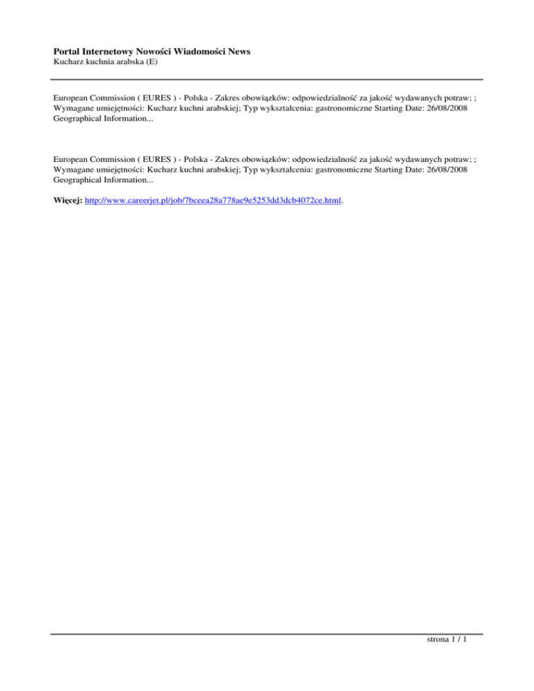 Portal Internetowy Nowości Wiadomości News Kucharz kuchnia arabska (E) European Commission ( EURES ) - Polska - Zakres obowiązków: odpowiedzialność za jakość wydawanych potraw; ; Wymagane umiejętności: Kucharz kuchni arabskiej; Typ wykształcenia: gastronomiczne Starting Date: 26/08/2008 Geographical Information... European Commission ( EURES ) - Polska - Zakres obowiązków: odpowiedzialność za jakość wydawanych potraw; ; Wymagane umiejętności: Kucharz kuchni arabskiej; Typ wykształcenia: gastronomiczne Starting Date: 26/08/2008 Geographical Information... Więcej: http://www.careerjet.pl/job/7bceea28a778ae9e5253dd3dcb4072ce.html. strona 1 / 1