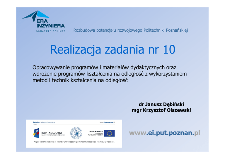 Rozbudowa potencjału rozwojowego Politechniki Poznańskiej Realizacja zadania nr 10 Opracowywanie programów i materiałów dydaktycznych oraz wdroŜenie programów kształcenia na odległość z wykorzystaniem metod i technik kształcenia na odległość dr Janusz Dębiński mgr Krzysztof Olszewski www.ei.put.poznan.pl Rozbudowa potencjału rozwojowego Politechniki Poznańskiej Realizacja zadania nr 10 Stworzenie zaplecza technicznego dla realizacji zadania nr 10: zakup i instalacja serwera; administrowanie serwerem; Szkolenie pracowników w zakresie teorii nauczania na odległość i praktycznego tworzenia kursów: objęło ok. 40 pracowników Politechniki Poznańskiej; przeprowadzone przez Pana Przemysława Stencla przy współudziale Pani Anny Stanisławskiej-Mischke; dla większość uczestników szkolenia pierwszy kontakt z nauczaniem na odległość; PowyŜsze działania stanowiły podstawę realizacji zadania nr 10 poprzez: stworzenie platformy do nauczania online przy Studium Języków Obcych PP; opracowanie kursów na platformie „Era InŜyniera” przygotowanych przez pracowników PP; www.ei.put.poznan.pl Rozbudowa potencjału rozwojowego Politechniki Poznańskiej Realizacja zadania nr 10 W ramach projektu „Era InŜyniera” powstała idea stworzenia platformy z kursami online dostępnymi dla studentów i pracowników PP. Realizacja tego przedsięwzięcia odbywała się etapowo: marzec 2012 – oferta utworzenia kursów skierowana do pracowników PP. kwiecień 2012 – selekcja przekazanych propozycji. maj - wrzesień 2012 – realizacja kursów. październik 2012 – udostępnienie kursów studentom i pracownikom PP. www.ei.put.poznan.pl Rozbudowa potencjału rozwojowego Politechniki Poznańskiej Realizacja zadania nr 10 W ramach projektu powstało 57 kursów. Autorami kursów byli pracownicy naukowi oraz dydaktyczni Politechniki Poznańskiej. Tematyka kursów obejmowała zagadnienia: rozwijania umiejętności miękkich; bezpieczeństwa i higieny pracy; praktycznych umiejętności wyszukiwania literatury; przybliŜenia podstawowych zagadnień z fizyki, mechatroniki, robotyki, elektroniki, programowania oraz budownictwa; język obcy specjalistyczny; www.ei.put.poznan.pl Rozbudowa potencjału rozwojowego Politechniki Poznańskiej Realizacja zadania nr 10 Projekt „Era InŜyniera” stanowił bodziec do powstania i dynamicznego rozwoju nauczania na odległość w Studium Języków Obcych PP. Grupa pracowników SJO PP wzięła udział w szkoleniu zorganizowanym przez „Erę InŜyniera”; Na początku 2011 roku, na serwerze zakupionym w ramach projektu „Era InŜyniera” została zainstalowana platforma Moodle i oddana do dyspozycji SJO PP; W semestrze letnim roku akademickiego 2010/2011 odbyły się pierwsze zajęcia na odległość w SJO PP; Doświadczenia z tej formy zajęć zbierane przez pracowników SJO stanowią materiał dla władz uczelni dla określenia zasad działania nauczania na odległość na Politechnice Poznańskiej; Obecnie na platformie Moodle Centrum Języków i Komunikacji funkcjonuje 40 kursów z zakresu języka specjalistycznego, a zajęcia online prowadzone są regularnie przez 16 lektorów; Na platformie jest zarejestrowanych ponad 1400 uŜytkowników (studentów Politechniki Poznańskiej) wg. stanu na 01.12.2012; www.ei.put.poznan.pl Rozbudowa potencjału rozwojowego Politechniki Poznańskiej Realizacja zadania nr 10 Powstanie i rozwój kształcenia na odległość w Politechnice Poznańskiej przyczynia się do zwiększenia jej potencjału edukacyjnego poprzez: Stworzenie zaplecza technicznego dla realizacji nauczania na odległość; Elastyczność i róŜnorodność dostępnych narzędzi zainstalowanej platformy do nauczania na odległość umoŜliwia jej wielorakie zastosowanie; Zaoferowanie studentom nowoczesnych narzędzi wspomagających proces kształcenia, a tym samym uatrakcyjnienie oferty edukacyjnej Politechniki Poznańskiej; Wykorzystanie zalet związanych z tą formą zajęć tj. zajęć prowadzonych na odległość; Zalety nauczania na odległość to między innymi: Zniesienie bariery czasu i przestrzeni; Dostosowanie procesu kształcenia do potrzeb uczących się; Wprowadzenie i wdraŜanie studentów do realizowania nowoczesnych modeli nauczania w społeczeństwie informacyjnym; Uatrakcyjnienie procesu kształcenia poprzez wprowadzanie materiałów w formie multimedialnej; Ułatwienie dostępu do procesu kształcenia osobom niepełnosprawnym; www.ei.put.poznan.pl Rozbudowa potencjału rozwojowego Politechniki Poznańskiej Realizacja zadania nr 10 Powstanie platformy kształcenia z wykorzystaniem metod i technik kształcenia na odległość w ramach projektu „Ery InŜyniera” stanowi doskonały punkt wyjścia dla dalszego rozwoju tych metod nauczania na Politechnice Poznańskiej. Dalsze działania związane z nauczaniem na odległość na Politechnice Poznańskiej mogą obejmować: Prowadzenie szkoleń dla kolejnych pracowników Politechniki Poznańskiej zainteresowanych implementacją swoich materiałów dydaktycznych w formie kursów online; Rozszerzenie oferty kursów poprzez włączanie kolejnych wydziałów Politechniki Poznańskiej do programu kształcenia z wykorzystaniem metod i technik nauczania na odległość; Poszerzenie funkcjonalności istniejącej platformy do nauczania na odległość poprzez dodawanie kolejnych narzędzi w miarę jej rozwoju; www.ei.put.poznan.pl Rozbudowa potencjału rozwojowego Politechniki Poznańskiej Realizacja zadania nr 10 Platformy do nauczania na odległość funkcjonujące na Politechnice Poznańskiej: Platforma „Ery InŜyniera” administrowana przez dr Janusza Dębińskiego i mgr Krzysztofa Olszewskiego, adres: http://fomalhaut.clc.put.poznan.pl/moodle22/ Platforma działająca na Wydziale Budownictwa i InŜynierii Środowiska PP administrowana przez dr Janusza Dębińskiego, adres: http://www.moodle.bis.put.poznan.pl Platforma działająca w Centrum Języków i Komunikacji PP admi