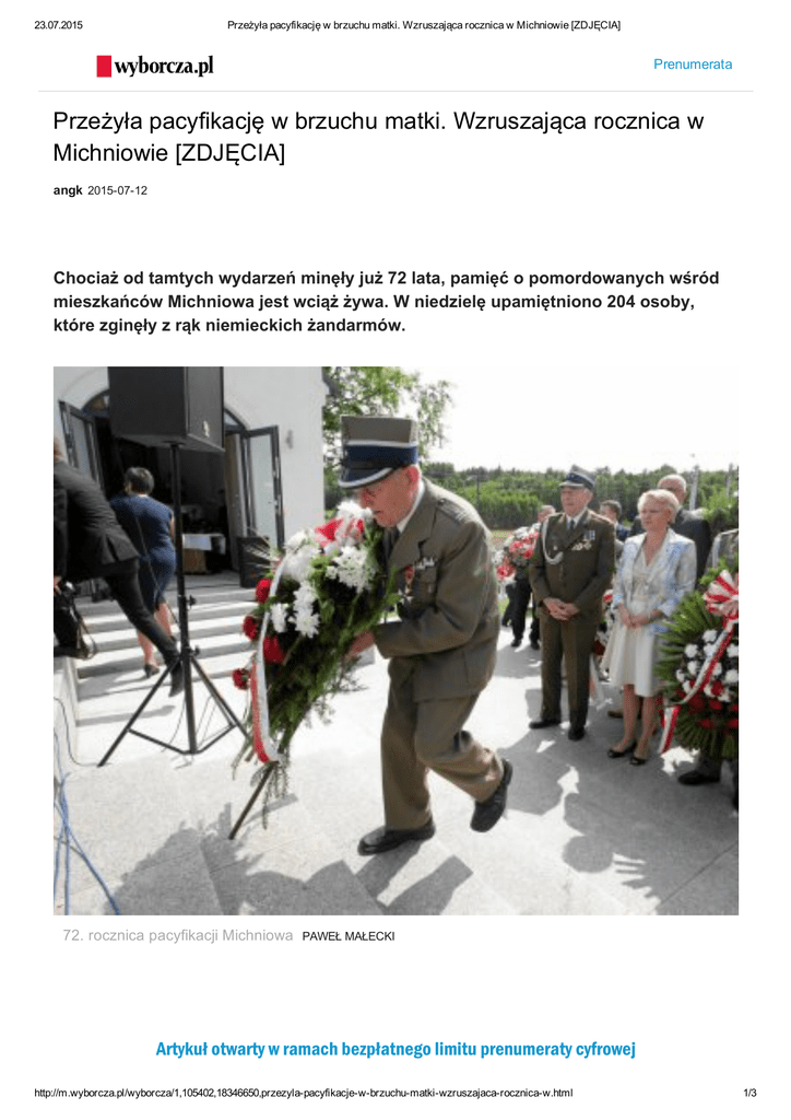 23.07.2015 Przeżyła pacyfikację w brzuchu matki. Wzruszająca rocznica w Michniowie [ZDJĘCIA] Prenumerata Przeżyła pacyfikację w brzuchu matki. Wzruszająca rocznica w Michniowie [ZDJĘCIA] angk 20150712 Chociaż od tamtych wydarzeń minęły już 72 lata, pamięć o pomordowanych wśród mieszkańców Michniowa jest wciąż żywa. W niedzielę upamiętniono 204 osoby, które zginęły z rąk niemieckich żandarmów. 72. rocznica pacyfikacji Michniowa PAWEŁ MAŁECKI Artykuł otwarty w ramach bezpłatnego limitu prenumeraty cyfrowej http://m.wyborcza.pl/wyborcza/1,105402,18346650,przezylapacyfikacjewbrzuchumatkiwzruszajacarocznicaw.html 1/3 23.07.2015 Przeżyła pacyfikację w brzuchu matki. Wzruszająca rocznica w Michniowie [ZDJĘCIA] Podczas uroczystości w Muzeum Martyrologii Wsi Polskich aktorka Beata Wojciechowska odczytała fragmenty pamiętników Emilii Ziomek. Młoda kobieta ocalała razem ze swoją matką i 3,5letnim synkiem. Emilia Ziomek była w dziewiątym miesiącu ciąży. W pamiętniku wspomina, że kiedy wróciła po dwóch dniach od pacyfikacji, w Michniowie nie było nic opowiada Beata Ryń z Muzeum Wsi Kieleckiej. W niedzielnych uroczystościach wzięła udział córka Emilii Ziomek, Zofia Jasińska, która przyszła na świat miesiąc po pacyfikacji. Przeżyła ten trudny czas w brzuchu matki. Dlatego kiedy słuchała pamiętników, była bardzo wzruszona podkreśla Ryń. 12 lipca 1943 roku z rąk niemieckich żandarmów zginęło 204 mieszkańców wsi, w tym kobiety i dzieci. Najmłodszą ofiarą był dziewięciodniowy Stefan Dąbrowa, którego spalono żywcem razem z całą rodziną. Artykuł otwarty w ramach bezpłatnego limitu Po co tyle szukać? Prenumerata cyfrowa Wyborczej dostępna przez internet, telefon, tablet i na czytniku e booków, od 0,99 za miesiąc Wypróbuj teraz za 0,99 zł za miesiąc Zaloguj się / Informacje / Kontakt Skomentuj: Zaloguj się lub zarejestruj, aby dodać komentarz Najczęściej czytane http://m.wyborcza.pl/wyborcza/1,105402,18346650,przezylapacyfikacjewbrzuchumatkiwzruszajacarocznicaw.html Wyborcza.pl 2/3