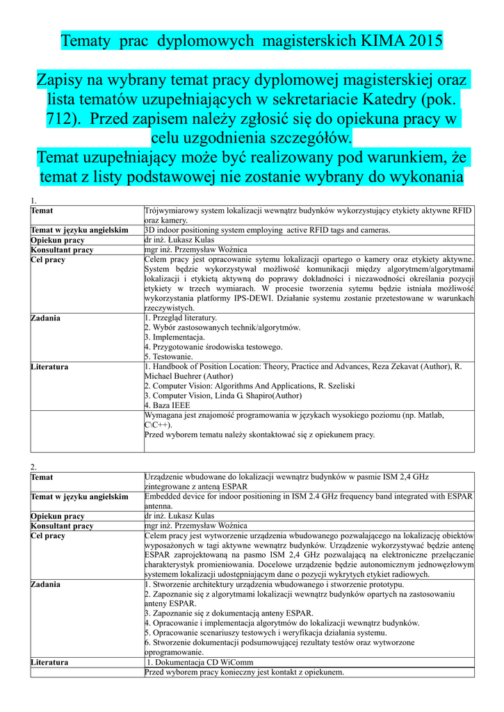 Tematy prac dyplomowych magisterskich KIMA 2015 Zapisy na