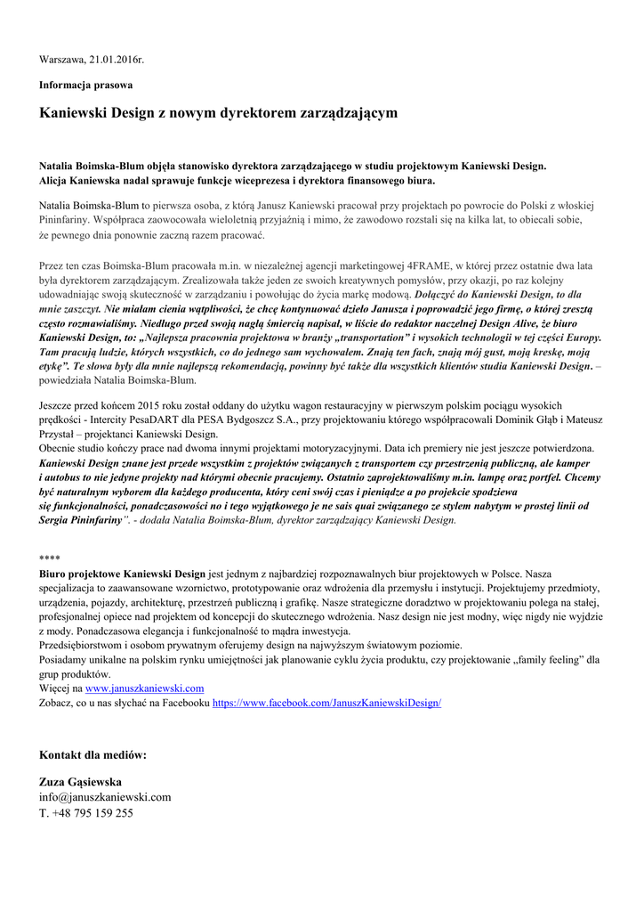 Warszawa, 21.01.2016r. Informacja prasowa Kaniewski Design z nowym dyrektorem zarządzającym Natalia Boimska-Blum objęła stanowisko dyrektora zarządzającego w studiu projektowym Kaniewski Design. Alicja Kaniewska nadal sprawuje funkcje wiceprezesa i dyrektora finansowego biura. Natalia Boimska-Blum to pierwsza osoba, z którą Janusz Kaniewski pracował przy projektach po powrocie do Polski z włoskiej Pininfariny. Współpraca zaowocowała wieloletnią przyjaźnią i mimo, że zawodowo rozstali się na kilka lat, to obiecali sobie, że pewnego dnia ponownie zaczną razem pracować. Przez ten czas Boimska-Blum pracowała m.in. w niezależnej agencji marketingowej 4FRAME, w której przez ostatnie dwa lata była dyrektorem zarządzającym. Zrealizowała także jeden ze swoich kreatywnych pomysłów, przy okazji, po raz kolejny udowadniając swoją skuteczność w zarządzaniu i powołując do życia markę modową. Dołączyć do Kaniewski Design, to dla mnie zaszczyt. Nie miałam cienia wątpliwości, że chcę kontynuować dzieło Janusza i poprowadzić jego firmę, o której zresztą często rozmawialiśmy. Niedługo przed swoją nagłą śmiercią napisał, w liście do redaktor naczelnej Design Alive, że biuro Kaniewski Design, to: „Najlepsza pracownia projektowa w branży „transportation” i wysokich technologii w tej części Europy. Tam pracują ludzie, których wszystkich, co do jednego sam wychowałem. Znają ten fach, znają mój gust, moją kreskę, moją etykę”. Te słowa były dla mnie najlepszą rekomendacją, powinny być także dla wszystkich klientów studia Kaniewski Design. – powiedziała Natalia Boimska-Blum. Jeszcze przed końcem 2015 roku został oddany do użytku wagon restauracyjny w pierwszym polskim pociągu wysokich prędkości - Intercity PesaDART dla PESA Bydgoszcz S.A., przy projektowaniu którego współpracowali Dominik Głąb i Mateusz Przystał – projektanci Kaniewski Design. Obecnie studio kończy prace nad dwoma innymi projektami motoryzacyjnymi. Data ich premiery nie jest jeszcze potwierdzona. Kaniewski Design znane jest przede wszystkim z projektów związanych z transportem czy przestrzenią publiczną, ale kamper i autobus to nie jedyne projekty nad którymi obecnie pracujemy. Ostatnio zaprojektowaliśmy m.in. lampę oraz portfel. Chcemy być naturalnym wyborem dla każdego producenta, który ceni swój czas i pieniądze a po projekcie spodziewa się funkcjonalności, ponadczasowości no i tego wyjątkowego je ne sais quai związanego ze stylem nabytym w prostej linii od Sergia Pininfariny”. - dodała Natalia Boimska-Blum, dyrektor zarządzający Kaniewski Design. **** Biuro projektowe Kaniewski Design jest jednym z najbardziej rozpoznawalnych biur projektowych w Polsce. Nasza specjalizacja to zaawansowane wzornictwo, prototypowanie oraz wdrożenia dla przemysłu i instytucji. Projektujemy przedmioty, urządzenia, pojazdy, architekturę, przestrzeń publiczną i grafikę. Nasze strategiczne doradztwo w projektowaniu polega na stałej, profesjonalnej opiece nad projektem od koncepcji do skutecznego wdrożenia. Nasz design nie jest modny, więc nigdy nie wyjdzie z mody. Ponadczasowa elegancja i funkcjonalność to mądra inwestycja. Przedsiębiorstwom i osobom prywatnym oferujemy design na najwyższym światowym poziomie. Posiadamy unikalne na polskim rynku umiejętności jak planowanie cyklu życia produktu, czy projektowanie „family feeling” dla grup produktów. Więcej na www.januszkaniewski.com Zobacz, co u nas słychać na Facebooku https://www.facebook.com/JanuszKaniewskiDesign/ Kontakt dla mediów: Zuza Gąsiewska [email protected] T. +48 795 159 255