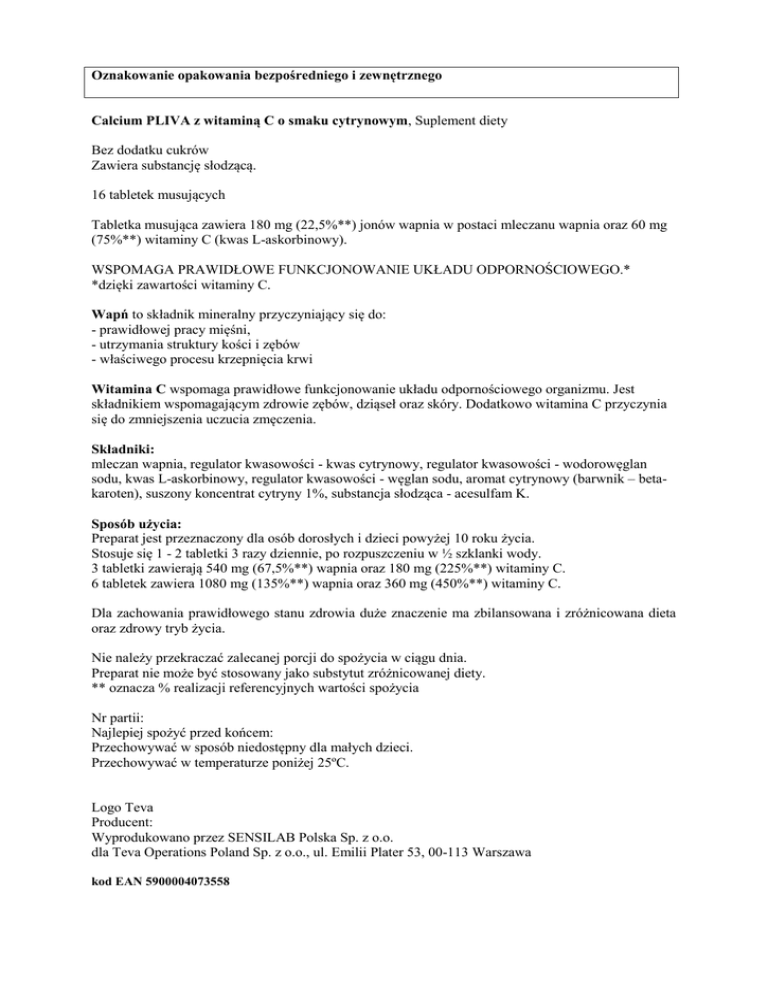 Oznakowanie opakowania bezpośredniego i zewnętrznego Calcium PLIVA z witaminą C o smaku cytrynowym, Suplement diety Bez dodatku cukrów Zawiera substancję słodzącą. 16 tabletek musujących Tabletka musująca zawiera 180 mg (22,5%**) jonów wapnia w postaci mleczanu wapnia oraz 60 mg (75%**) witaminy C (kwas L-askorbinowy). WSPOMAGA PRAWIDŁOWE FUNKCJONOWANIE UKŁADU ODPORNOŚCIOWEGO.* *dzięki zawartości witaminy C. Wapń to składnik mineralny przyczyniający się do: - prawidłowej pracy mięśni, - utrzymania struktury kości i zębów - właściwego procesu krzepnięcia krwi Witamina C wspomaga prawidłowe funkcjonowanie układu odpornościowego organizmu. Jest składnikiem wspomagającym zdrowie zębów, dziąseł oraz skóry. Dodatkowo witamina C przyczynia się do zmniejszenia uczucia zmęczenia. Składniki: mleczan wapnia, regulator kwasowości - kwas cytrynowy, regulator kwasowości - wodorowęglan sodu, kwas L-askorbinowy, regulator kwasowości - węglan sodu, aromat cytrynowy (barwnik – betakaroten), suszony koncentrat cytryny 1%, substancja słodząca - acesulfam K. Sposób użycia: Preparat jest przeznaczony dla osób dorosłych i dzieci powyżej 10 roku życia. Stosuje się 1 - 2 tabletki 3 razy dziennie, po rozpuszczeniu w ½ szklanki wody. 3 tabletki zawierają 540 mg (67,5%**) wapnia oraz 180 mg (225%**) witaminy C. 6 tabletek zawiera 1080 mg (135%**) wapnia oraz 360 mg (450%**) witaminy C. Dla zachowania prawidłowego stanu zdrowia duże znaczenie ma zbilansowana i zróżnicowana dieta oraz zdrowy tryb życia. Nie należy przekraczać zalecanej porcji do spożycia w ciągu dnia. Preparat nie może być stosowany jako substytut zróżnicowanej diety. ** oznacza % realizacji referencyjnych wartości spożycia Nr partii: Najlepiej spożyć przed końcem: Przechowywać w sposób niedostępny dla małych dzieci. Przechowywać w temperaturze poniżej 25ºC. Logo Teva Producent: Wyprodukowano przez SENSILAB Polska Sp. z o.o. dla Teva Operations Poland Sp. z o.o., ul. Emilii Plater 53, 00-113 Warszawa kod EAN 5900004073558