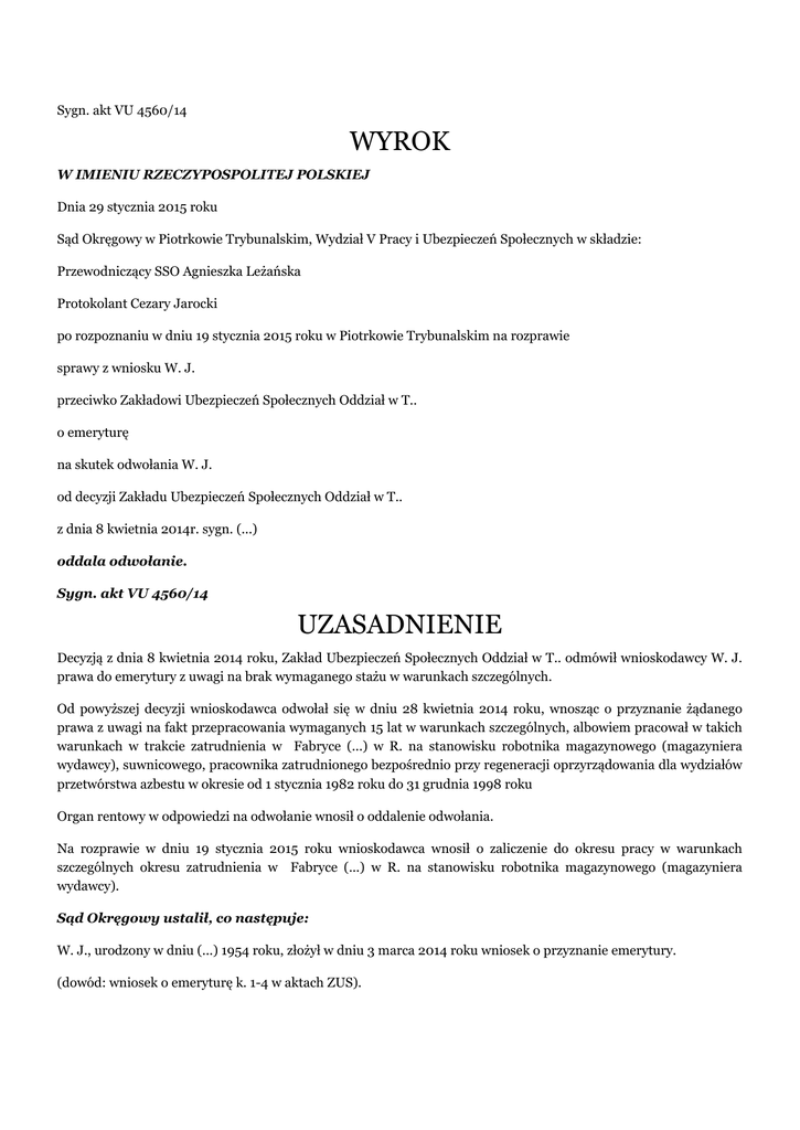 Sygn. akt VU 4560/14 WYROK W IMIENIU RZECZYPOSPOLITEJ POLSKIEJ Dnia 29 stycznia 2015 roku Sąd Okręgowy w Piotrkowie Trybunalskim, Wydział V Pracy i Ubezpieczeń Społecznych w składzie: Przewodniczący SSO Agnieszka Leżańska Protokolant Cezary Jarocki po rozpoznaniu w dniu 19 stycznia 2015 roku w Piotrkowie Trybunalskim na rozprawie sprawy z wniosku W. J. przeciwko Zakładowi Ubezpieczeń Społecznych Oddział w T.. o emeryturę na skutek odwołania W. J. od decyzji Zakładu Ubezpieczeń Społecznych Oddział w T.. z dnia 8 kwietnia 2014r. sygn. (...) oddala odwołanie. Sygn. akt VU 4560/14 UZASADNIENIE Decyzją z dnia 8 kwietnia 2014 roku, Zakład Ubezpieczeń Społecznych Oddział w T.. odmówił wnioskodawcy W. J. prawa do emerytury z uwagi na brak wymaganego stażu w warunkach szczególnych. Od powyższej decyzji wnioskodawca odwołał się w dniu 28 kwietnia 2014 roku, wnosząc o przyznanie żądanego prawa z uwagi na fakt przepracowania wymaganych 15 lat w warunkach szczególnych, albowiem pracował w takich warunkach w trakcie zatrudnienia w Fabryce (...) w R. na stanowisku robotnika magazynowego (magazyniera wydawcy), suwnicowego, pracownika zatrudnionego bezpośrednio przy regeneracji oprzyrządowania dla wydziałów przetwórstwa azbestu w okresie od 1 stycznia 1982 roku do 31 grudnia 1998 roku Organ rentowy w odpowiedzi na odwołanie wnosił o oddalenie odwołania. Na rozprawie w dniu 19 stycznia 2015 roku wnioskodawca wnosił o zaliczenie do okresu pracy w warunkach szczególnych okresu zatrudnienia w Fabryce (...) w R. na stanowisku robotnika magazynowego (magazyniera wydawcy). Sąd Okręgowy ustalił, co następuje: W. J., urodzony w dniu (...) 1954 roku, złożył w dniu 3 marca 2014 roku wniosek o przyznanie emerytury. (dowód: wniosek o emeryturę k. 1-4 w aktach ZUS). Na dzień 1 stycznia 1999 roku skarżący udowodnił staż pracy wynoszący 25 lat. ZUS nie zaliczył wnioskodawcy do pracy w warunkach szczególnych żadnych okresów zatrudnienia. W dacie złożenia wniosku o emeryturę W. J. miał rozwiązany stosunek pracy. Wnioskodawca nie przystąpił do otwartego funduszu emerytalnego. (dowód: wniosek o emeryturę k. 1-4 w aktach ZUS, decyzja z dnia 8 kwietnia 2014 roku k. 16 w aktach ZUS) W okresie od 14 lipca 1975 roku do 30 września 2011 roku wnioskodawca pracował stale i pełnym wymiarze czasu pracy w Fabryce (...) w R., która następnie przekształciła się w Fabrykę (...) S.A. w R.. W świadectwie pracy wystawionym wnioskodawcy pracodawca wskazał, iż był on zatrudniony na stanowisku stażysty, referenta, referenta ds. zaopatrzenia, specjalisty ds. zapatrzenia, wydawca narzędzi, magazynier narzędzi i oprzyrządowania. (dowód: świadectwo pracy k. 21 w aktach kapitałowych) Wnioskodawca w Fabryce (...) w R. w okresie od 14 lipca 1975 roku do 23 października 1975 roku pracował jako stażysta w Wydziale (...), następnie w okresie od 27 października 1975 roku do 14 października 1977 roku odbywał zasadniczą służbę wojskową. Po powrocie z wojska od dnia 14 listopada 1977 roku został zatrudniony ponownie w Fabryce (...) w R., jako referent w dziale zaopatrzenia materiałów produkcji, a od 1 stycznia 1982 roku na stanowisku referenta ds. zaopatrzenia. W dniu 30 grudnia 1982 roku wnioskodawcy została przedstawiona przez pracodawcę karta stanowiska pracy, której punkt 3 dotyczył wykazu funkcji i czynności realizowanych przez pracownika na zajmowanym stanowisku pracy. W ramach podziału pracy wnioskodawcy zostały powierzone m.in. następujące czynności: - prowadzenie planów dostaw wyrobów hutniczych, - opracowywanie zamówień na dostawy wyrobów hutniczych, - lokowanie dostaw wyrobów hutniczych w Centrostali w (...) i innych jednostkach hutniczych , - zgłaszanie potrzeb do (...) na poszczególne wyroby, - prowadzenie rejestru zamówień ulokowanych u poszczególnych dostawców, - prowadzenie wszelkiej korespondencji związanej z dostawami wyrobów hutniczych, - prowadzenie kompletnych dokumentów hutniczych po realizacji dostaw jak kopie faktur, awiza wysyłkowe i szeregu innych związanych z prowadzeniem zamówień wyrobów. Z przedstawiona karta stanowiska pracy W. J. zapoznał się, potwierdzając to własnoręcznym podpisem (dowód: kwestionariusz osobowy z 10 listopada 1977 roku – w aktach osobowych, umowa o wstępny staż pracy k. 3 w aktach osobowych, kserokopia książeczki wojskowej k. 27-33 akt ZUS o świadczenie przedemerytalne, karta przyjęcia po wojsku k. 5 w aktach osobowych, umowa o pracę z dnia 14.11.1977 r. k. 6 w aktach osobowych, wniosek o zmianę stanowiska z dnia i angaż z dnia 18 lutego 1982 roku k. 9 w aktach osobowych, karta stanowiska pracy k. 10 w aktach osobowych, angaże k. 11 -12 w aktach osobowych). Z dniem 1 kwietnia 1984 roku wnioskodawcy zostały powierzone obowiązki specjalisty ds. zaopatrzenia (dowód: angaż z dnia 18.04.1984 r. k. 13 w aktach osobowych, angaże k. 18-32 w aktach osobowych). Zgodnie z zakresem obowiązków z dnia 17 czerwca 1993 roku, wnioskodawca zatrudniony na stanowisku specjalisty ds. zaopatrzenia zobowiązany do: - planowania zaopatrzenia, - sporządzania zamówień, zawierania umów z dostawcami po przeprowadzonej ofertyzacji na materiały i wyroby hutnictwa żelaza i stali w tym pręty ciągnione, pręty walcowate, pręty kute, blachy, rury i kształtowniki, gwoździe, druty, - kontroli realizacji dostaw, - prowadzenia rozliczeń z dostawcami, -dokonywanie zakupów doraźnych, - prowadzenie kartoteki materiałowo dyspozycyjnej w zakresie prowadzonej branży oraz innych czynności wymienionych w piśmie. Również z tym zakresem obowiązków wnioskodawca zapoznał się, co potwierdził własnoręcznym podpisem (dowód: zakres obowiązków z dnia 17 czerwca 19923 roku k. 33 w aktach osobowych). W dniu 25 października 1994 roku wnioskodawcy został przedstawiony opis stanowiska pracy specjalisty ds. zaopatrzenia z wyszczególnieniem ile czasu dziennie zajmują wnios