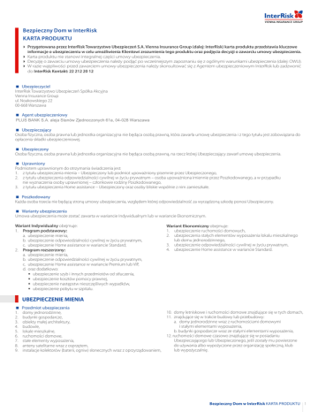 Bezpieczny Dom w InterRisk KARTA PRODUKTU Przygotowana przez InterRisk Towarzystwo Ubezpieczeń S.A. Vienna Insurance Group (dalej: InterRisk) karta produktu przedstawia kluczowe } informacje o ubezpieczeniu w celu umożliwienia Klientowi zrozumienia tego produktu oraz podjęcia decyzji o zawarciu umowy ubezpieczenia. } Karta produktu nie stanowi integralnej części umowy ubezpieczenia. } Decyzję o zawarciu umowy ubezpieczenia należy podjąć po wcześniejszym zapoznaniu się z ogólnymi warunkami ubezpieczenia (dalej: OWU). } W razie wątpliwości przed zawarciem umowy ubezpieczenia należy skonsultować się z Agentem ubezpieczeniowym InterRisk lub zadzwonić do InterRisk Kontakt: 22 212 20 12 < Ubezpieczyciel InterRisk Towarzystwo Ubezpieczeń Spółka Akcyjna Vienna Insurance Group ul. Noakowskiego 22 00-668 Warszawa < Agent ubezpieczeniowy PLUS BANK S.A. aleja Stanów Zjednoczonych 61a, 04-028 Warszawa < Ubezpieczający Osoba fizyczna, osoba prawna lub jednostka organizacyjna nie będąca osobą prawną, która zawarła umowę ubezpieczenia i z tego tytułu jest zobowiązana do opłacenia składki ubezpieczeniowej. < Ubezpieczony Osoba fizyczna, osoba prawna lub jednostka organizacyjna nie będąca osobą prawną, na rzecz której Ubezpieczający zawarł umowę ubezpieczenia. < Uprawniony Podmiotem uprawnionym do otrzymania świadczenia jest: 1. z tytułu ubezpieczenia mienia – Ubezpieczony lub podmiot upoważniony pisemnie przez Ubezpieczonego, 2. z tytułu ubezpieczenia odpowiedzialności cywilnej w życiu prywatnym – osoba upoważniona imiennie przez Poszkodowanego, a w przypadku nie wyznaczenia osoby uprawnionej – członkowie rodziny Poszkodowanego, 3. z tytułu ubezpieczenia Home assistance – Ubezpieczony oraz osoby bliskie wspólnie z nim zamieszkałe. < Poszkodowany Każda osoba trzecia nie będącą stroną umowy ubezpieczenia, względem której odpowiedzialność za wyrządzoną szkodę ponosi Ubezpieczony. < Warianty ubezpieczenia Umowa ubezpieczenia może zostać zawarta w wariancie Indywidualnym lub w wariancie Ekonomicznym. Wariant Indywidualny obejmuje: 1. Program podstawowy: a. ubezpieczenie mienia, b. ubezpieczenie odpowiedzialności cywilnej w życiu prywatnym, c. ubezpieczenie Home assistance w wariancie Standard; 2. Program rozszerzony: a. ubezpieczenie mienia, b. ubezpieczenie odpowiedzialności cywilnej w życiu prywatnym, c. ubezpieczenie Home assistance w wariancie Premium lub VIP, d. oraz dodatkowo: • ubezpieczenie szyb i innych przedmiotów od stłuczenia, • ubezpieczenie kosztów pomocy prawnej, • ubezpieczenie następstw nieszczęśliwych wypadków, • ubezpieczenie pobytu w szpitalu. Wariant Ekonomiczny obejmuje: 1. ubezpieczenie ruchomości domowych, 2. ubezpieczenia stałych elementów wyposażenia lokalu mieszkalnego lub domu jednorodzinnego, 3. ubezpieczenie odpowiedzialności cywilnej w życiu prywatnym, 4. ubezpieczenie Home assistance w wariancie Standard. UBEZPIECZENIE MIENIA < Przedmiot ubezpieczenia 1. domy jednorodzinne, 2. budynki gospodarcze, 3. obiekty małej architektury, 4. budowle, 5. lokale mieszkalne, 6. ruchomości domowe, 7. stałe elementy wyposażenia, 8. anteny satelitarne wraz z osprzętem, 9. instalacje kolektorów (baterii, ogniw) słonecznych wraz z oprzyrządowaniem, 10. domy letniskowe i ruchomości domowe znajdujące się w tych domach, 11. znajdujące się w trakcie budowy lub przebudowy: a. domy jednorodzinne wraz z ruchomościami domowymi i stałymi elementami wyposażenia, b. budynki gospodarcze wraz ze stałymi elementami wyposażenia, 12. ruchomości domowe czasowo znajdujące się w posiadaniu Ubezpieczającego lub Ubezpieczonego, jeśli zostały mu powierzone do używania albo wypożyczone przez organizację społeczną, klub lub wypożyczalnię. Bezpieczny Dom w InterRisk KARTA PRODUKTU 1 < Zakres ubezpieczenia Zgodnie z Tabelą nr 1 Tabela nr 1 Ruchomości domowe i stałe elementy wyposażenia w domach jednorodzinnych w budowie lub przebudowie Domy jednorodzinne i budynki gospodarcze w budowie lub przebudowie Domy letniskowe i ruchomości domowe znajdujące się w tych domach Anteny satelitarne wraz z osprzętem oraz kolektory słoneczne wraz z oprzyrządowaniem Ruchomości domowe Stałe elementy wyposażenia nie ubezpieczone w ramach domu jednorodzinnego, budynku gospodarczego lub lokalu mieszkalnego Budynek gospodarczy wraz ze stałymi elementami wyposażenia, Obiekty małej architektury, Budowle Lokal mieszkalny wraz ze stałymi elementami wyposażenia ZAKRES UBEZPIECZENIA Dom jednorodzinny wraz ze stałymi elementami wyposażenia PRZEDMIOT UBEZPIECZENIA Pożar Uderzenie pioruna Wybuch Upadek statku powietrznego Huragan Grad Lawina Deszcz nawalny Zapadanie lub osunięcie się ziemi Napór śniegu lub lodu Dym i sadza Opad atmosferyczny Zalania Trzęsienie ziemi Uderzenie pojazdu Huk ponaddźwiękowy Upadek drzew i masztów Akty terroru Skażenie lub zanieczyszczenie ubezpieczonego mienia Powódź Wandalizm Przepięcia Kradzież z włamaniem i rabunek za opłatą dodatkowej składki Ochroną ubezpieczeniową objęte są również ruchomości domowe podczas transportu – od szkód powstałych wskutek: 1. pożaru, uderzenia pioruna, wybuchu, huraganu, powodzi, deszczu nawalnego, gradu, opadu atmosferycznego, lawiny, osunięcia się ziemi, upadku statku powietrznego na środek transportu, 2. wypadku jakiemu uległ środek transportu, 3. rabunku – pod warunkiem, że przewóz wykonywany jest odpłatnie przez przewoźnika. < Suma ubezpieczenia Sumę ubezpieczenia ustala Ubezpieczający i zostaje potwierdzona w polisie. Suma ubezpieczenia mienia stanowi górną granicę odpowiedzialności InterRisk za wszystkie zdarzenia zaistniałe w okresie ubezpieczenia. Szczegółowy sposób ustalania sumy ubezpieczenia określają OWU. 2 Bezpieczny Dom w InterRisk KARTA PRODUKTU < Limity odpowiedzialności W ramach określonych w polisie sum ubezpieczenia, górną granicę odpowiedzialności InterRisk za szkod