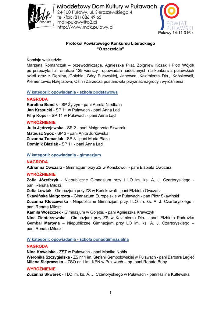 Puławy 14.11.016 r. Protokół Powiatowego Konkursu Literackiego “O szczęściu” Komisja w składzie: Marzena Romańczuk – przewodnicząca, Agnieszka Piłat, Zbigniew Kozak i Piotr Wójcik po przeczytaniu i analizie 129 wierszy i opowiadań nadesłanych na konkurs z puławskich szkół oraz z Dęblina, Gołębia, Góry Puławskiej, Janowca, Kazimierza Dln., Końskowoli, Klementowic, Nałęczowa, Osin i Zarzecza postanowiła przyznać nagrody i wyróżnienia: W kategorii: opowiadania - szkoła podstawowa NAGRODA Karolina Boncik - SP Żyrzyn - pani Aurela Niedbała Jan Krasucki - SP 11 w Puławach - pani Anna Ląd Filip Koper - SP 11 w Puławach - pani Anna Ląd WYRÓŻNIENIE Julia Jędrzejewska - SP 2 - pani Małgorzata Skwarek Mateusz Spoz - SP 3 - pani Anita Jurkowska Zuzanna Tomasiak - SP 3 - pani Maria Płaza Dominik Błaziak - SP 11 - pani Anna Ląd W kategorii: opowiadania - gimnazjum NAGRODA Adrianna Owczarz - Gimnazjum przy ZS w Końskowoli - pani Elżbieta Owczarz WYRÓŻNIENIE Zofia Józefczyk - Niepubliczne Gimnazjum przy I LO im. ks. A. J. Czartoryskiego pani Renata Miłosz Zofia Lewtak - Gimnazjum przy ZS w Końskowoli - pani Elżbieta Owczarz Skawińska Małgorzata - Gimnazjum Europejskie w Puławach - pan Piotr Skawiński Zuzanna Kłoczewska - Niepubliczne Gimnazjum przy I LO im. ks. A. J. Czartoryskiego pani Renata Miłosz Kamila Woszczek - Gimnazjum w Gołębiu - pani Agnieszka Krawczyk Nina Zientarzewska - Gimnazjum przy ZS w Kazimierzu Dln. - pani Elżbieta Podrażka Gembal Martyna – Niepubliczne Gimnazjum przy LO im. ks. A. J. Czartoryskiego – pani Renata Miłosz W kategorii: opowiadania - szkoła ponadgimnazjalna NAGRODA Nina Kowalska - ZST w Puławach - pani Monika Nobis Weronika Szczygielska - ZS nr 1 im. Stefanii Sempołowskiej w Puławach - pani Barbara Legieć Milena Sieprawska – ZSO nr 1 im. KEN w Puławach – op. pani Renata Bany WYRÓŻNIENIE Zuzanna Skwarek - I LO im. ks. A. J. Czartoryskiego w Puławach - pani Halina Kuflewska 1 W kategorii: wiersz - szkoła podstawowa NAGRODA Klaudia Strawa - SP 6 - pani Beata Węglińska - Słowik Anna Konieczna - SP 3 - pani Anita Jurkowska Grzegorz Siedlecki - SP 3 - pani Maria Płaza Malwina Głowacka - SP w Nałęczowie- pani Sylwia Krysa WYRÓŻNIENIE Sonia Baranowska - SP 4 - pani Paulina Paciorek Jan Piasecki - SP 6 - pani Beata Węglińska - Słowik Aleksandra Lucjanek - ZS w Janowcu - pani Jolanta Lidacka Kajetan Kostka - ZS w Janowcu - pani Agata Mielczarska W kategorii: wiersz – gimnazjum NAGRODA Julia Ogonowska - PG nr 4 w Puławach - pani Agnieszka Wójcicka Sara Eciak - Niepubliczne Gimnazjum przy ZSA w Klementowicach - pani Jadwiga Pietrzak WYRÓŻNIENIE Angelika Cyranek - Niepubliczne Gimnazjum przy I LO im. ks. A. J. Czartoryskiego pani Beata Burecka Karolina Sikora - Gimnazjum przy ZS w Końskowoli - pani Elżbieta Owczarz W kategorii: wiersz - szkoła ponadgimnazjalna NAGRODA Alicja Tyszczuk - I LO im. ks. A. J.Czartoryskiego w Puławach Julia Książek - ZSO nr 2 im. F. D. Kniaźnina w Puławach - pani Joanna Czajkowska Natalia Woźniak - ZSO nr 2 im. F. D. Kniaźnina w Puławach - pani Małgorzata Berlińska WYRÓŻNIENIE Jacek Kwaśny - ZST w Puławach - pani Monika Nobis 2