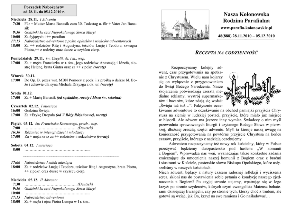 Porządek NaboŜeństw od 28.11. do 05.12.2010 r. Niedziela 28.11. I Adwentu 7:30 Für + Mutter Marta Banasik zum 30. Todestag u. für + Vater Jan Banasik 9:30 Godzinki ku czci Niepokalanego Serca Maryi 10:00 Za Ŝyjących i ++ parafian 17:15 NaboŜeństwo adwentowe z pośw. opłatków i wieńców adwentowych 18:00 Za ++ rodziców Ritę i Augustyna, teściów Łucję i Teodora, szwagra Piotra,++ z rodziny oraz dusze w czyśćcu cierp. Poniedziałek 29.11. św. Cecylii, dz. i m., wsp. 17:00 Za + męŜa Franciszka w r. śm., jego rodziców Anastazję i Józefa, siostrę Helenę, brata Gintra oraz za ++ z pokr. (roraty) Wtorek 30.11. 17:00 Do Op. B. przez wst. MBN Pomocy z podz. i z prośbą o dalsze bł. BoŜe i zdrowie dla syna Michała Drzyzga z ok. ur. (roraty) Środa 01.12. 17:00 Za + Martę Banasik (od sąsiadów, roraty i Msza św. szkolna) Czwartek 02.12. I miesiąca 16:00 Godzina Święta 17:00 Za +Erykę Dropała (od V RóŜy RóŜańcowej, roraty) Piątek 7:00 16:30 17:00 03.12. św. Franciszka Ksawerego, prezb., wsp. …………………………………..(Deutsch) RóŜaniec w intencji dzieci i młodzieŜy Za + męŜa oraz za ++ rodziców i rodzeństwo (roraty) Sobota 04.12. I miesiąca 8:00 …………………………………………... 17:00 18:00 NaboŜeństwo I sobót miesiąca Za + rodziców Łucję i Teodora, teściów Ritę i Augustyna, brata Piotra, ++ z pokr. oraz dusze w czyśćcu cierp. Niedziela 05.12. II Adwentu 7:30 …………………………………..(Deutsch) 9:30 Godzinki ku czci Niepokalanego Serca Maryi 10:00 …………………………………………... 17:15 NaboŜeństwo adwentowe 18:00 Za + męŜa i ojca Piotra Lempa w I r. śm.. Nasza Kolonowska Rodzina Parafialna www.parafia-kolonowskie.pl 48(888) 28.11.2010 – 05.12.2010 RECEPTA NA CODZIENNOŚĆ Rozpoczynamy kolejny adwent, czas przygotowania na spotkanie z Chrystusem. Wielu nam kojarzy się on wyłącznie z przygotowaniem do Świąt BoŜego Narodzenia. Nasze skojarzenia potwierdzają zresztą medialne reklamy, wystrój supermarketów i bazarów, które zdają się wołać: „Święta tuŜ tuŜ…”. Faktycznie oczekiwanie adwentowe to oczekiwanie na obchód pamiątki przyjścia Chrystusa na ziemię w ludzkiej postaci, przyjście, które miało juŜ miejsce w historii. Ale adwent ma jeszcze inny wymiar. Świadczy o nim myśl przewodnia sprawowanych liturgii i czytanego BoŜego Słowa w pierwszej, dłuŜszej zresztą, części adwentu. Myśl ta kieruje naszą uwagę na konieczność przygotowania na powtórne przyjście Chrystusa na końcu czasów, przyjście, którego z nadzieją oczekujemy. Adwentem rozpoczynamy teŜ nowy rok kościelny, który w Polsce przeŜywać będziemy duszpastersko pod hasłem: „W komunii z Bogiem”. Wprowadza nas weń, wyznaczając takŜe konkretne zadania zmierzające do umocnienia naszej komunii z Bogiem oraz z braćmi i siostrami w Kościele, pasterskie słowo Biskupa Opolskiego, które usłyszeliśmy w naszych kościołach. Niech adwent, będący z natury czasem radosnej refleksji i wyciszenia serca, skłoni nas do postawienia sobie pytania o kondycję naszego zjednoczenia z Bogiem? Po czyjej stronie stajemy, wpatrując się w Jego krzyŜ: po stronie szyderców, których czyni ewangelista Mateusz bohaterami dzisiejszej Ewangelii, czy po stronie tych, którzy choć z trudem, ale gotowi są wziąć, jak On, krzyŜ na swe ramiona i Go naśladować… PAPIESKA INTENCJA OGÓLNA Aby dzieci były szanowane i kochane i nigdy nie stawały się ofiarami rozlicznych form wyzysku PAPIESKA INTENCJA MISYJNA Aby w BoŜe Narodzenie narody ziemi uznały w Słowie Wcielonym światłość oświecającą kaŜdego człowieka, a kraje otwarły drzwi Chrystusowi, Zbawicielowi świata. 05.12 12.12 19.12 25.12 26.12 W grudniu modlitwie róŜańcowej przewodniczą: p Anna Bock RóŜa 02 RóŜa 03 p. Inga Muc RóŜa 04 p. Hildegarda Czupała RóŜa 05 p. Elfryda Fleger RóŜa 06 p. Maria Baron 48/2010 Dzisiaj obchodzimy I Niedzielę Adwentu. Rozpoczynamy nowy rok kościelny, którego hasło brzmi W komunii z Bogiem (Kościół domem i szkołą komunii) Zapraszamy na naboŜeństwo adwentowe z poświęceniem opłatków, wieńców i świec adwentowych o godz. 17:00 Adwent jest okresem przygotowania do Narodzenia Pańskiego i oczekiwania drugiego przyjścia Chrystusa na końcu czasów. Nie jest to juŜ czas świąteczny, dlatego nie naleŜy od początku Adwentu ozdabiać swoich domów dekoracjami boŜonarodzeniowymi. Zachęca się do wysiłku duchowego przez uczestnictwo w Roratach i zachowanie trzeźwości. Zachęca się równieŜ do pielęgnowania zwyczajów adwentowych, np.: wspólna modlitwa przy wieńcu adwentowym, czytanie Pisma Świętego i innych. Niedziela dzisiejsza, w naszej parafii, obchodzona jest jako Niedziela Dobrej KsiąŜki. Zachęca się do kupna dobrej ksiąŜki jako prezentu świątecznego. Zapraszamy do modlitwy w intencji powołań w czwartek o godz. 16:00 W piątek od godz. 8:00 odwiedziny chorych. Niedziela Dobrej KsiąŜki Dzisiejsza niedziela poświęcona czytelnictwu dobrej literatury i czasopism. Pragnie przypomnieć nam ukryte bogactwo i zachęcić do korzystania ze skarbca księgozbiorów. Jeden z mądrych powiedział: „znaczenie słowa mówionego oraz mediów elektronicznych jest niewątpliwie wielkie, ale- ksiąŜka zostanie źródłem naszego Ŝycia duchowego ” Są wśród nas tacy, którzy lubią czytać i tacy, którzy nie lubią czytać. Kto jest w lepszej sytuacji? Do ukochania ksiąŜki i czytania trzeba dziecko wychować. Pierwszy krok, to ksiąŜeczka z pięknymi obrazkami, pokazana i objaśniona maluchowi. Umiejętne podsuwanie lektury dostosowanej do wieku i zainteresowań przyczyni się do zaszczepienia „bakcyla” wypełnienia wolnego czasu czytaniem. Jest to wielka wartość, którą przekazujemy dziecku, większa od róŜnorakich dóbr materialnych. Rynek ksiąŜkowy jest niezwykle bogaty. Szata graficzna współczesnej ksiąŜ
