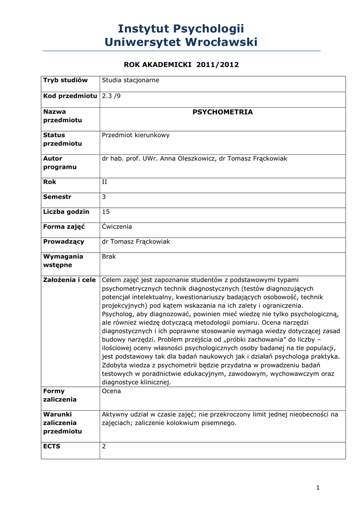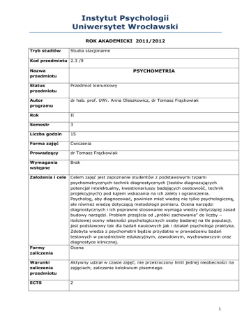 Instytut Psychologii Uniwersytet Wrocławski ROK AKADEMICKI 2011/2012 Tryb studiów Studia stacjonarne Kod przedmiotu 2.3 /9 PSYCHOMETRIA Nazwa przedmiotu Status przedmiotu Przedmiot kierunkowy Autor programu dr hab. prof. UWr. Anna Oleszkowicz, dr Tomasz Frąckowiak Rok II Semestr 3 Liczba godzin 15 Forma zajęć Ćwiczenia Prowadzący dr Tomasz Frąckowiak Wymagania wstępne Brak Założenia i cele Celem zajęć jest zapoznanie studentów z podstawowymi typami psychometrycznych technik diagnostycznych (testów diagnozujących potencjał intelektualny, kwestionariuszy badających osobowość, technik projekcyjnych) pod kątem wskazania na ich zalety i ograniczenia. Psycholog, aby diagnozować, powinien mieć wiedzę nie tylko psychologiczną, ale również wiedzę dotyczącą metodologii pomiaru. Ocena narzędzi diagnostycznych i ich poprawne stosowanie wymaga wiedzy dotyczącej zasad budowy narzędzi. Problem przejścia od „próbki zachowania” do liczby – ilościowej oceny własności psychologicznych osoby badanej na tle populacji, jest podstawowy tak dla badań naukowych jak i działań psychologa praktyka. Zdobyta wiedza z psychometrii będzie przydatna w prowadzeniu badań testowych w poradnictwie edukacyjnym, zawodowym, wychowawczym oraz diagnostyce klinicznej. Ocena Formy zaliczenia Warunki zaliczenia przedmiotu Aktywny udział w czasie zajęć; nie przekroczony limit jednej nieobecności na zajęciach; zaliczenie kolokwium pisemnego. ECTS 2 1 Treści programowe: I. Podstawowe problemy psychometrii (zajęcia wprowadzające i organizacyjne 2 godz.) „Człowiek jest większy od miary, którą się go mierzy”, czyli podstawowe problemy badania testowego - problemy natury technicznej i etycznej. Podział testów z uwagi na przedmiot pomiaru, budowę metody, materiał testowy. Różnorodność zastosowań pomiaru testowego. Prezentacja przekładowych narzędzi do: diagnozy możliwości intelektualnych, kwestionariuszowej diagnozy osobowości, diagnozy osobowości z użyciem testu projekcyjnego. Po czym poznać, że nie mamy do czynienia z dobrym testem psychologicznym. II. Samoopisowe kwestionariusze osobowości (4 godz.) Specyfika kwestionariusza jako metody zbierania informacji o osobowości człowieka przez wykorzystanie samoopisu zachowania. Stosowanie kwestionariuszy w badaniach: naukowych, diagnostycznych, zawodoznawczych i klinicznych (diagnoza nozologiczna, diagnoza przesiewowa, diagnoza wzorów zachowania). Dwie formy przewidywania zachowania na podstawie wyników kwestionariuszowych: predykcja kliniczna, statystyczna (odwołanie do norm aktuarialnych) – zalety i wady. Cztery grupy problemów związanych z pomiarem kwestionariuszowym (oraz sposoby, którymi można im zapobiegać): 1. Problem rozumienia i interpretowania treści pytań kwestionariuszowych; 2. Problem oceny zachowania przy odpowiadaniu na pozycje kwestionariusza; 3. Problem dopasowania formatu odpowiedzi do treści pytań i do preferencji osób badanych; 4. Problem pozatreściowych wyznaczników odpowiedzi, tj. stylów odpowiadania (warunki zaistnienia stylów odpowiadania, typy stylów), symulacji (rodzaje i przykłady skal kontrolnych, kwestia manipulowania instrukcją), dysymulacji (związek dysymulacji ze zmienną aprobaty społecznej, wymiary zmiennej aprobaty społecznej, „sprawianie wrażenia” „samooszukiwanie”, procedury dotyczące zmniejszania wpływu aprobaty społecznej na odpowiedzi stosowane na etapach: formułowania pozycji, budowy kwestionariusza, badań właściwych). Co uzasadnia stosowanie kwestionariusza jako metody badawczej – zalety podejścia kwestionariuszowego. III. Trafność czyli określanie obszaru zastosowań testu (2 godz.) Trzy strategie konstrukcji kwestionariuszy osobowości: teoretyczna, zewnętrzna (kryterialna), indukcyjna. Różnice pomiędzy strategiami, wady i zalety poszczególnych strategii konstrukcyjnych. Analiza teorii, treściowy dobór wskaźników, ustalenie trafności treściowej (definicyjnej) jako kluczowe etapy konstruowania testu strategią teoretyczną (dedukcyjną). Trafność treściowa a inne rodzaje trafności (kryterialna – diagnostyczna, prognostyczna; teoretyczna; fasadowa). IV. Metoda sędziów kompetentnych a trafność treściowa (2 godz.) Podstawowe pojęcia: operacjonalizacja mierzonej zmiennej, uniwersum treści, reprezentatywność „próbki zachowania”. Ocena zgodności treści pozycji testowych z przyjętymi założeniami definicyjnymi metodą zgodności sędziów kompetentnych. Treść instrukcji dla sędziów kompetentnych. Obliczanie (na przykładowych danych) wskaźnika W Kendalla, ocena istotności statystycznej współczynnika, ocena kryterium dobroci poszczególnych pozycji testowych. 2 V. Psychometryczny status technik projekcyjnych (2 godz.) Podstawowe założenia metod projekcyjnych. Hipoteza projekcyjna. Typy i przykłady technik projekcyjnych na podstawie taksonomii Lindzeya (techniki projekcyjne: skojarzeniowe, konstrukcyjne, uzupełniania, ekspresyjne, porządkujące i selekcyjne). Mocne i słabe strony stosowania technik projekcyjnych. Zmienne obniżające trafność technik projekcyjnych (wpływ osoby przeprowadzającej badanie i wpływ sytuacji, nastawienie osoby badanej, symulacja w technikach projekcyjnych, techniki projekcyjne a zmienna aprobaty społecznej, interpretacja wyników a poziom doświadczenia diagnosty, problem projekcji badającego). Jak wykrywać symulacje i działanie zmiennej aprobaty społecznej w technikach projekcyjnych. Zalecenia dotyczące stosowania technik projekcyjnych w badaniach naukowych i praktyce klinicznej. Zalecenia dotyczące konstruowania technik projekcyjnych na drodze teoretycznej i empirycznej. VI. Kontrowersje związane z pomiarem możliwości intelektualnych (2 godz.) Testowe badanie inteligencji; wpływ przyjętej teorii na ostateczny kształt narzędzia mierzącego inteligencję. Rodzaje testów inteligencji; typy zadań testowych i przykładowe narzędzia s