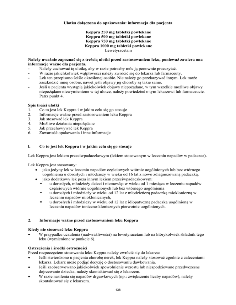 Ulotka dołączona do opakowania: informacja dla pacjenta Keppra 250 mg tabletki powlekane Keppra 500 mg tabletki powlekane Keppra 750 mg tabletki powlekane Keppra 1000 mg tabletki powlekane Lewetyracetam Należy uważnie zapoznać się z treścią ulotki przed zastosowaniem leku, ponieważ zawiera ona informacje ważne dla pacjenta. Należy zachować tę ulotkę, aby w razie potrzeby móc ją ponownie przeczytać. W razie jakichkolwiek wątpliwości należy zwrócić się do lekarza lub farmaceuty. Lek ten przepisano ściśle określonej osobie. Nie należy go przekazywać innym. Lek może zaszkodzić innej osobie, nawet jeśli objawy jej choroby są takie same. Jeśli u pacjenta wystąpią jakiekolwiek objawy niepożądane, w tym wszelkie możliwe objawy niepożądane niewymienione w tej ulotce, należy powiedzieć o tym lekarzowi lub farmaceucie. Patrz punkt 4. Spis treści ulotki 1. Co to jest lek Keppra i w jakim celu się go stosuje 2. Informacje ważne przed zastosowaniem leku Keppra 3. Jak stosować lek Keppra 4. Możliwe działania niepożądane 5. Jak przechowywać lek Keppra 6. Zawartość opakowania i inne informacje l. Co to jest lek Keppra i w jakim celu się go stosuje Lek Keppra jest lekiem przeciwpadaczkowym (lekiem stosowanym w leczeniu napadów w padaczce). Lek Keppra jest stosowany: jako jedyny lek w leczeniu napadów częściowych wtórnie uogólnionych lub bez wtórnego uogólnienia u dorosłych i młodzieży w wieku od 16 lat z nowo zdiagnozowaną padaczką. jako dodatkowy lek poza innym lekiem przeciwpadaczkowym: u dorosłych, młodzieży dzieci i niemowląt w wieku od 1 miesiąca w leczeniu napadów częściowych wtórnie uogólnionych lub bez wtórnego uogólnienia u dorosłych i młodzieży w wieku od 12 lat z młodzieńczą padaczką miokloniczną w leczeniu napadów mioklonicznych, u dorosłych i młodzieży w wieku od 12 lat z idiopatyczną padaczką uogólnioną w leczeniu napadów toniczno-klonicznych pierwotnie uogólnionych. 2. Informacje ważne przed zastosowaniem leku Keppra Kiedy nie stosować leku Keppra W przypadku uczulenia (nadwrażliwości) na lewetyracetam lub na którykolwiek składnik tego leku (wymienione w punkcie 6). Ostrzeżenia i środki ostrożności Przed rozpoczęciem stosowania leku Keppra należy zwrócić się do lekarza: Jeśli stwierdzono u pacjenta chorobę nerek, lek Keppra należy stosować zgodnie z zaleceniami lekarza. Lekarz może podjąć decyzję o dostosowaniu dawkowania. Jeśli zaobserwowano jakiekolwiek spowolnienie wzrostu lub niespodziewane przedwczesne dojrzewanie dziecka, należy skontaktować się z lekarzem. W razie nasilenia się napadów drgawkowych (np.: zwiększenie liczby napadów), należy skontaktować się z lekarzem. 138 U niektórych pacjentów leczonych lekami przeciwpadaczkowymi, takimi jak Keppra, występowały myśli o samookaleczeniu lub myśli samobójcze.W przypadku objawów depresji i (lub) myśli samobójczych, należy skontaktować się z lekarzem. Keppra a inne leki Należy powiedzieć lekarzowi lub farmaceucie o wszystkich przyjmowanych ostatnio lekach, również tych, które wydawane są bez recepty. Stosowanie leku Keppra z jedzeniem, piciem i alkoholem Lek Keppra można przyjmować z posiłkiem lub bez posiłku. Ze względów bezpieczeństwa podczas przyjmowania leku Keppra nie należy pić alkoholu. Ciąża i karmienie piersią Przed zastosowaniem jakiegokolwiek leku należy poradzić się lekarza lub farmaceuty. Należy poinformować lekarza jeżeli pacjentka jest lub może być w ciąży. Lek Keppra nie powinien być stosowany w ciąży, jeżeli nie jest to bezwzględnie konieczne. Nie można całkowicie wykluczyć ryzyka wad wrodzonych u płodu. W badaniach na zwierzętach lek Keppra podawany w dawkach większych niż stosowane w celu kontroli napadów drgawkowych, wykazał niepożądany wpływ na rozrodczość. Podczas leczenia nie zaleca się karmienia piersią. Prowadzenie pojazdów i obsługiwanie maszyn Lek Keppra może zaburzać zdolność prowadzenia pojazdów i obsługiwania narzędzi lub maszyn, gdyż stosowanie leku Keppra może powodować senność. Jest to bardziej prawdopodobne na początku leczenia lub po zwiększeniu dawki leku. Nie zaleca się prowadzenia pojazdów i obsługi maszyn, dopóki nie jest znany wpływ leku na zdolność pacjenta do wykonywania tych czynności. Tabletki Keppra 750 mg zawierają żółcień pomarańczową FCF lak glinowy ( E110) Barwnik żółcień pomarańczowa FCF lak glinowy (E 110) może wywoływać reakcję alergiczną. Tabletki leku Keppra o innej mocy nie zawierają tego składnika. 3. Jak stosować lek Keppra Ten lek należy zawsze stosować zgodnie z zaleceniami lekarza. W razie wątpliwości należy zwrócić się do lekarza lub farmaceuty. Lek Keppra musi być przyjmowany dwa razy na dobę, rano i wieczorem, mniej więcej o tej samej porze każdego dnia. Należy przyjmować liczbę tabletek zgodną z zaleceniemi lekarza. Monoterapia Dawka u dorosłych i młodzieży (w wieku od 16 lat): Zazwyczaj stosowana dawka: od 1000 mg do 3000 mg na dobę. Jeżeli pacjent przyjmuje lek po raz pierwszy, lekarz zaleci najpierw mniejszą dawkę przez 2 tygodnie, a dopiero potem najmniejszą zazwyczaj stosowaną dawkę. Przykładowo, jeśli dawka dobowa wynosi 1000 mg, można przyjmować 2 tabletki 250 mg rano i 2 tabletki 250 mg wieczorem. Leczenie wspomagające Dawka u dorosłych i młodzieży (w wieku od 12 do 17 lat) o masie ciała 50 kg lub powyżej: Zazwyczaj stosowana dawka: od 1000 mg do 3000 mg na dobę. Przykładowo, jeśli dawka dobowa wynosi 1000 mg, można przyjmować 2 tabletki 250 mg rano i 2 tabletki 250 mg wieczorem. 139 Dawka u niemowląt i dzieci (w wieku od 6 do 23 miesięcy), dzieci (w wieku od 2 do 11 lat) i młodzieży (w wieku od 12 do 17 lat) o masie ciała poniżej 50 kg: Lekarz zaleci najbardziej odpowiednią postać leku Keppra, w zależności od wieku, masy ciała i dawki. Lek Keppra 100 mg/ml roztwór doustny jest posta