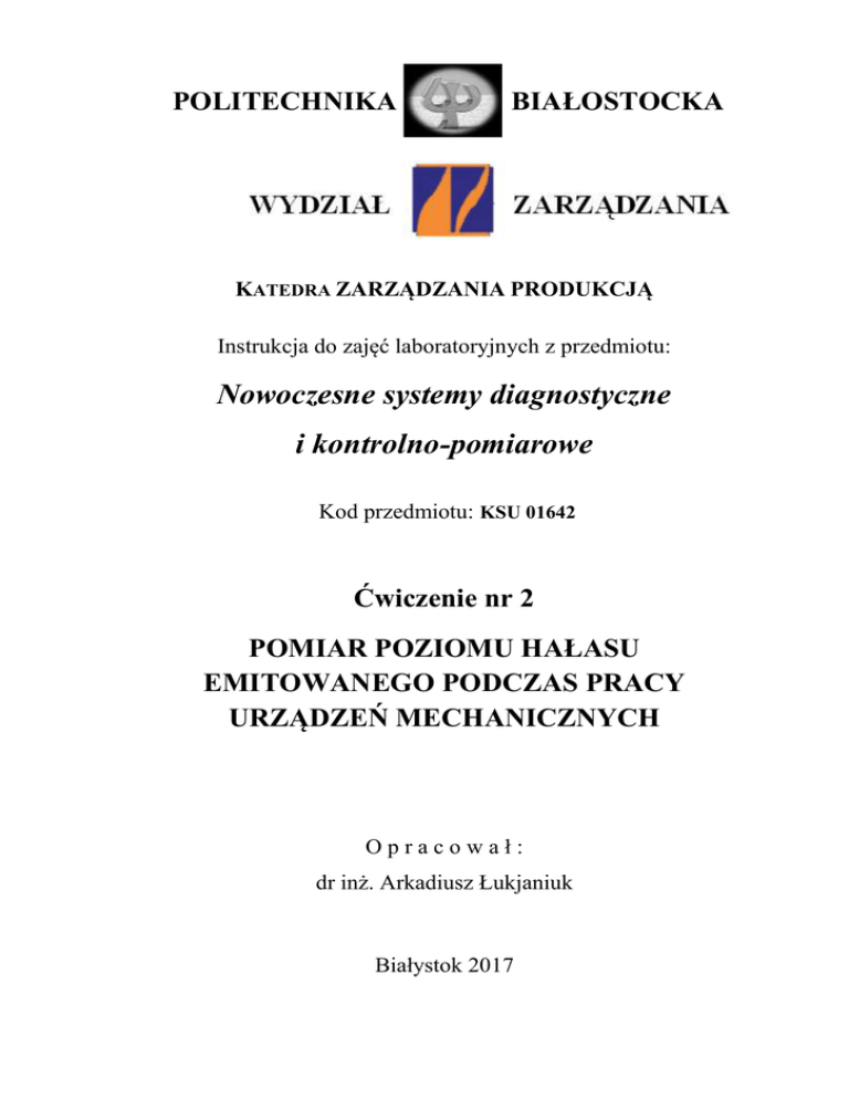 POLITECHNIKA BIAŁOSTOCKA KATEDRA ZARZĄDZANIA PRODUKCJĄ Instrukcja do zajęć laboratoryjnych z przedmiotu: Nowoczesne systemy diagnostyczne i kontrolno-pomiarowe Kod przedmiotu: KSU 01642 Ćwiczenie nr 2 POMIAR POZIOMU HAŁASU EMITOWANEGO PODCZAS PRACY URZĄDZEŃ MECHANICZNYCH Opracował: dr inż. Arkadiusz Łukjaniuk Białystok 2017 Wszystkie prawa zastrzeżone Wszystkie nazwy handlowe i towarów występujące w niniejszej instrukcji są znakami towarowymi zastrzeżonymi lub nazwami zastrzeżonymi odpowiednich firm odnośnych właścicieli. Laboratorium „Nowoczesne systemy diagnostyczne i kontrolno-pomiarowe” Ćw. Nr2 „Pomiar poziomu hałasu emitowanego podczas pracy urządzeń...” Strona 2 CEL ĆWICZENIA: Zapoznanie studentów z metodami i techniką pomiaru natężenia dźwięku, wpływem hałasu na organizm ludzki oraz opanowanie umiejętności pracy z miernikiem dźwięku SON-50 i poznanie jego możliwości pomiarowych. 1. PODSTAWY TEORETYCZNE Dźwięk jest zjawisko falowe wywołane drganiem cząstek dowolnego ośrodka sprężystego (powietrza, ciał stałych, cieczy…). Źródłem dźwięku są pracujące maszyny, instalacje wentylacyjne, środki transportu, ludzie, itp. Dźwięk, który ze względu na poziom, charakter, miejsce i czas występowania, staje się uciążliwym lub szkodliwym nazywa się hałasem. Hałas o poziomie ustalonym - hałas, którego poziom dźwięku A w określonym miejscu zmienia się nie więcej niż o 5 dB. Hałas o poziomie nieustalonym - hałas, którego poziom dźwięku A w określonym miejscu zmienia się więcej niż o 5 dB. Hałas impulsowy – hałas, który składa się z jednego lub kilku impulsów dźwiękowych, z których każdy trwa nie dłużej niż 0,2s. Fale dźwiękowe (w zależności od konfiguracji źródła dźwięku) mogą być kuliste, płaskie lub cylindryczne i charakteryzują się następującymi parametrami; częstotliwością f w Hz; prędkością dźwięku c w m/s (zależna jest od ośrodka i rodzaju ośrodka drgającego – w powietrzu c 340m/s); długością fali w m: c f . Ze względu na częstotliwość i długość fali dźwięki dzielą się na: infradźwięki (niesłyszalne dla ucha ludzkiego) o częstotliwości f < 16Hz (>21m -wytwarzane przez ciężkie pojazdy samochodowe, samoloty, sprężarki tłokowe, turbozespoły, rurociągi, itp.); dźwięki słyszalne o zakresie częstotliwości: 16<f<20000Hz i długości fali: 0,017< <21m; ultradźwięki (niesłyszalne dla ucha ludzkiego) o częstotliwości f>20000Hz ( <0,017m – źródło: aparatura rehabilitacyjna, ultradźwiękowa aparatura diagnostyczna i pomiarowa, aparatura medyczna, itp.) Każde źródło dźwięków charakteryzuje się mocą akustyczną (Lp w dB – jest to ilość energii jaką wysyła źródło dźwięku w jednostce czasu). Laboratorium „Nowoczesne systemy diagnostyczne i kontrolno-pomiarowe” Ćw. Nr2 „Pomiar poziomu hałasu emitowanego podczas pracy urządzeń...” Strona 3 Natomiast ciśnienie akustyczne (pa w Pa) jest różnica pomiędzy chwilową wartością ciśnienia powstałego w określonym punkcie pola pod działaniem fal akustycznych, a wartością ciśnienia statycznego. Poziom mocy akustycznej L’p: Lp 10 lg p 'a p 'o dB , (1) gdzie: p’a - moc akustyczna źródła w W; -12 p’o - moc akustyczna odniesienia (po=10 W) zbliżona do progu słyszalności. Poziomu natężenia dźwięku LJ: LJ 10 lg J [dB] , Jo (2) -12 2 gdzie: Jo - natężenie dźwięku odniesienia, (Jo=10 W/m ). W praktyce pomiarowej poziom ciśnienia akustycznego oblicza się ze wzoru: L p 20 lg pa [dB] , po (3) gdzie: pa - ciśnienie akustyczne w Pa; -5 po - ciśnienie akustyczne odniesienia (po=2·10 Pa). Wartość ciśnienia akustycznego wytworzonego przez punktowe źródło dźwięku zmienia się w zależności od odległości r od źródła: pa 1 r Pc 2 , (4) gdzie: P – amplituda ciśnienia akustycznego; ρ – gęstość ośrodka; c – prędkość rozchodzenia się fali akustycznej w ośrodku. Na rys.1 przedstawiony jest rozkład ciśnienia akustycznego w funkcji odległości od źródła. Wielkość pola bliskiego zależy od częstotliwości, rozmiarów źródła i stosunków fazowych jego powierzchni promieniujących. W polu swobodnym dominuje energetycznie sygnał ze źródła dźwięku i spełnione jest prawo odwrotnej proporcjonalności. Z powodu nakładania się fal odbitych od powierzchni ograniczających źródło - pole to istnieje tylko w niewielkiej odległości od źródła. W obszarze pola pogłosowego występują fluktuacje ciśnienia akustycznego wynikające z interferencji fali Laboratorium „Nowoczesne systemy diagnostyczne i kontrolno-pomiarowe” Ćw. Nr2 „Pomiar poziomu hałasu emitowanego podczas pracy urządzeń...” Strona 4 bezpośredniej i fal odbitych, a wartość ciśnienia akustycznego zmienia się nieznacznie z odległością od źródła. Rys. 1. Rozkład ciśnienia akustycznego w zależności od odległości od źródła dźwięku. Istnieją dwa różne podejścia dla określenia poziomu mocy akustycznej źródła: przeprowadzać pomiary w strefie, gdzie dominuje pole swobodne i gdzie jest słaby wpływ pola pogłosowego (dźwięki odbite od ścian pomieszczenia i jego wyposażenia) oraz uwzględnić korektę (poprawkę) środowiskową tła; przeprowadzać pomiary w strefie, w której dominuje pole pogłosowe, czyli z daleka od źródła. W obydwu przypadkach charakterystyki środowiska badawczego wpływają wyraźnie na dokładność pomiaru poziomu mocy akustycznej. W pierwszej metodzie poziom mocy akustycznej maszyny wyznacza się na zasadzie próbkowania pola akustycznego w sąsiedztwie źródła we wszystkich kierunkach, a przetworniki umieszczone są na powierzchni otaczającej źródło mierzą: ciśnienie akustyczne – jest to metoda zwana „klasyczną” i używa się do tego celu zwykłe mikrofony; natężenie dźwięku - sondy z dwoma mikrofonami, wyznaczające natężenie dźwięku w punkcie, w kt