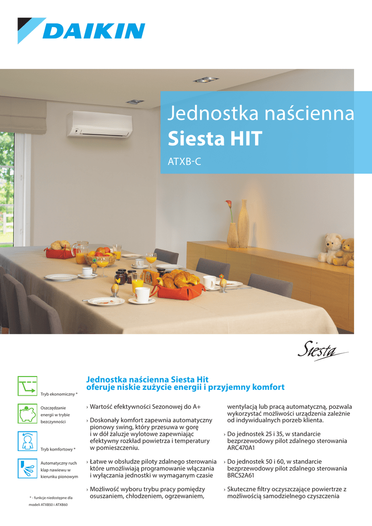 Jednostka naścienna Siesta HIT ATXB-C Tryb ekonomiczny * Oszczędzanie energii w trybie bezczynności Tryb komfortowy * Automatyczny ruch klap nawiewu w kierunku pionowym * - funkcje niedostępne dla modeli ATXB50 i ATXB60 Jednostka naścienna Siesta Hit oferuje niskie zużycie energii i przyjemny komfort ›› Wartość efektywności Sezonowej do A+ wentylacją lub pracą automatyczną, pozwala wykorzystać możliwości urządzenia zależnie od indywidualnych porzeb klienta. ›› Doskonały komfort zapewnia automatyczny pionowy swing, który przesuwa w gorę i w dół żaluzje wylotowe zapewniając efektywny rozkład powietrza i temperatury w pomieszczeniu. ›› Do jednostek 25 i 35, w standarcie bezprzewodowy pilot zdalnego sterowania ARC470A1 ›› Łatwe w obsłudze piloty zdalnego sterowania które umożliwiają programowanie włączania i wyłączania jednostki w wymaganym czasie ›› Do jednostek 50 i 60, w standarcie bezprzewodowy pilot zdalnego sterowania BRC52A61 ›› Możliwość wyboru trybu pracy pomiędzy osuszaniem, chłodzeniem, ogrzewaniem, ›› Skuteczne filtry oczyszczające powiertrze z możliwością samodzielnego czyszczenia ATXB-C + ARXB-C ARC470A1 ATXB25-35C2V1B_R Jednostka wewnętrzna Wymiary Jednostka Wys. x Szer. x Głęb. Obudowa Kolor Poziom mocy Chłodzenie akustycznej Ogrzewanie Poziom ciśnienia Chłodzenie B.wys. / Wys. / Niski / Cicha praca akustycznego Grzanie B.wys. / Wys. / Niski / Cicha praca Syst. kontroli Pilot na podczerwień ATXB mm dBA dBA dBA dBA Dane dotyczące efektywności ATXB + ARXB kW Wydajność chłodnicza Min./Nom./Maks. kW Wydajność grzewcza Min./Nom./Maks. kW Pobór mocy Chłodzenie Min./Nom./Maks. kW Grzanie Min./Nom./Maks. Sprawność Chłodzenie Klasa efektywności energetycznej sezonowa (według kW Pdesign EN14825) Wartość SEER kWh Roczne zużycie energii Ogrzewanie Klasa efektywności energetycznej (przeciętne kW Pdesign warunki Wartość SCOP klimatyczne) kWh Roczne zużycie energii Efektywność EER nominalna COP kWh Rocz. zużycie ener. Etykieta Chłodzenie energetyczna Grzanie Jednostka zewnętrzna Wymiary Jednostka Poziom mocy Chłodzenie akustycznej Ogrzewanie Poziom ciśnienia Chłodzenie akustycznego Grzanie Zakres pracy Chłodzenie Ogrzewanie Czynnik Typ chłodniczy Ilość Zasilanie Wys. x Szer. x Głęb. Wysoki/Nom. Wysoki/Nom. Temp. Min.~Maks. Temp. Min.~Maks. GWP Faza / Częstotliwość / Napięcie 25C 35C 50C 283x770x216 55 55 -/40/26/21 -/40/28/25 ARC470A1 2.50 5.93 148 3.30 6.02 192 2.40 4.01 838 3.25 4.01 385 2.80 4.04 970 3.21 3.71 514 60 61 46/47/- kg TCO₂eq 0.74 1.5 55 A+ 62 62 48/48/- 1.0 2.1 Hz / V 46/43/37/33 46/43/37/33 - 50C + 50C 1.630/5.480/6.200 1.170/5.620/6.600 0.280/1.700/1.910 0.240/1.500/1.880 60C + 60C 1.750/6.230/6.500 1.200/6.400/7.100 0.280/1.931/2.000 0.240/1.680/2.000 5.48 5.93 324 6.23 6.09 359 3.64 4.27 1,195 3.22 3.75 851 3.80 4.06 1,311 3.23 3.81 964 A+ A A 35C 550x658x275 61 - 44/40/35/32 44/40/35/32 35C + 35C 1.3/3.3/3.8 1.3/3.5/4.8 0.290/1.030/1.300 0.290/0.940/1.290 25C 60C 310x1,065x224 Biały 58 58 -/41/27/23 -/41/29/26 25C + 25C 1.3/2.5/3.0 1.3/2.8/4.0 0.310/0.770/1.050 0.250/0.700/1.110 ARXB mm dBA dBA dBA dBA °CDB °CWB ARXB25-35C 50C 64 -10~46 -15~18 R-410A 2,087.5 1~ / 50 / 220-240 60C 753x855x328 -/51 -/51 65 1.45 3.0 - Doskonały komfort dla Ciebie - dzięki Daikin dostosowujesz klimat do swoich indywidualnych potrzeb - Niski poziom głośności - poziom cisnienia akustycznego w opcji Cichej pracy to tylko 21dBA, to zapewnia spokojny sen - Łatwe sterowanie urządzeniem- intuicyjne oprogramowanie pilota ułatwia jego obsługę - Czyste powietrze w pomieszczeniu- tytanowo-apatytowy filtr powietrza usuwa cząstki kurzu i elimunuje zapachy Daikin Europe N.V. Naamloze Vennootschap · Zandvoordestraat 300 · 8400 Oostende · Belgium · www.daikin.eu · BE 0412 120 336 · RPR Oostende (Responsible Editor) 02/17 Niniejsza broszura została przygotowana w formie informacyjnej i nie stanowi oferty prawomocnej Daikin Europe N.V.. Zawartość broszury powstała dzięki wiedzy Daikin Europe N.V. Nie udzielamy pośredniej i bezpośredniej gwarancji na kompletność, dokładność, rzetelność lub stosowność treści, produktów i serwisu przedstawionych w niniejszym katalogu. Dane techniczne mogą ulec zmianie bez wcześniejszego powiadomienia. Daikin Europe N.V. nie ponosi odpowiedzialności za bezpośrednie lub pośrednie uszkodzenia, wynikające z lub związane z użyciem i/lub sposobem interpretacji niniejszej broszury. Firma Daikin Europe N.V. posiada prawa autorskie przedstawione w treści katalogu.