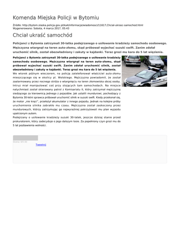 Komenda Miejska Policji w Bytomiu Źródło: http://bytom.slaska.policja.gov.pl/ka4/informacje/wiadomosci/11617,Chcial-ukrasc-samochod.html Wygenerowano: Sobota, 4 marca 2017, 05:43 Chciał ukraść samochód Policjanci z Bytomia zatrzymali 30-latka podejrzanego o usiłowanie kradzieży samochodu osobowego. Mężczyzna wtargnął na teren auto-złomu, skąd próbował wyjechać suzuki swift. Zanim zdołał uruchomić silnik, został obezwładniony i zakuty w kajdanki. Teraz grozi mu kara do 5 lat więzienia. Policjanci z Bytomia zatrzymali 30-latka podejrzanego o usiłowanie kradzieży samochodu osobowego. Mężczyzna wtargnął na teren auto-złomu, skąd próbował wyjechać suzuki swift. Zanim zdołał uruchomić silnik, został obezwładniony i zakuty w kajdanki. Teraz grozi mu kara do 5 lat więzienia. We wtorek późnym wieczorem, na policję zatelefonował właściciel auto-złomu mieszczącego się w okolicy pl. Wolskiego. Mężczyzna powiadomił, że został zaalarmowany przez nocnego stróża o wtargnięciu na teren złomowiska obcej osoby. Intruz miał manipulować coś przy stojących tam samochodach. Na miejsce natychmiast został skierowany patrol z Komisariatu II, który zatrzymał mężczyznę siedzącego za kierownicą jednego z pojazdów. Jak ustalili mundurowi, pochodzący z Bytomia 30-letni sprawca próbował uruchomić silnik w suzuki swift. Kiedy przekonał się, że motor „nie kręci”, przełożył akumulator z innego pojazdu. Jednak na kolejne próby uruchomienia silnika zabrakło mu czasu. Mężczyzna został zaskoczony przez mundurowych, którzy zatrzymując go najwyraźniej pokrzyżowali mu plan wyjazdu upatrzonym autem. Podejrzany o usiłowanie kradzieży suzuki 30-latek, jeszcze dzisiaj stanie przed prokuratorem, który zadecyduje o jego dalszym losie. Za popełniony czyn grozi mu do 5 lat pozbawienia wolności. Ocena: 0/5 (0) Tweetnij