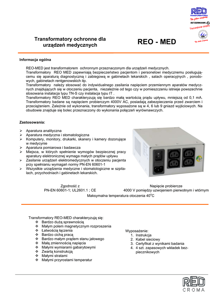 TRANSFORMATOREN pany ormer com Thetransf Transformatory ochronne dla urządzeń medycznych REO - MED Informacja ogólna REO-MED jest transformatorem ochronnym przeznaczonym dla urządzeń medycznych. Transformatory REO MED zapewniają bezpieczeństwo pacjentom i personelowi medycznemu posługującemu się aparaturą diagnostyczną i zabiegową w gabinetach lekarskich , salach operacyjnych , porodowych, gabinetach rentgenowskich itp. Transformatory należy stosować do indywidualnego zasilania napięciem przemiennym aparatów medycznych znajdujących się w otoczeniu pacjenta, niezależnie od tego czy w pomieszczeniu istnieje powszechnie stosowana instalacja typu TN-S czy instalacja typu IT . Transformatory REO MED charakteryzują się bardzo małą wartością prądu upływu, mniejszą od 0,1 mA. Transformatory badane są napięciem probierczym 4000V AC, posiadają zabezpieczenia przed zwarciem i przeciążeniem. Zależnie od wykonania, transformatory wyposażone są w 4, 6 lub 9 gniazd wyjściowych. Na obudowie znajduje się bolec przeznaczony do wykonania połączeń wyrównawczych. Zastosowania: Aparatura analityczna Aparatura medyczna i stomatologiczna Komputery, monitory, drukarki, skanery i kamery dozorujące w medycynie Aparatura pomiarowa i badawcza Miejsca, w których spełnienie wymogów bezpiecznej pracy aparatury elektronicznej wymaga małych prądów upływu Zasilanie urządzeń elektromedycznych w otoczeniu pacjenta przy spełnianiu wymagań normy PN-EN 60601-1 Wszystkie urządzenia medyczne i stomatologiczne w szpitalach, przychodniach i gabinetach lekarskich. Zgodność z Napięcie probiercze PN-EN 60601-1; UL2601.1 ; CE 4000 V pomiędzy uzwojeniem pierwotnym i wtórnym Maksymalna temperatura otoczenia 40oC Transformatory REO-MED charakteryzują się: Bardzo dużą sprawnością Małym polem magnetycznym rozproszenia Łatwością łączenia Bardzo cichą pracą Bardzo małym prądem stanu jałowego Małą zmiennością napięcia Małymi wymiarami gabarytowymi Zwartą konstrukcją Małymi stratami Małymi przyrostami temperatur Wyposażenie: 1. Instrukcja 2. Kabel sieciowy 3. Certyfikat z wynikami badania 4. 4 szt. zapasowych wkładek bezpiecznikowych REO CROMA ul. Pożaryskiego 28 04-703 WARSZAWA Tel. (22) 812 30 66; 8126182 Fax. (22) 815 69 06 E-Mail: [email protected] Dane techniczne Znamionowe napięcie zasilające 50/60 Hz Napięcie wyjściowe 50/60 Hz [V] [V] [ VA ] [mm] REO-MED 300 230 230 300 240x150x85 4 REO-MED 600 230 230 600 270x170x95 6 REO-MED 1000 230 230 1000 300x220x100 9 Typ Moc Wymiary [ głębokość x szerokość x wysokość ] Liczba gniazd wyjściowych Inne moce po uzgodnieniu Prąd upływu jest mniejszy od 100 µA Transformator ma wbudowane zabezpieczenie zwarciowe i przeciążeniowe Wyrównywanie potencjałów zgodnie z wymaganiami DIN 42801 Klasa ochronności I Maksymalna temperatura otoczenia 40oC Wytrzymała obudowa Połączenia wtykowe zgodne z EN 60320 Wyłącznik ON/OFF (Zał/Wył) Zabudowane filtry sieciowe spełniające wymagania kompatybilności elektromagnetycznej Ogranicznik prądu załączania Stopień ochrony IP20 Pokrycie lakierem w kolorze RAL 7035 Monitor Przykład zastosowania Urządzenie medyczne Spannung 100 0 150 50 Strom 200 5 250 0 300 40 A 60 30 Netz 10 50 V 70 20 80 10 0 % 100 90 Ausgang Ausgang DC-Spannung I DC-Spannung II L N DC-Spannung I + II PE Urządzenie medyczne DC-Strom Not - Aus Hauptschütz Ein Spannung Max Leuchtmelder Hauptschütz Hauptschütz Aus Spannung Min Umschaltung 600V 800V REO - Trenntransformator PRÜFTECHNIK Podlega modyfikacjom technicznym REO_MED_1_PL.doc Transformator separacyjny REO - MED REO_MED._PL/Strona 2 z 2