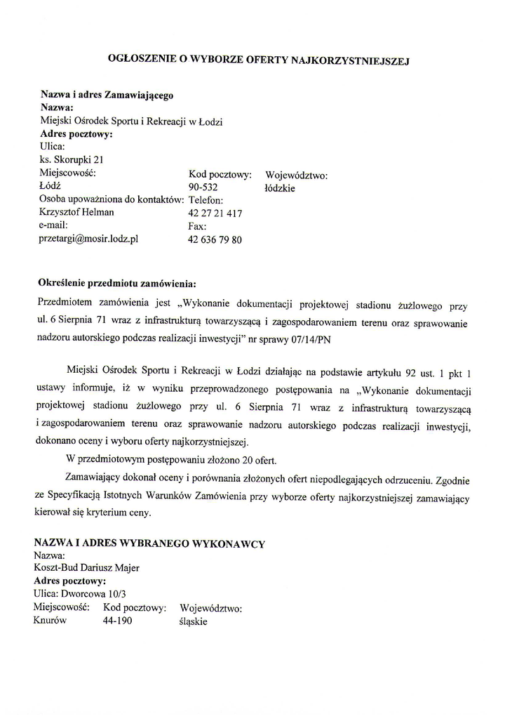 Ogłoszenie o wyborze oferty najkorzystniejszej